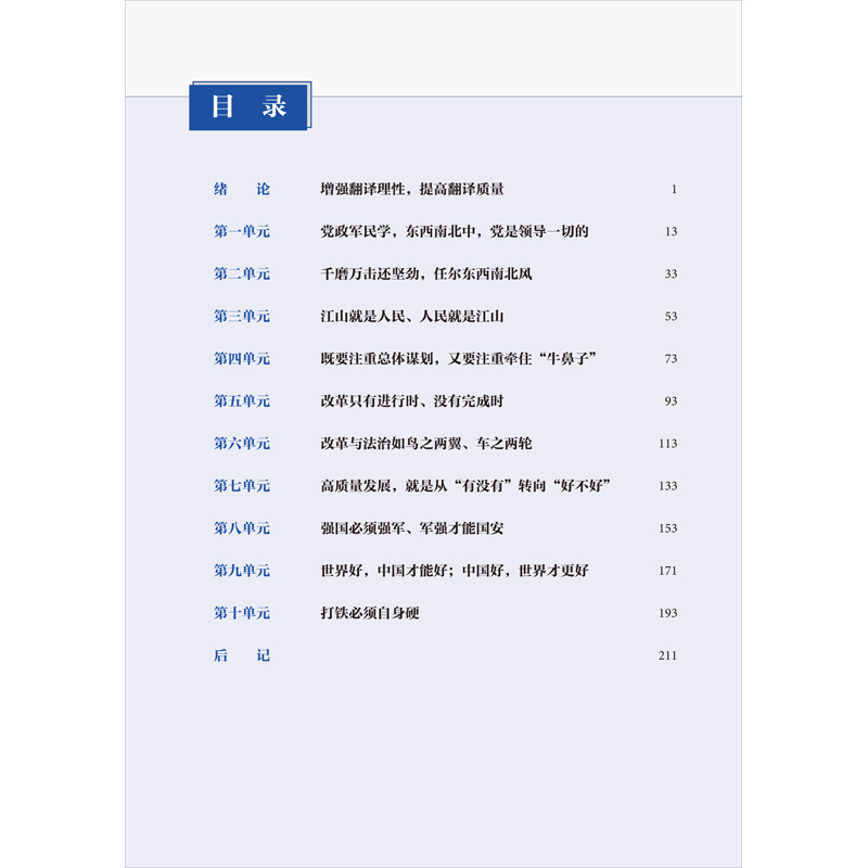 《高级汉德翻译教程》为高等学校外国语言文学类专业“理解当代中国”德语系列教材的一个分册,面向德语翻译硕士专业学位研究生和德语语言文学学术学位研究生。本书稿设计理念清晰,将习近平新时代中国特色社会主义思想的学习与翻译能力的训练相结合,从“核心概念”到“关键语句”,再到“文本试译”“译文评析”,输入的环节循序渐进、环环相扣,引导学生关注中国时政文献的特点和基本翻译原则,了解翻译的重点和难点,学会比较和判断译文高下,同时应用于自己的翻译实践中;“译文赏析”引导学生关注翻译质量;“课后练习”关注输出效果,通过研讨和较高强度的翻译训练提高学生实战能力。本书稿包括绪论和10个单元。绪论主要深入阐述中国时政文献的特点及翻译原则和方法。第一至第十单元所选材料主要来自《习近平谈治国理政》第一卷、第二卷、第三卷,《在庆祝中国共产党成立100周年大会上的讲话》和《中共中央关于党的百年奋斗重大成就和历史经验的决议》。每个单元探讨习近平新时代中国特色社会主义思想一个重要方面。