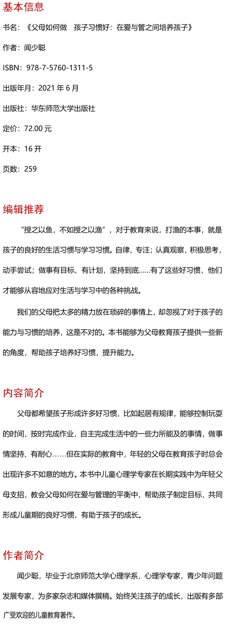 闻少聪,毕业于北京师范大学心理学系,心理学专家,青少年问题发展专家,为多家杂志和媒体撰稿。始终关注于孩子的成长事业,出版有多部广受欢迎的儿童教育著作,如《我家小孩不拖拉》、《我家小孩有点倔》等等。