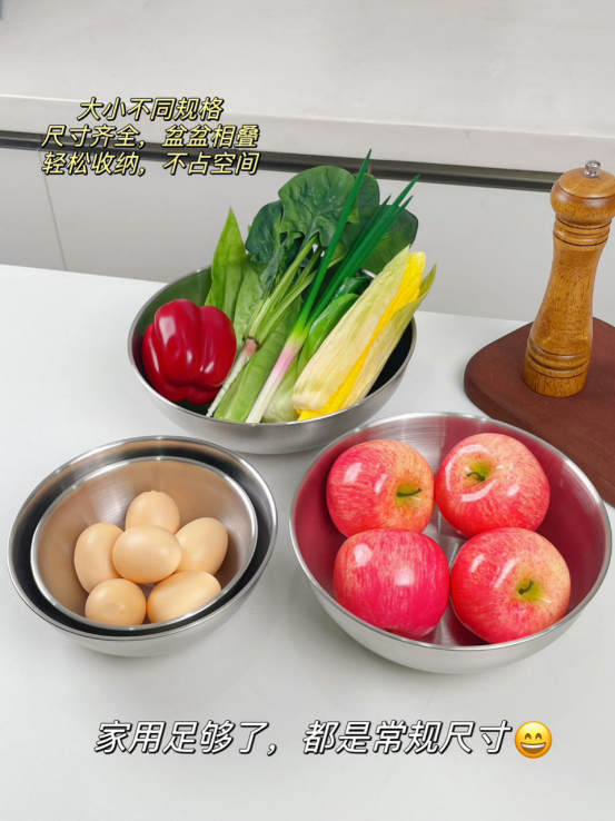 ✔优质不锈钢材质,耐腐蚀不易生锈 ✔加厚不锈钢,扛用耐摔不变形 ✔盆内哑光拉丝工艺,光滑无毛刺 ✔内置清晰刻度,方便度量 ✔盆壁加高防止飞溅 ✔大大小小适用多种场景,叠加收纳不占地