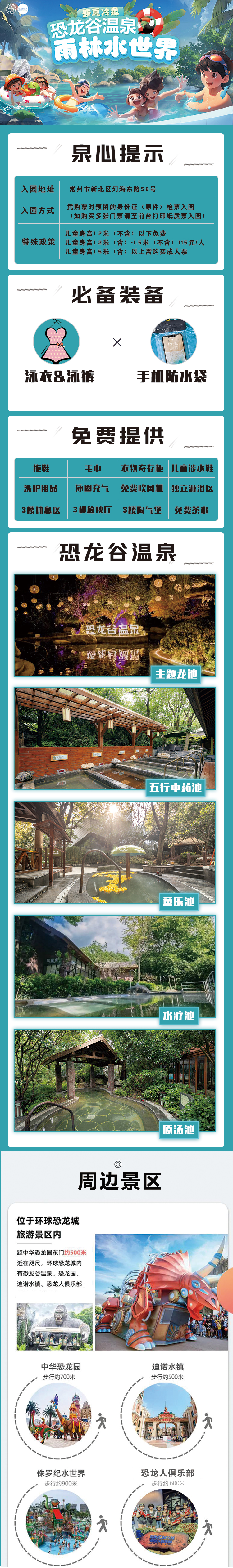 恐龙谷小部分泡池因调整检修适时关闭,具体开放详情见现场公告;泡温泉请着泳衣入汤池,自备或现场购买。