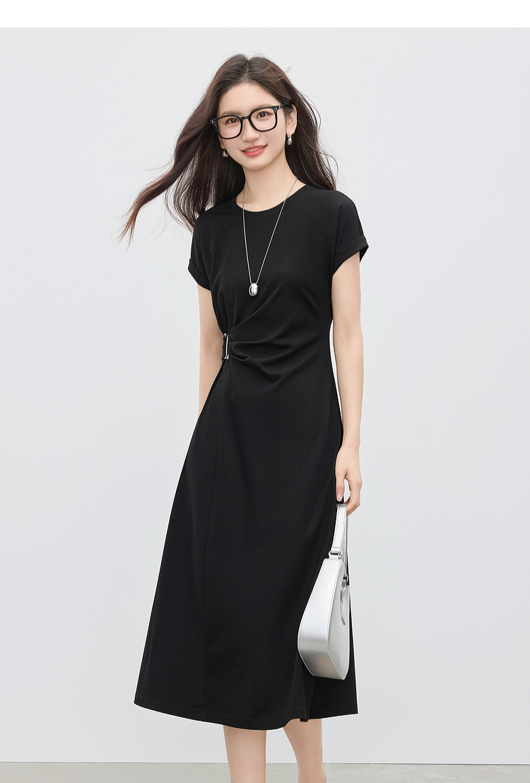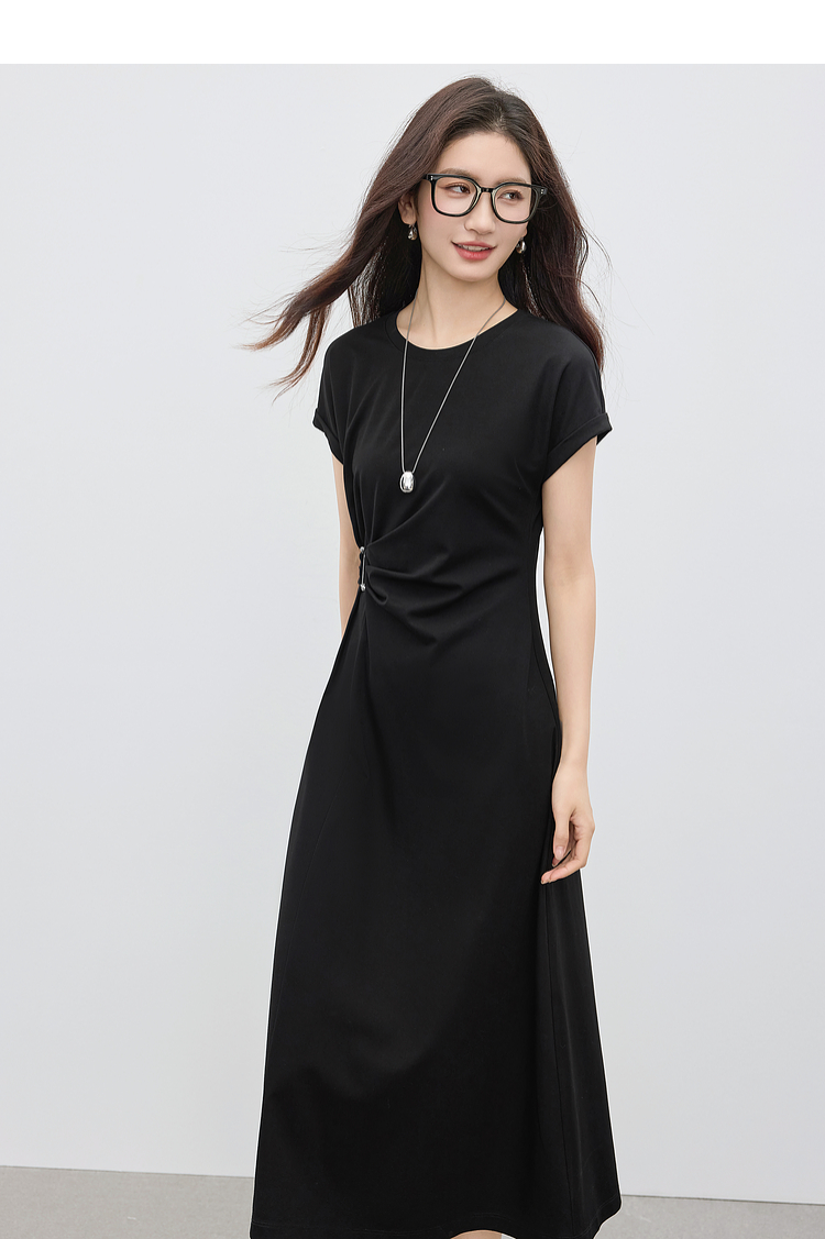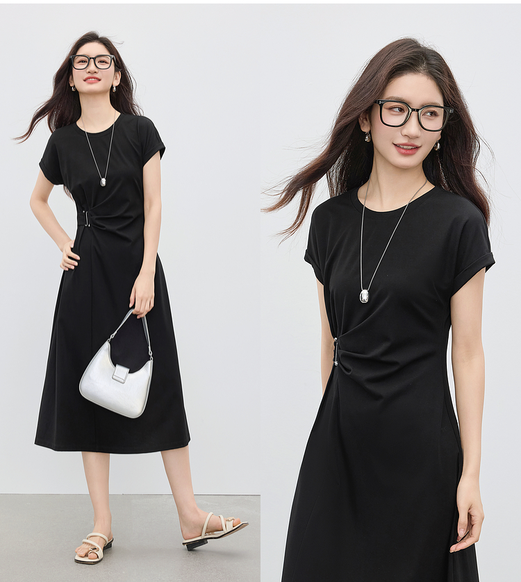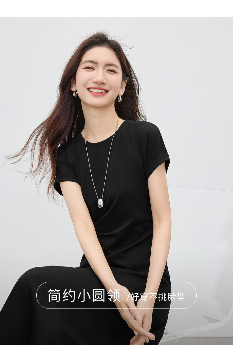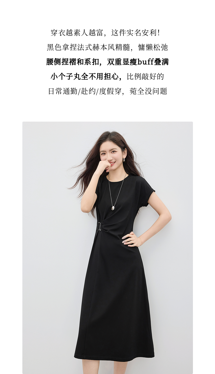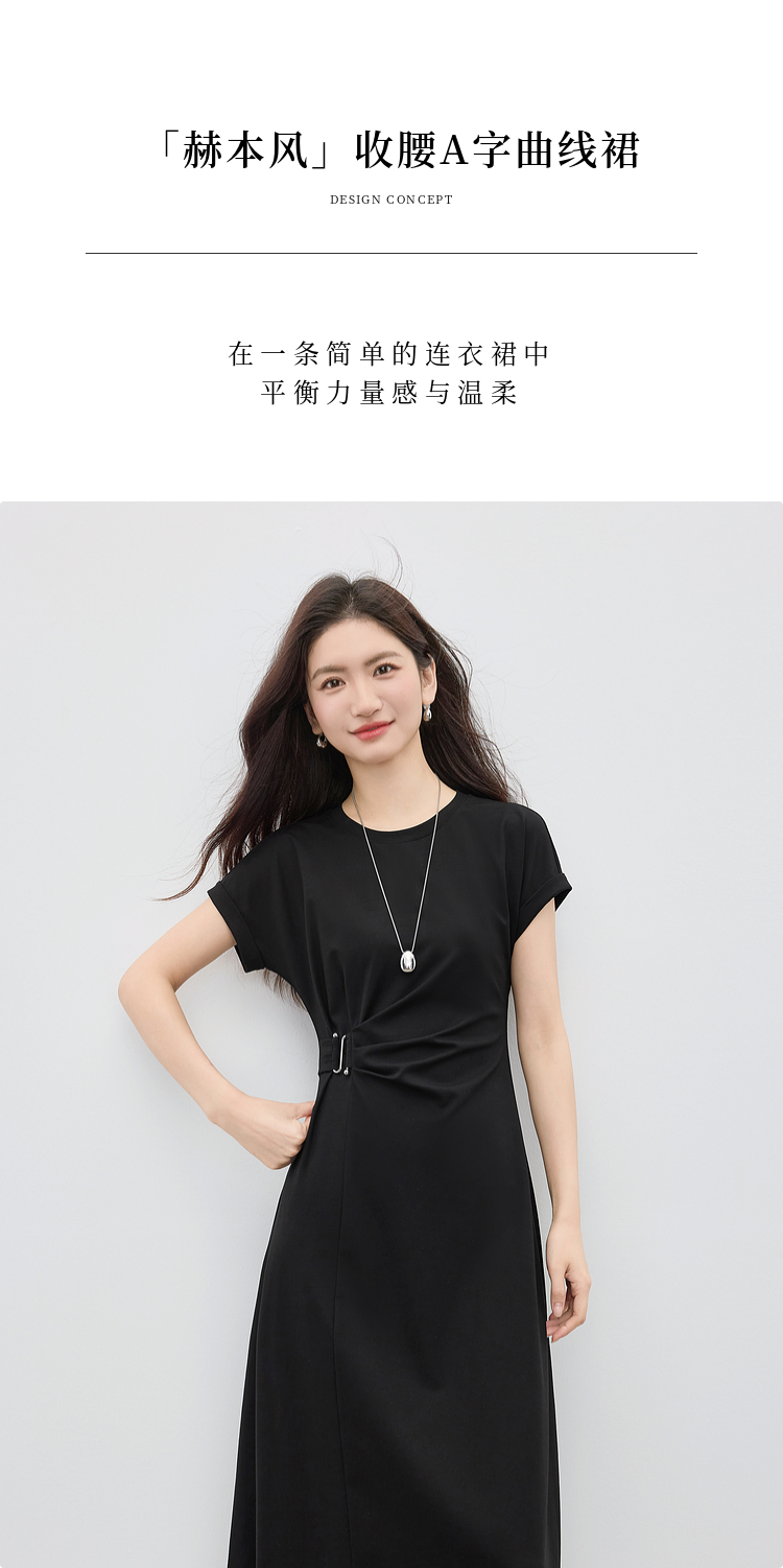 【专属特价】熙世界赫本风黑色t恤连衣裙女夏季2025新款小众设计收腰显瘦长裙