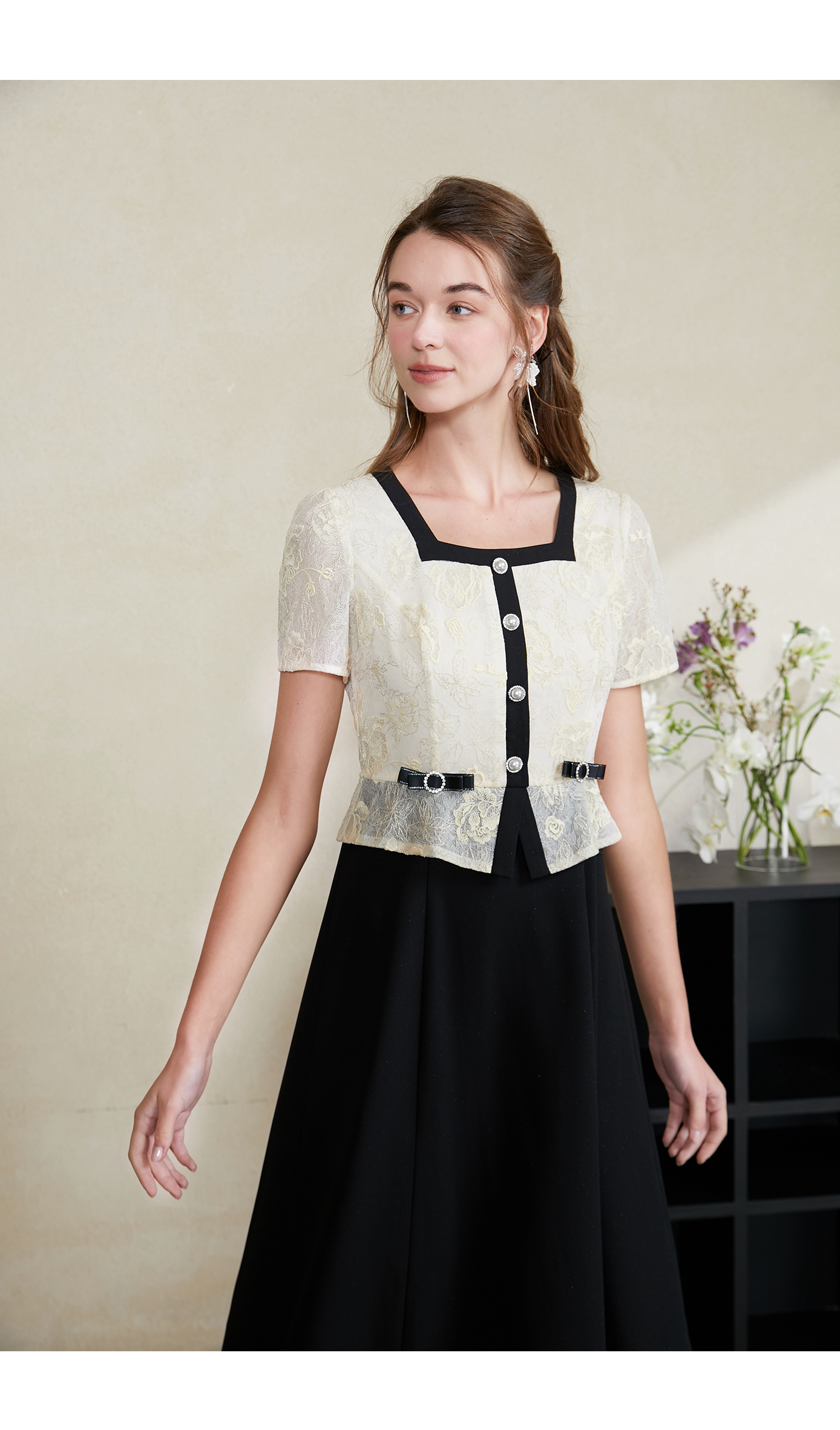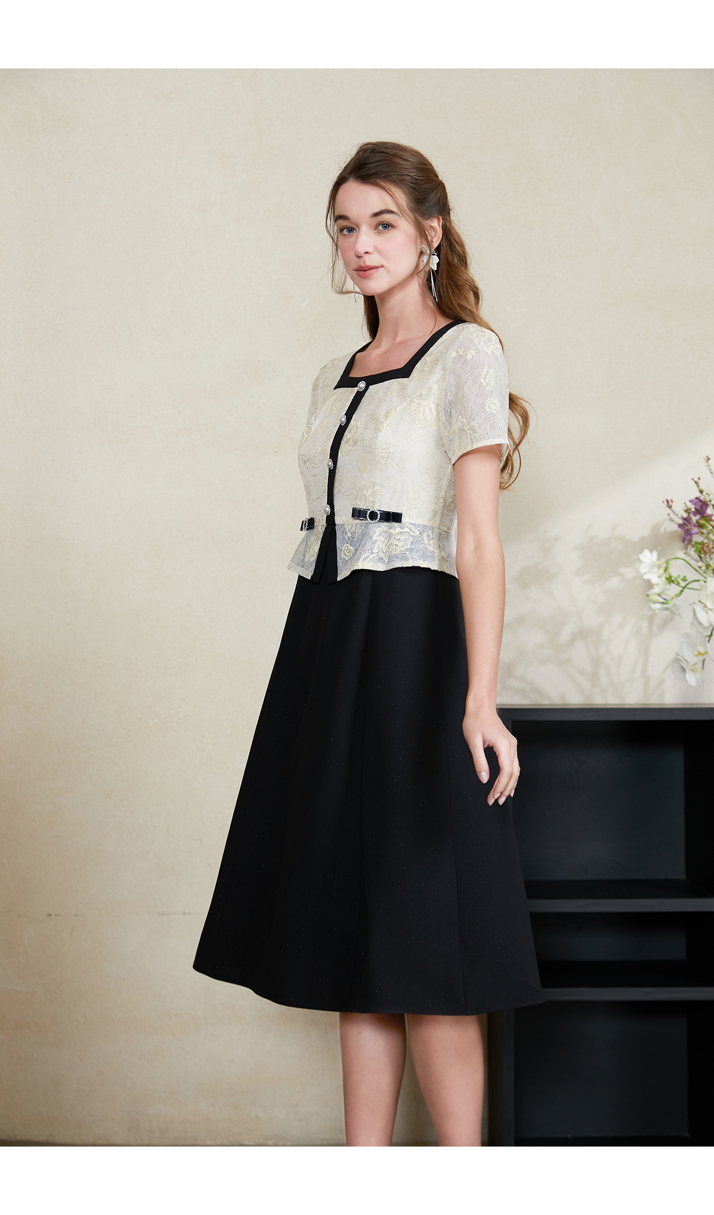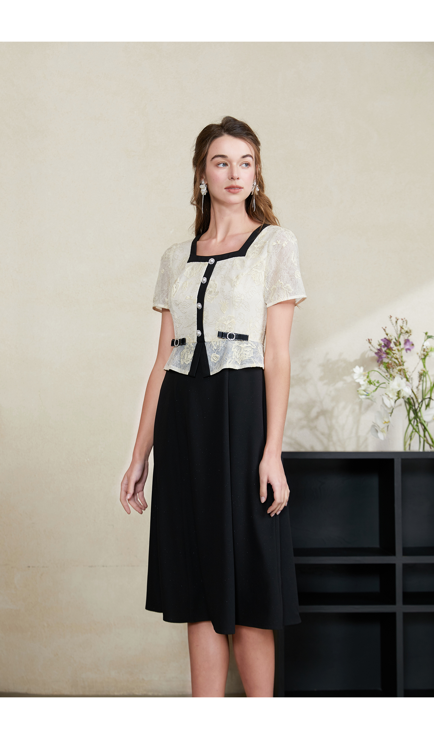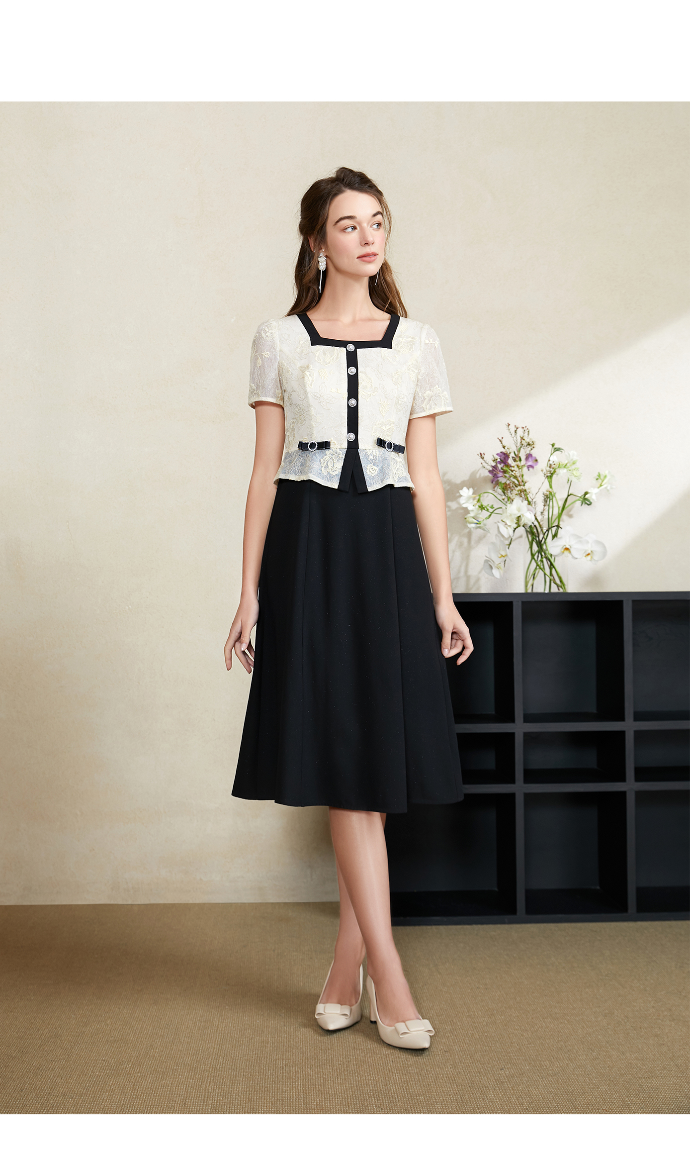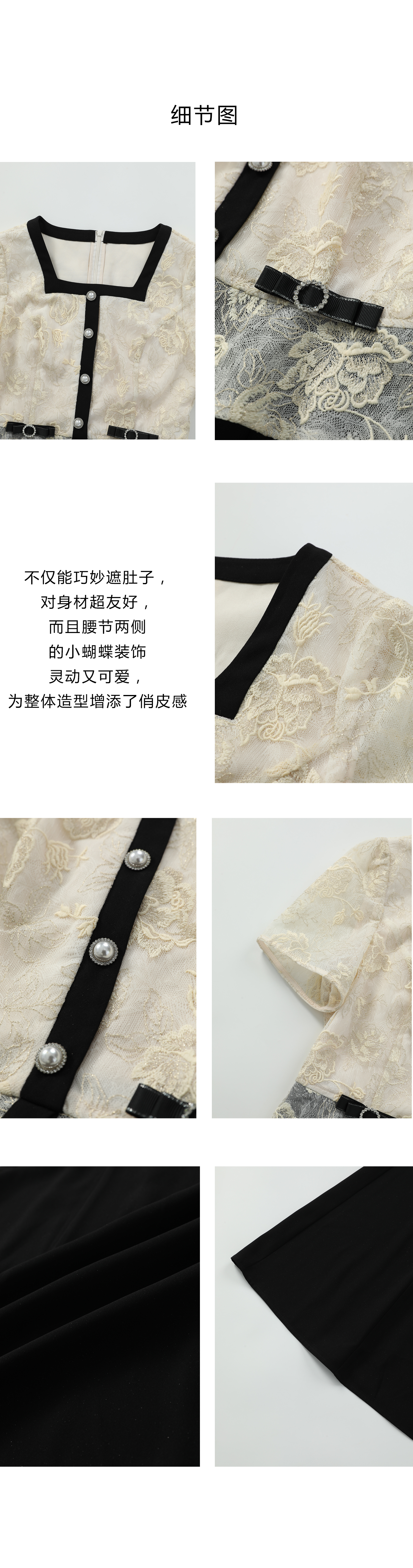 司歌收腰短袖绣花重工连衣裙过膝裙夏A911001X