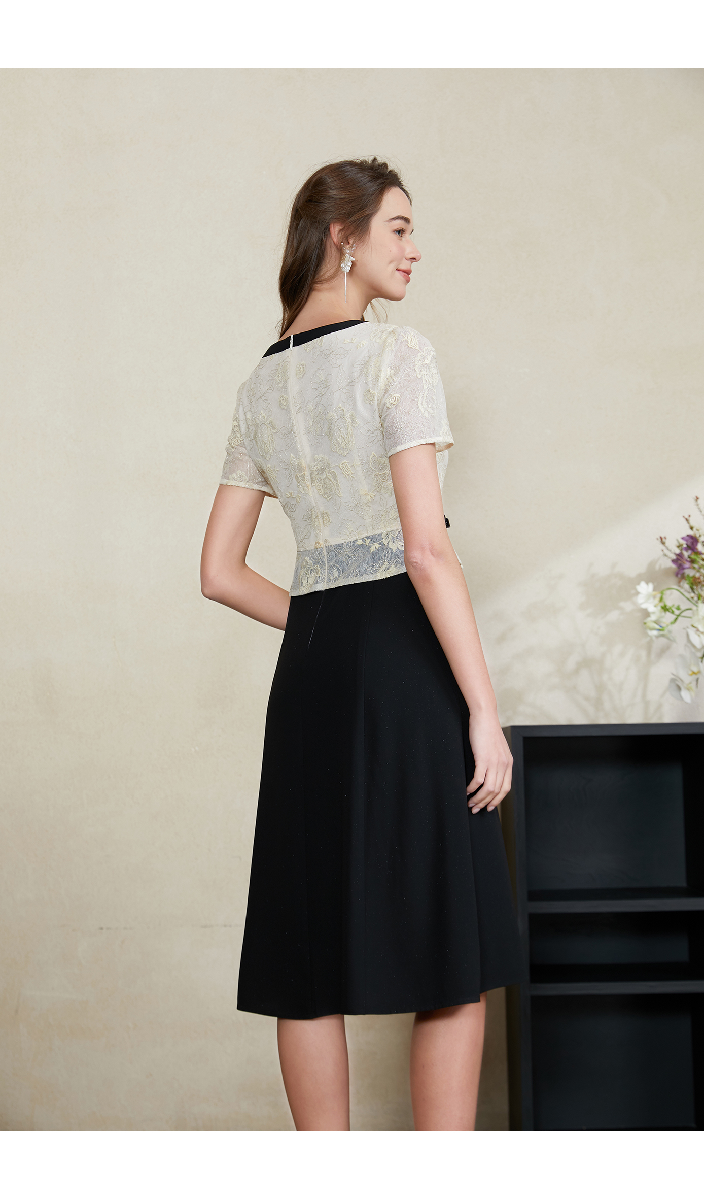 司歌v领网纱刺绣短袖收腰连衣裙A891464M