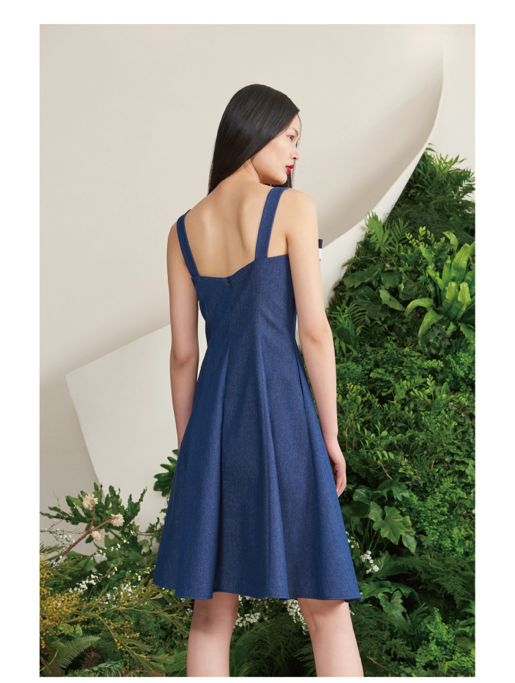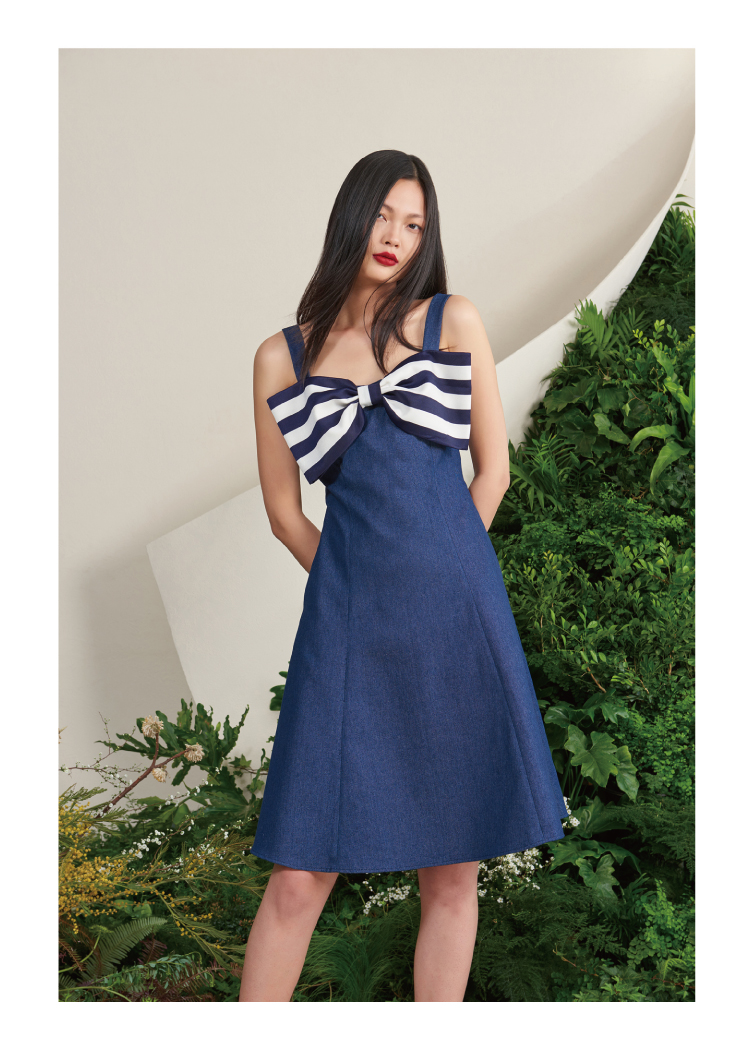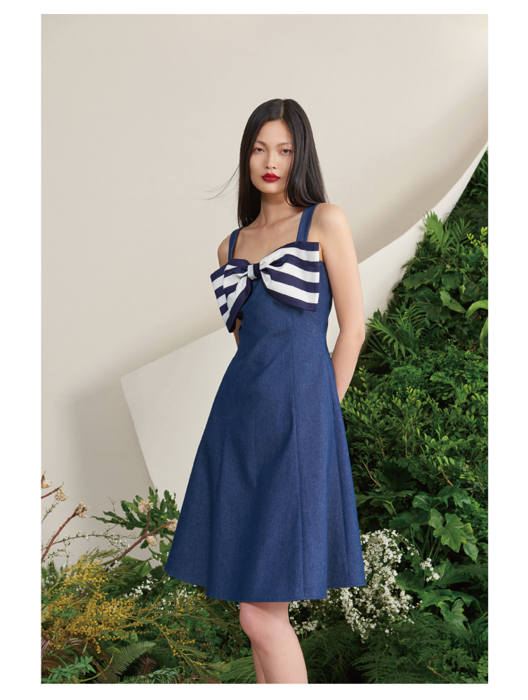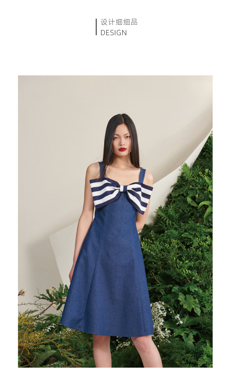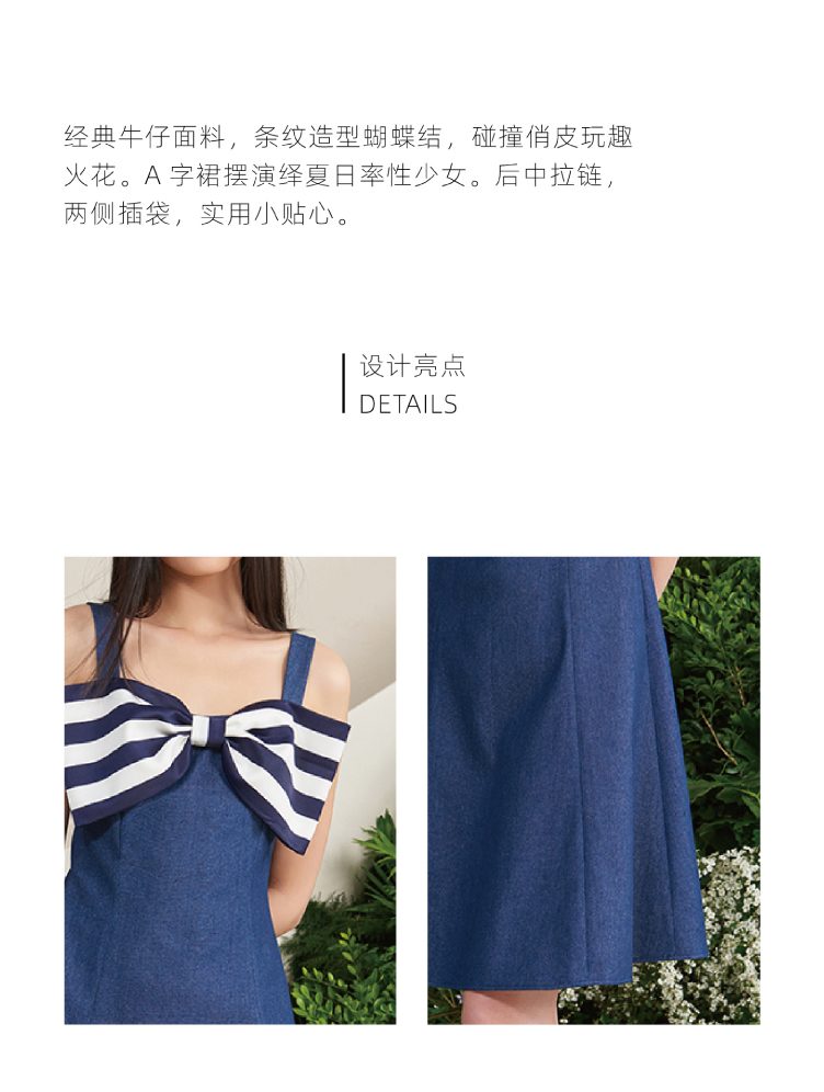 【木星冲浪手】蓝白条造型蝴蝶结吊带A字牛仔连衣裙/0000685