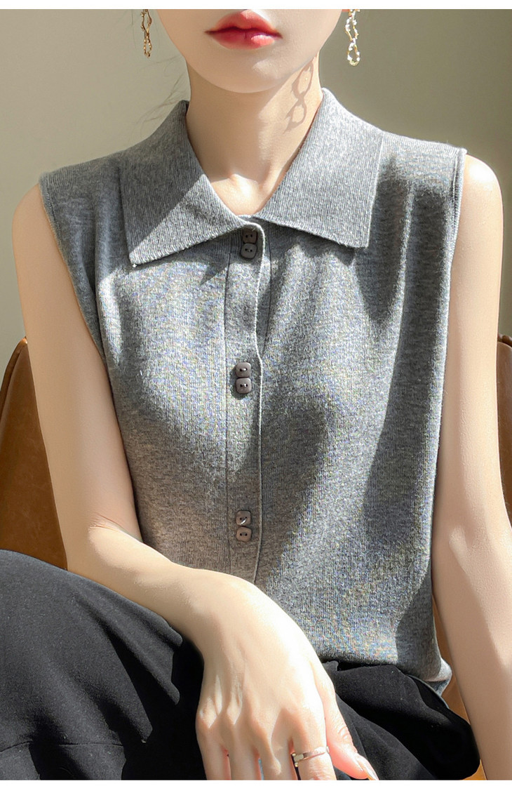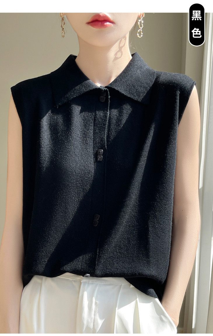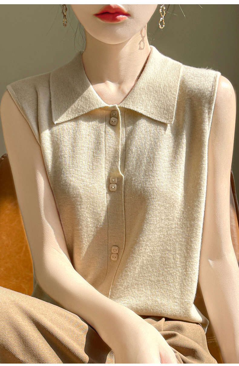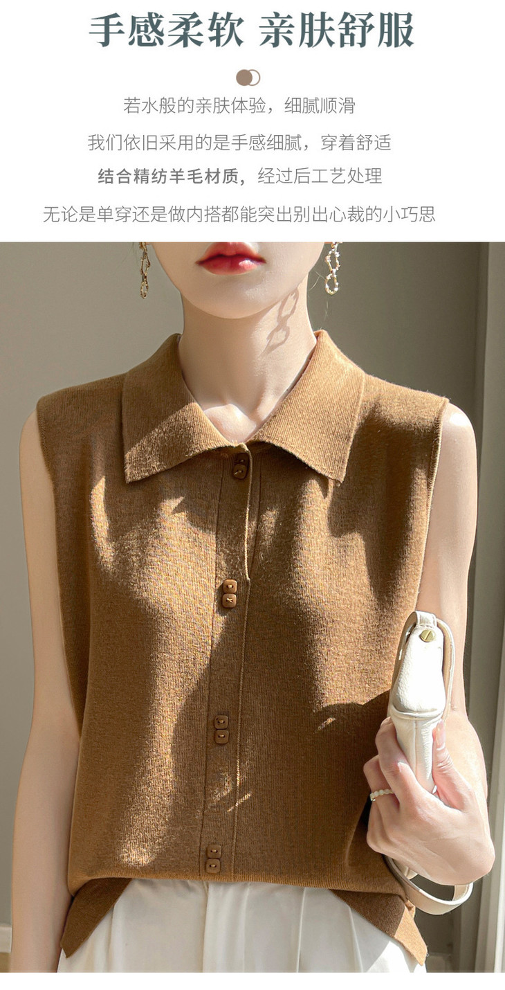 羊毛针织无袖T恤,Polo领精纺宽松纯色内搭上衣QH