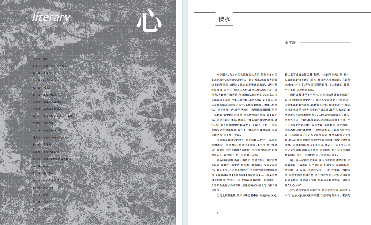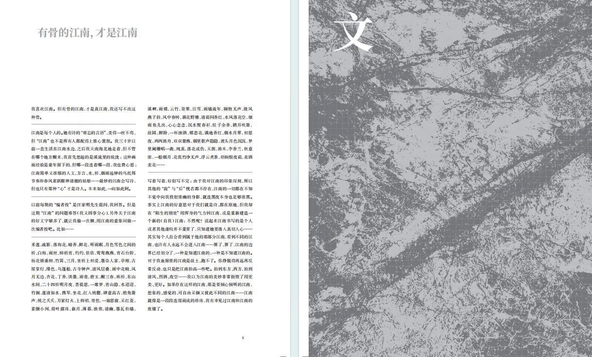 “文心”,该栏目包含金宇澄、朱青生、董强、陆灏、毛尖等文学家、艺术家的作品,用隽永的文字描绘他们心中的江南和他们与江南的故事。