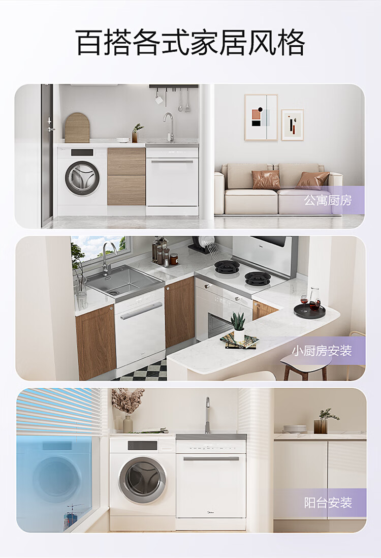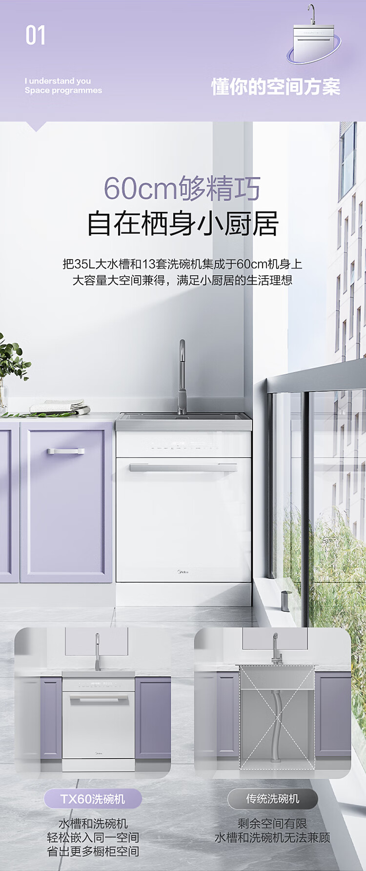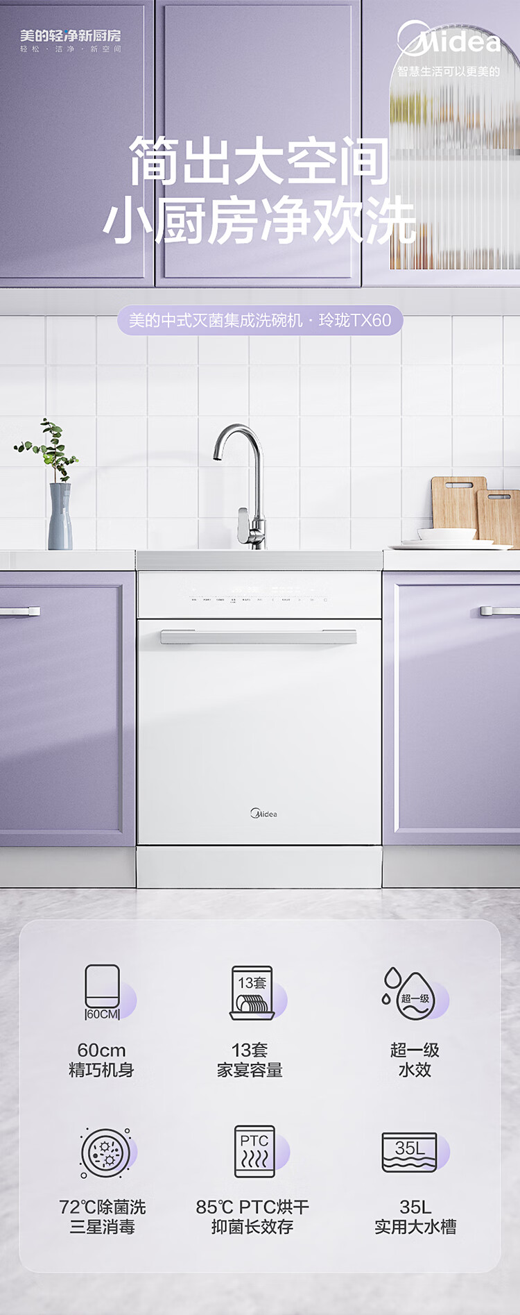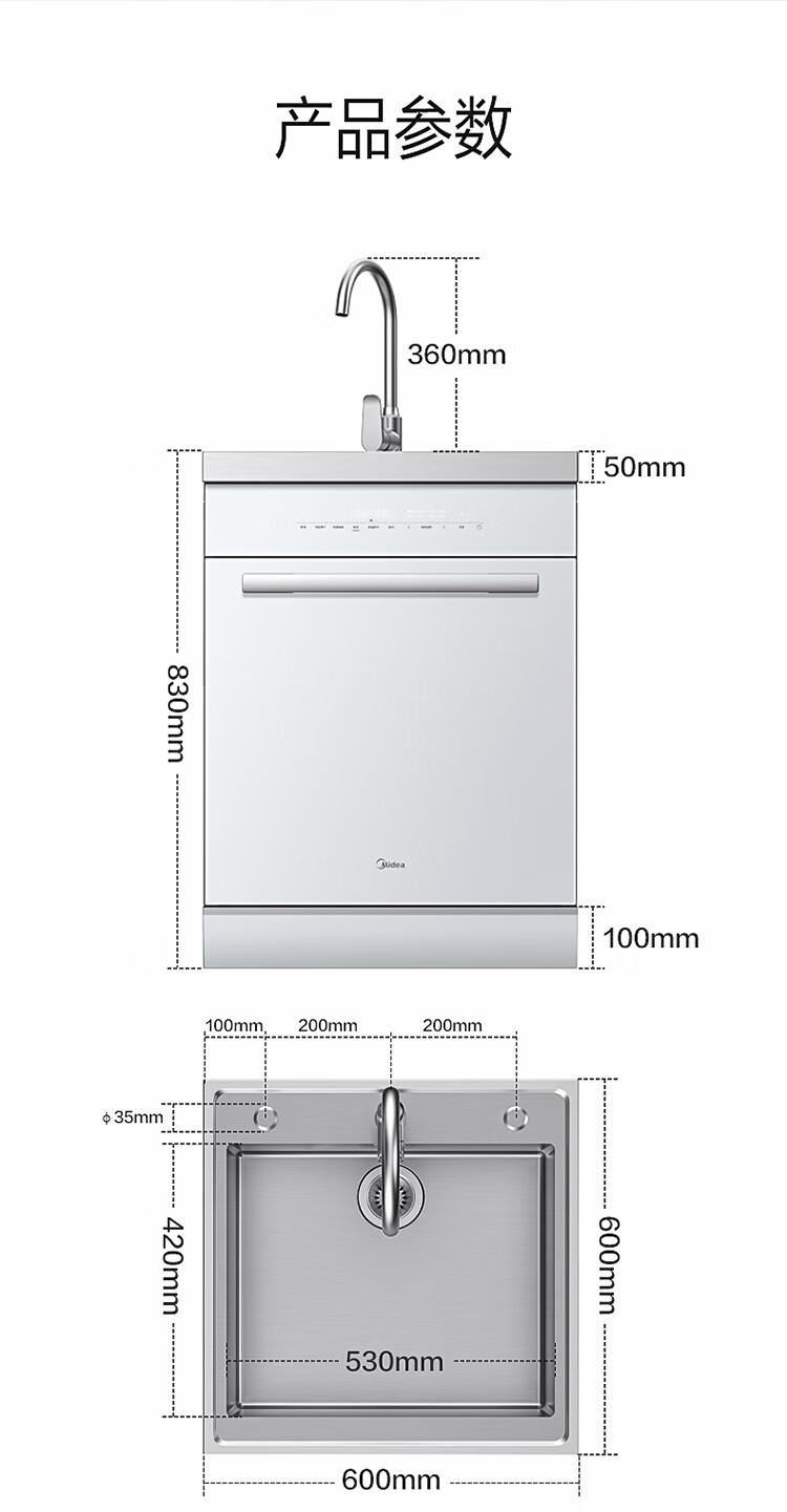 美的(Midea)集成水槽洗碗机TX60 一体式 大单槽 白色水槽洗碗机一体 洗碗机带洗菜盆一体机小尺寸 600宽*830高*深600