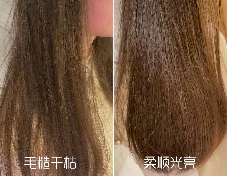 抹的时候就能感觉出头发变得滋润顺滑,用完也是肉眼可见的效果,头发明显变得有光泽啦!对比图呈上,使用前头发干枯毛躁,涂抹完感觉发质都变好了!