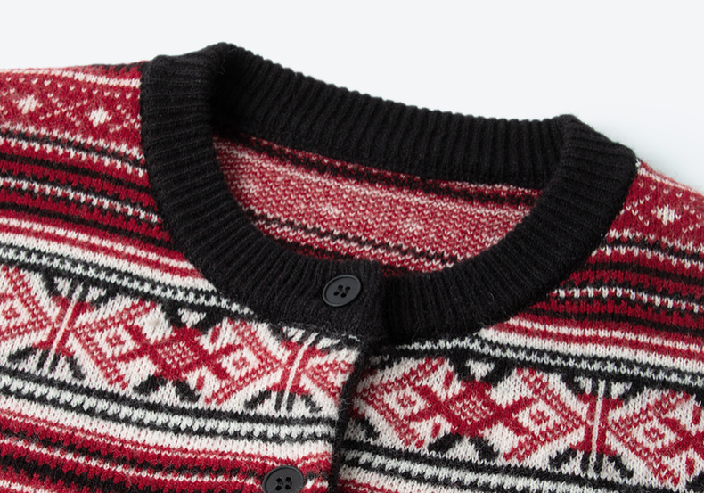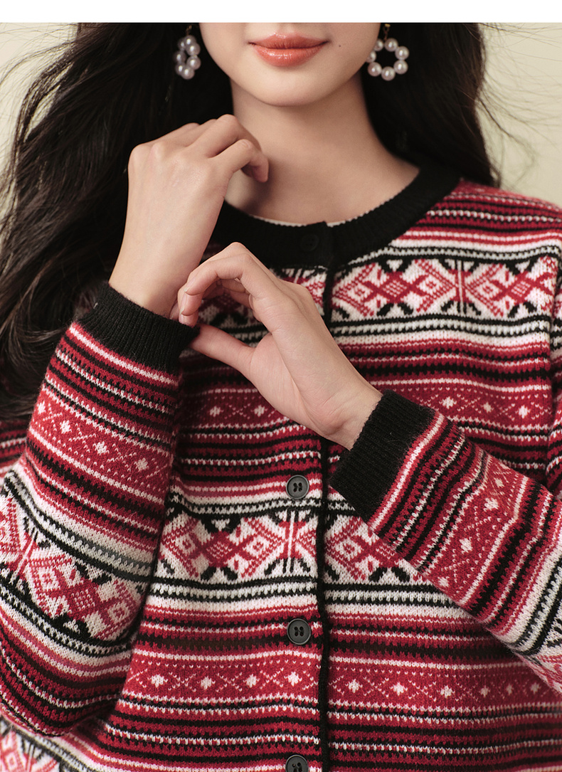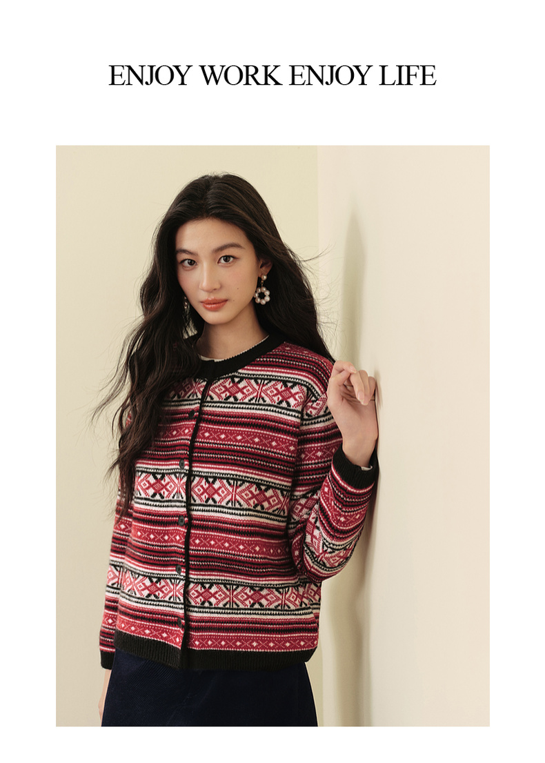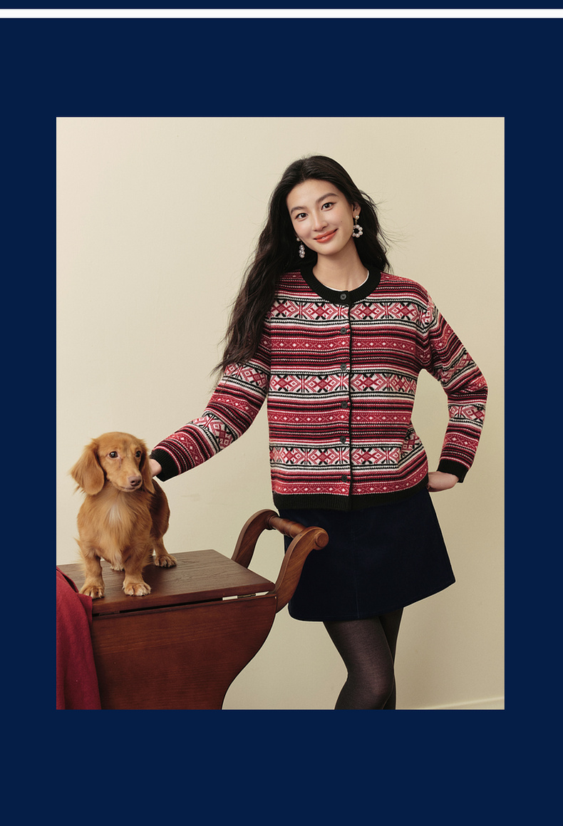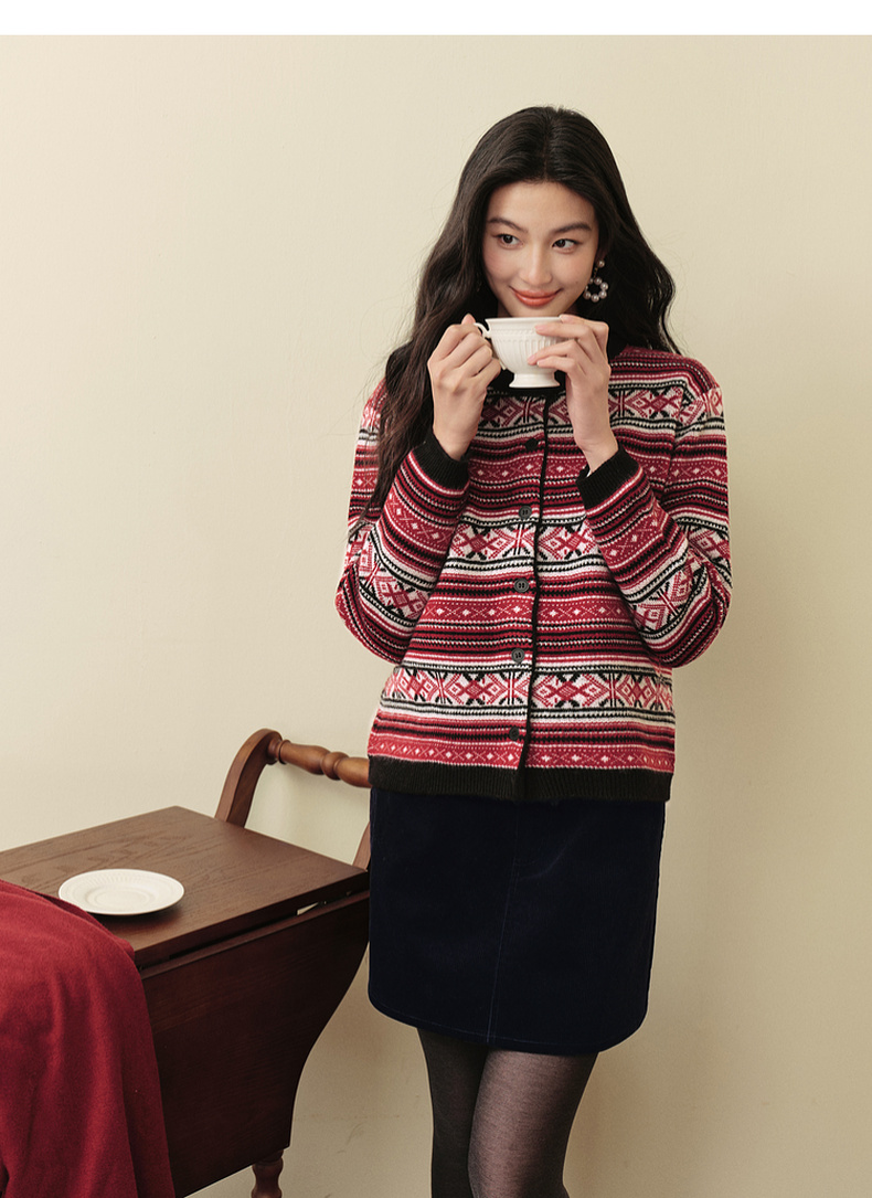 【严选】诗凡黎费尔岛复古提花针织开衫2025冬新款设计感拼色圆领气质毛衣7GB133251