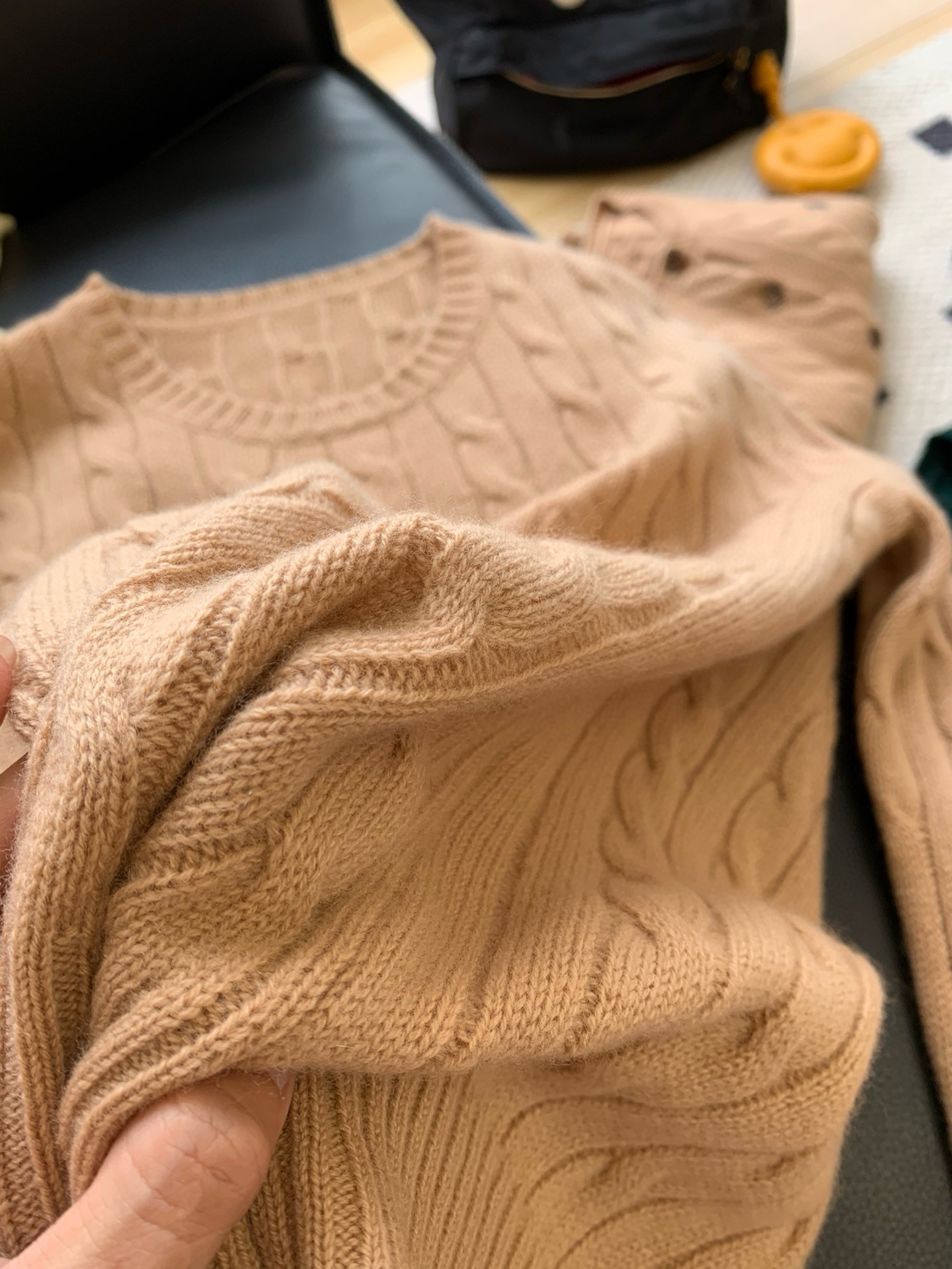 好喜欢这个颜色呀,图三颜色更准,真的好水灵,原材质的纱线手感特别舒服,有厚度,丰盈蓬松,软软糯糯的羊毛羊绒,简单实穿慵懒宽松感真的很有随意氛围感