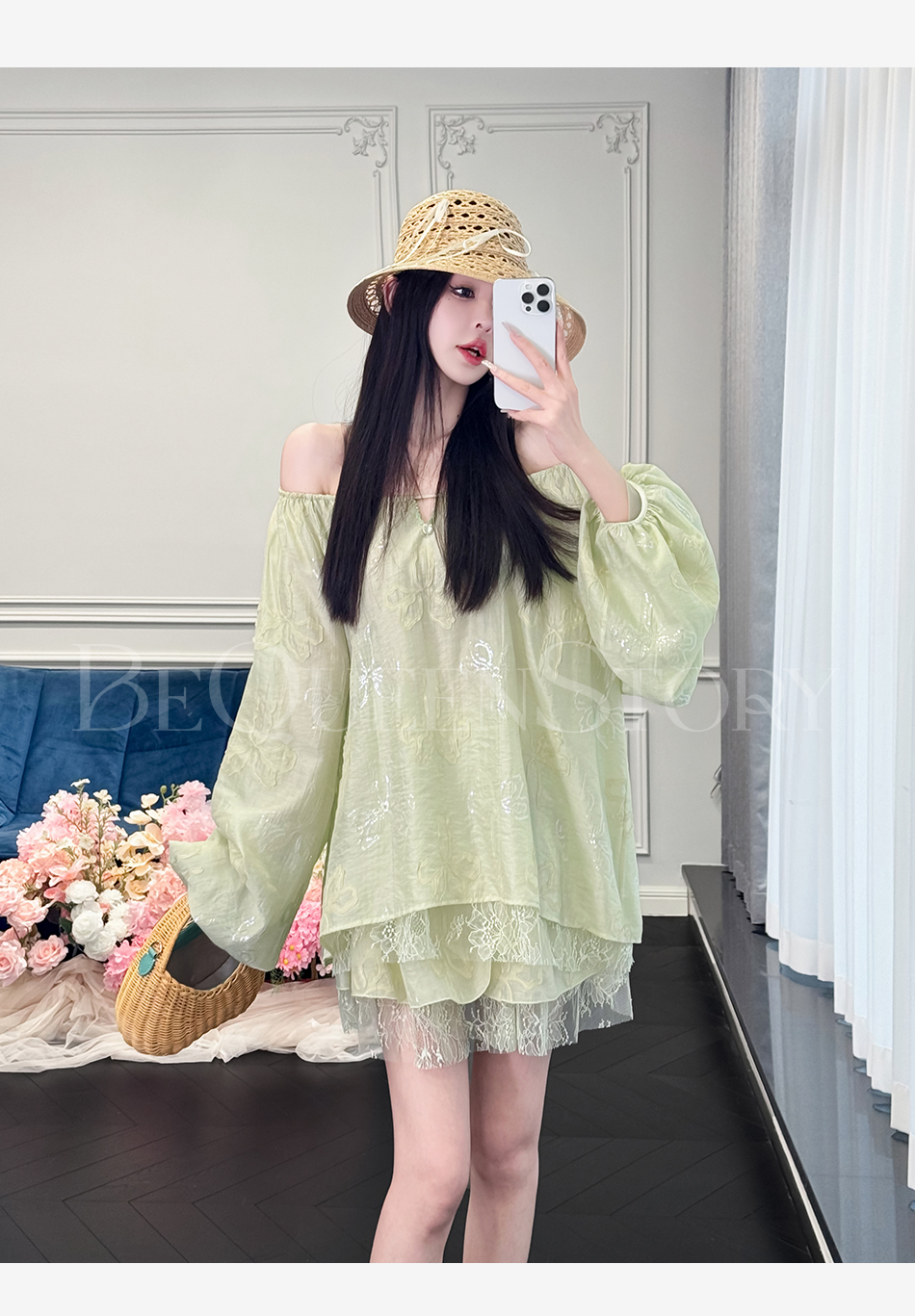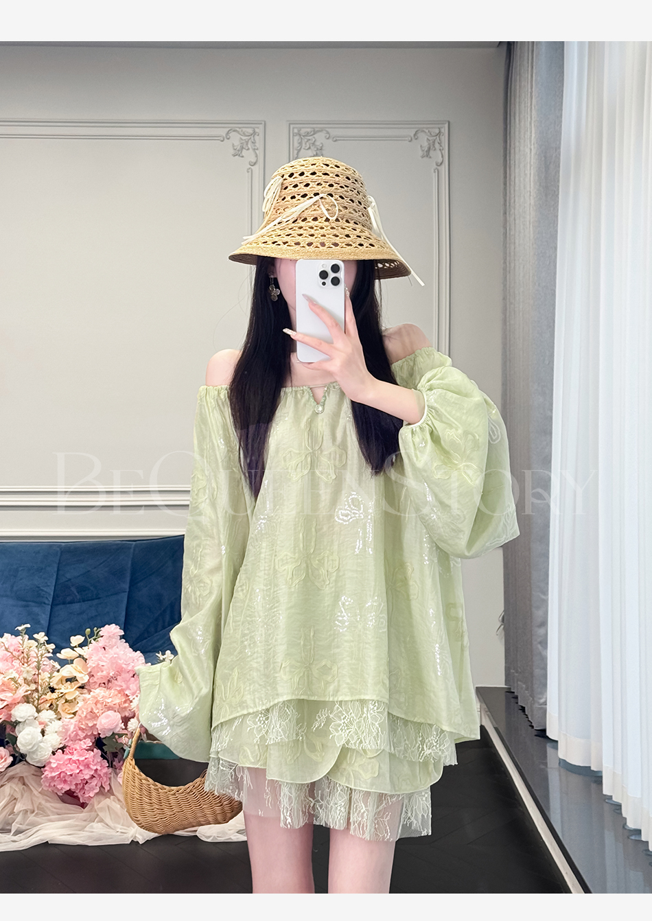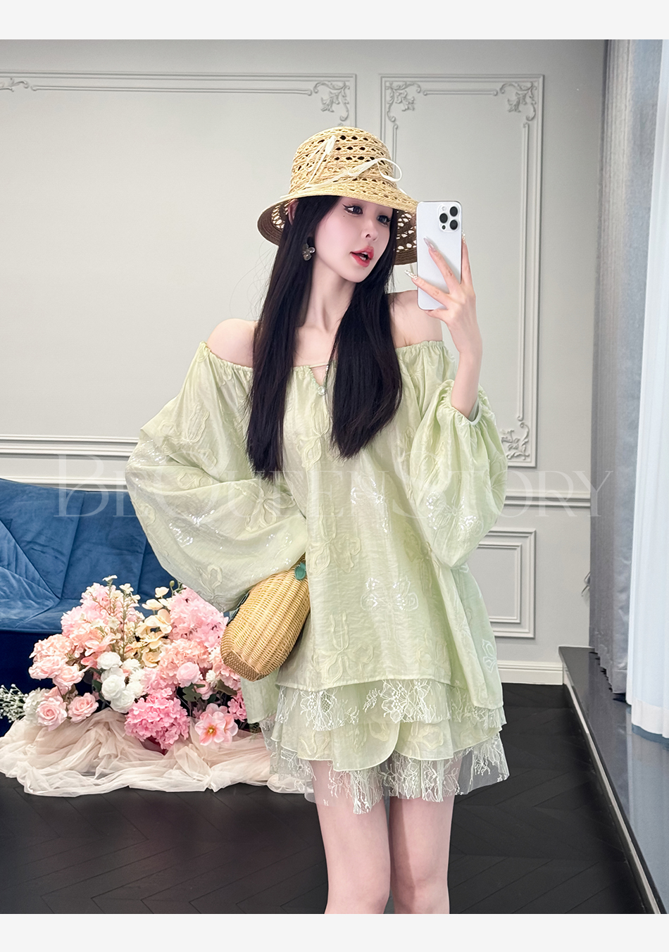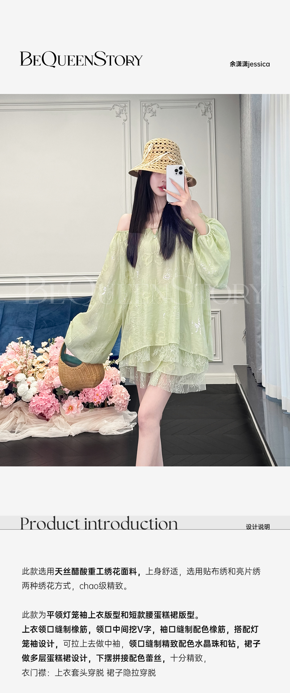 余潇潇【半夏青提】重工醋酸绣花上衣&拼接蕾丝蛋糕裙裤2025新款