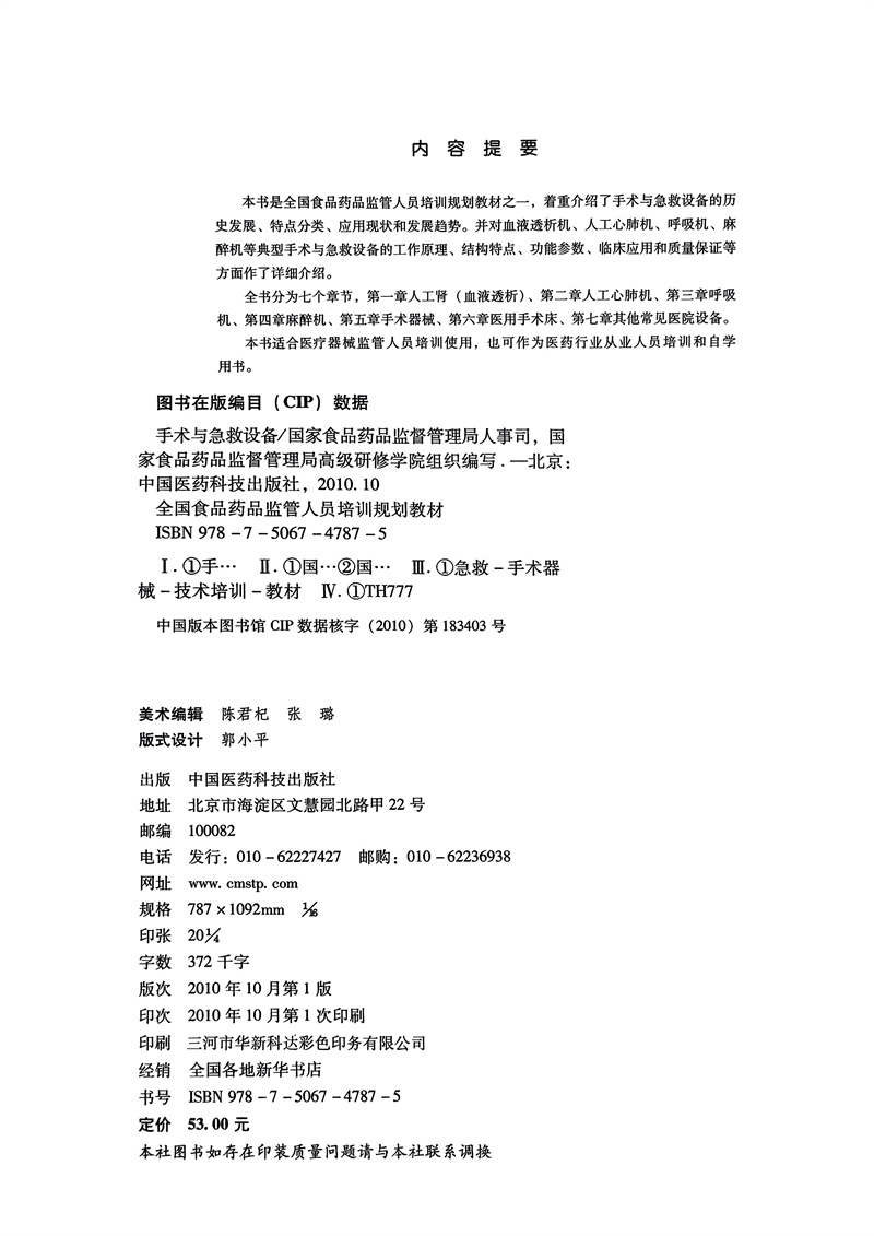全国食品药品监管人员培训规划教材—手术与急救设备(医疗器械部分)国家食品药品监督管理局人事司 编写 中国医药科技出版社