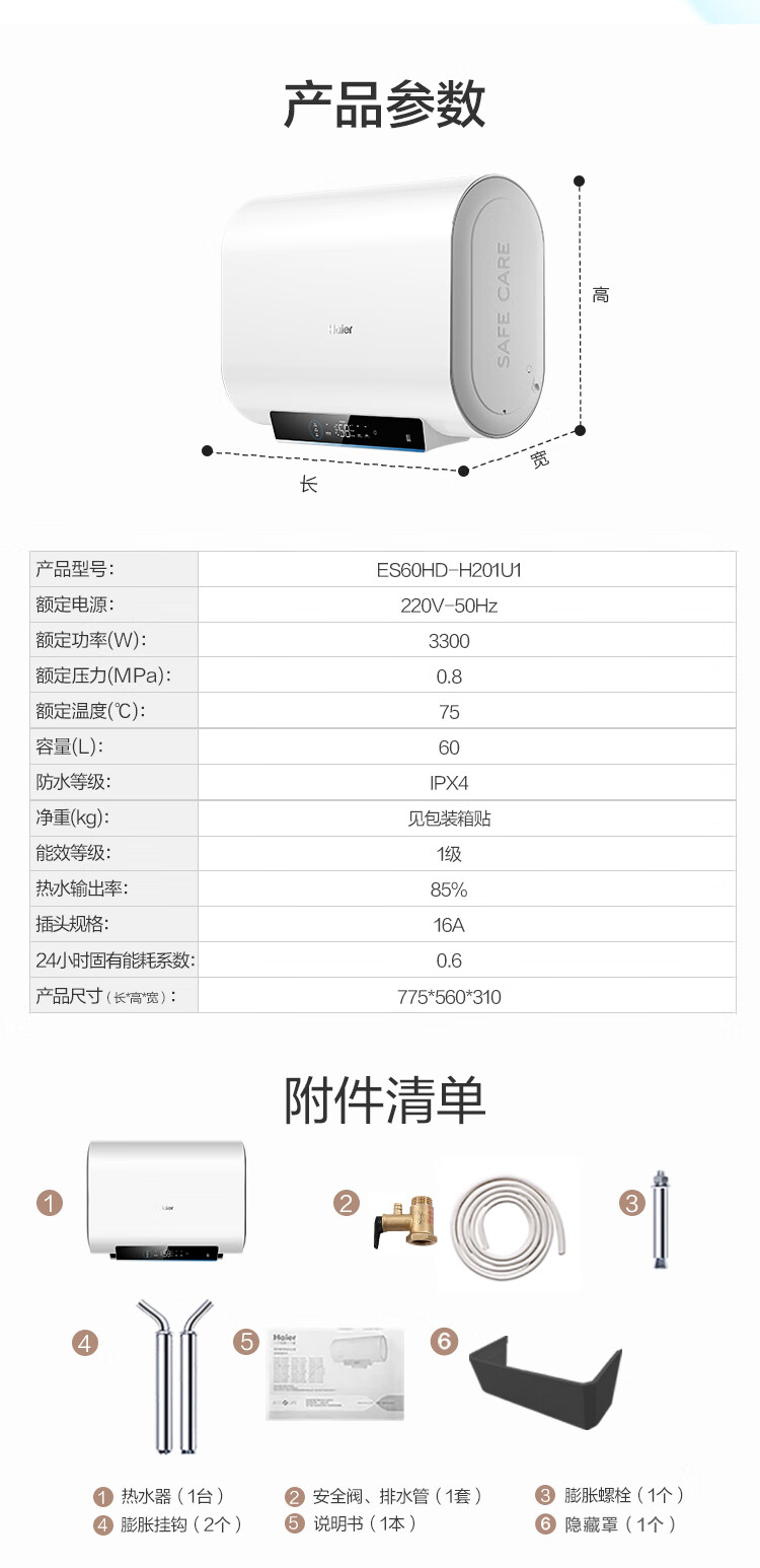 海尔(Haier)60升电热水器家用储水式 3300W大功率速热安全节能大水量一级能效 ES60HD-H201U1 *