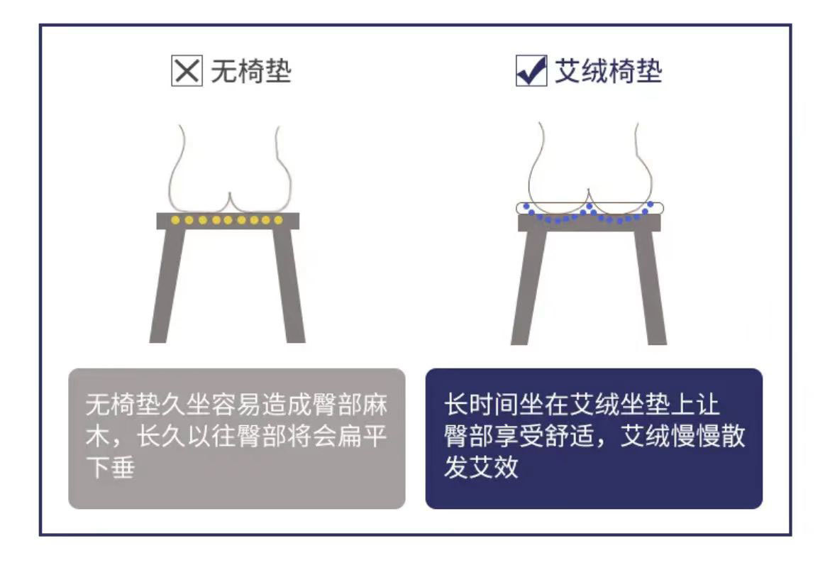 装有艾草的坐垫>>温暖之气可从肠道、会荫进入人体,从而温暖子宫、下焦及五脏六腑,也能够改善阳气不足导致的腹泻