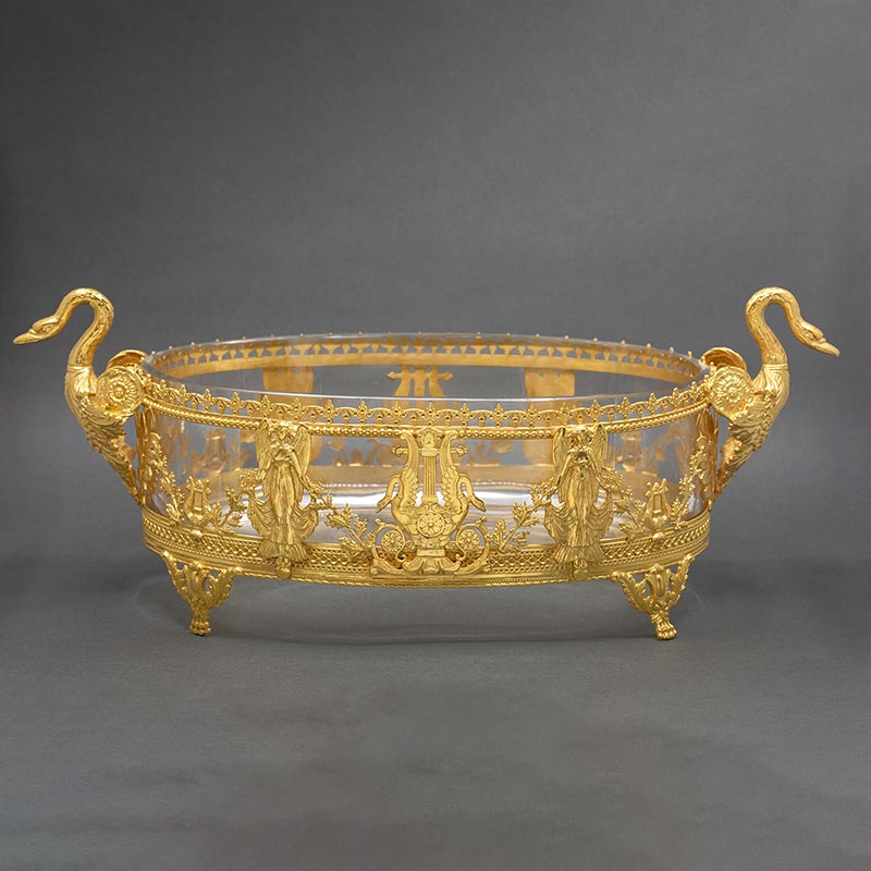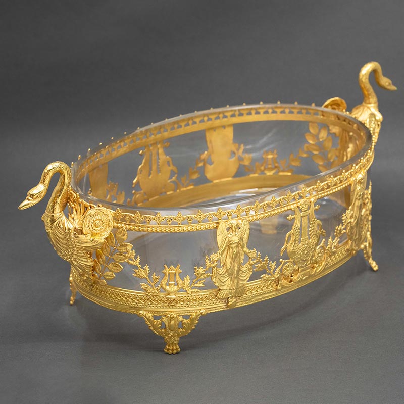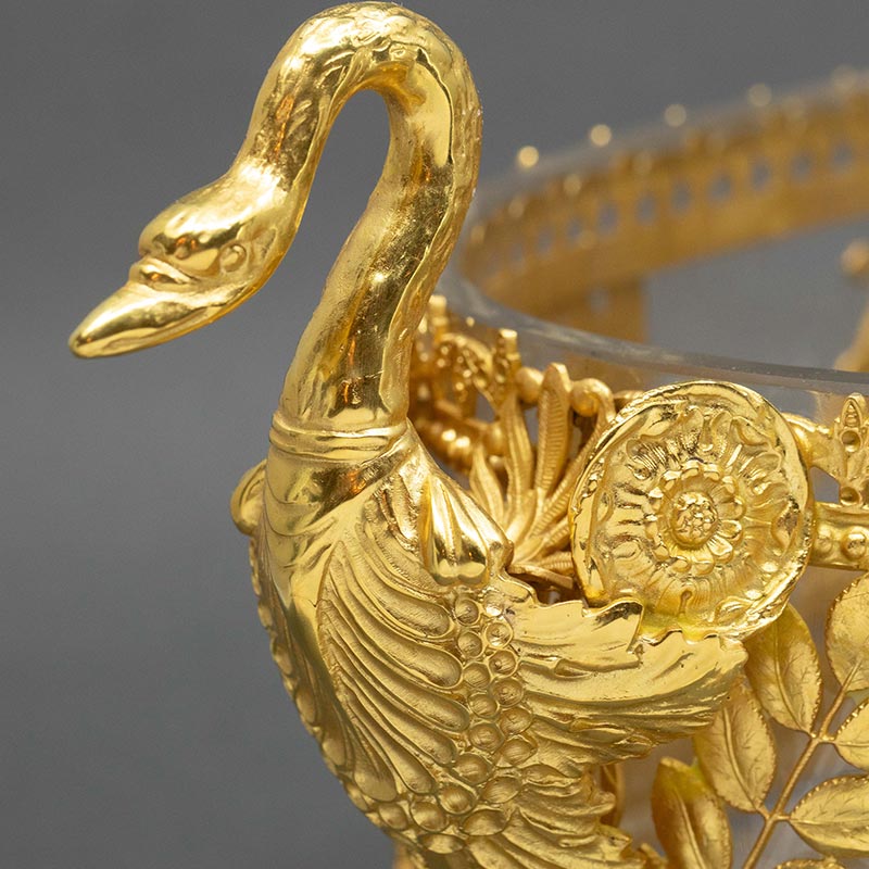 19世纪末法国出品帝政风格女神与天鹅主题铜鎏金精雕装饰水晶果盘