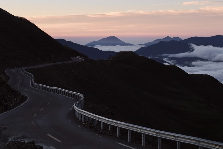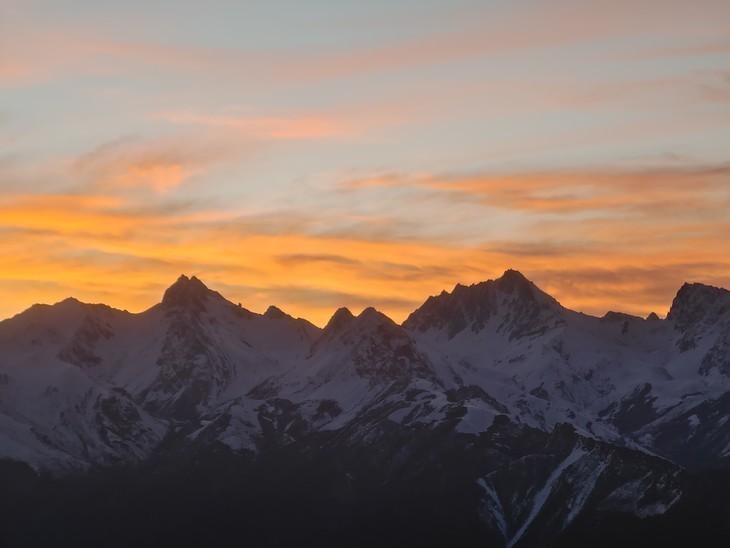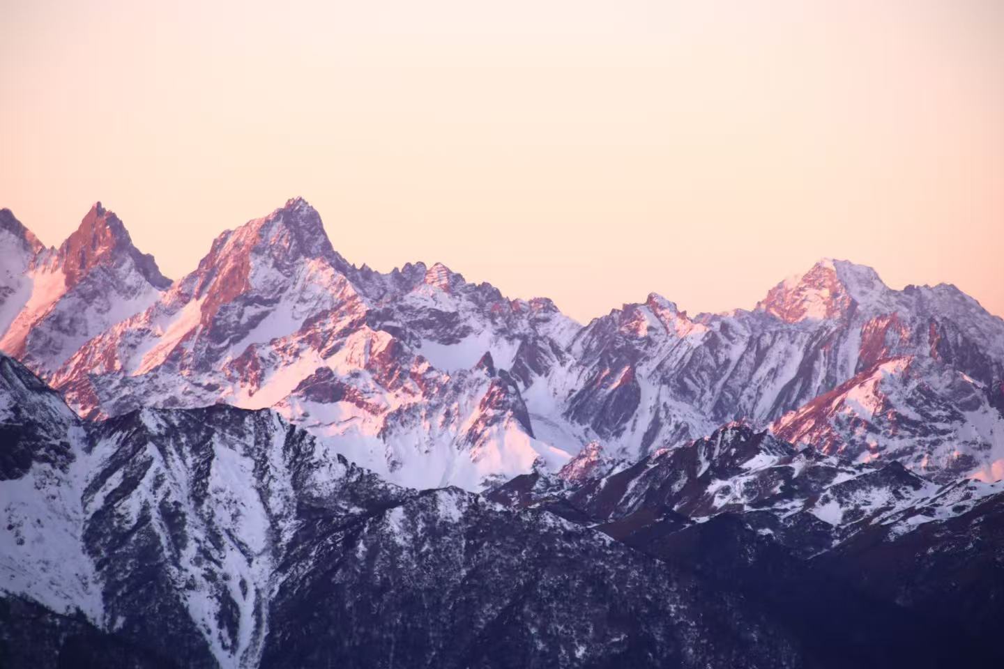 清晨,在天黑微亮之际,山谷里云起云涌,云海就像浪花一样翻涌,在山顶将这一且尽收眼底,雪山在日出赐予的颜色中染上金黄
