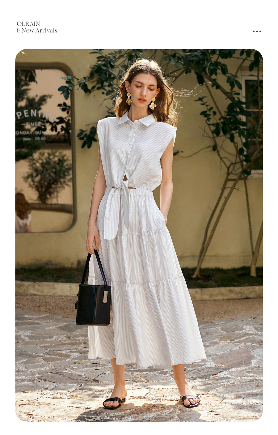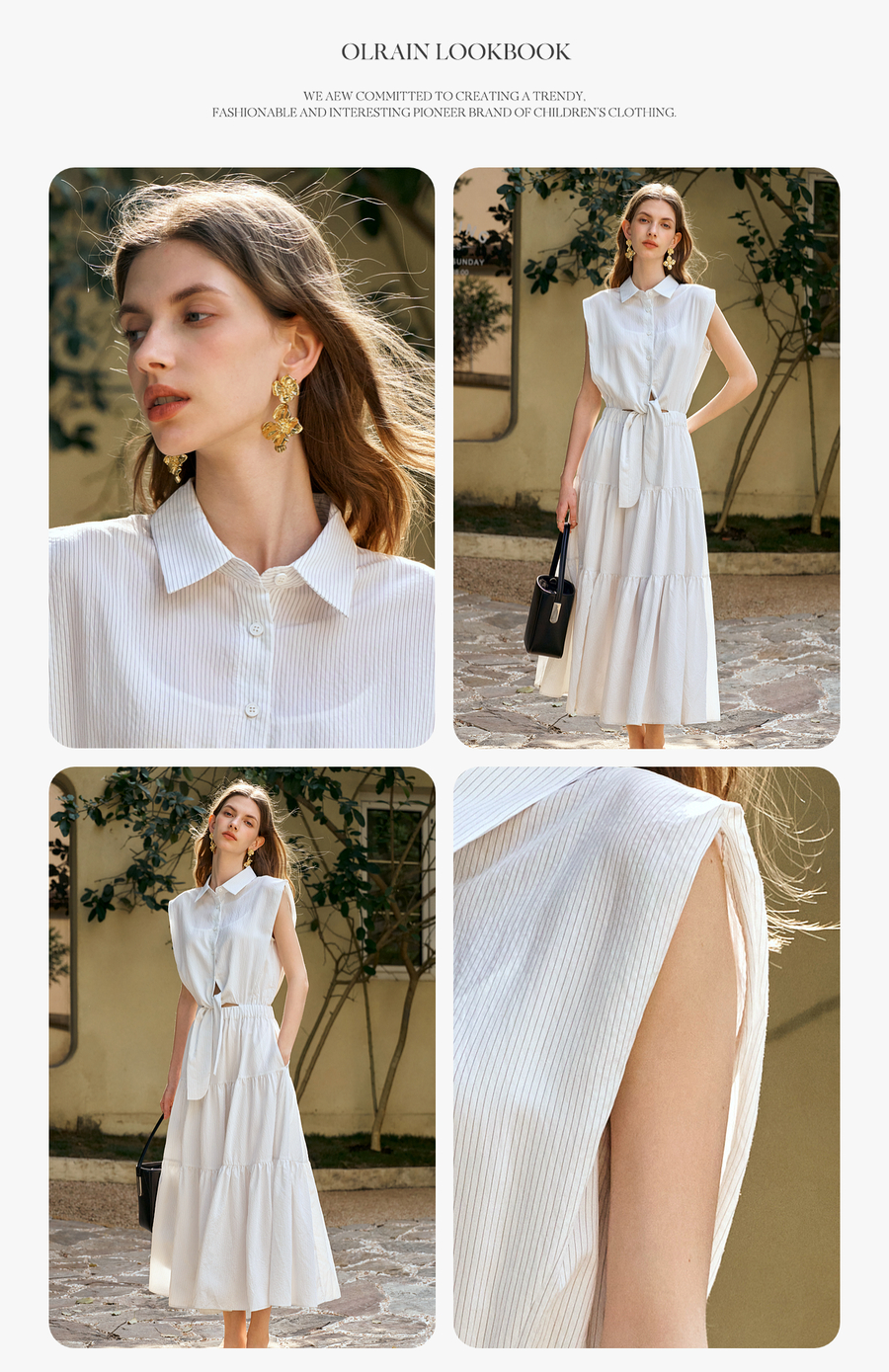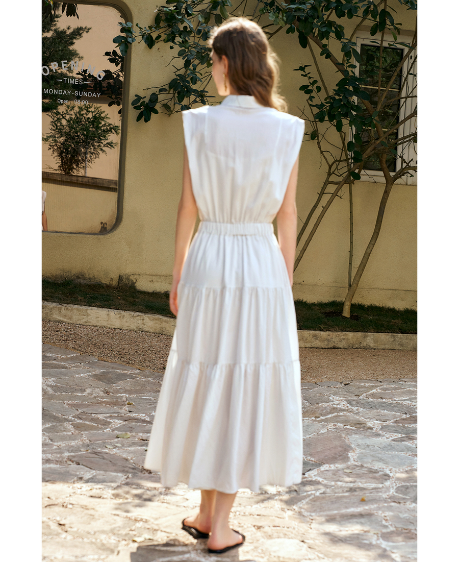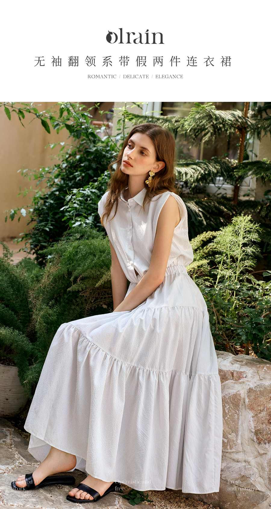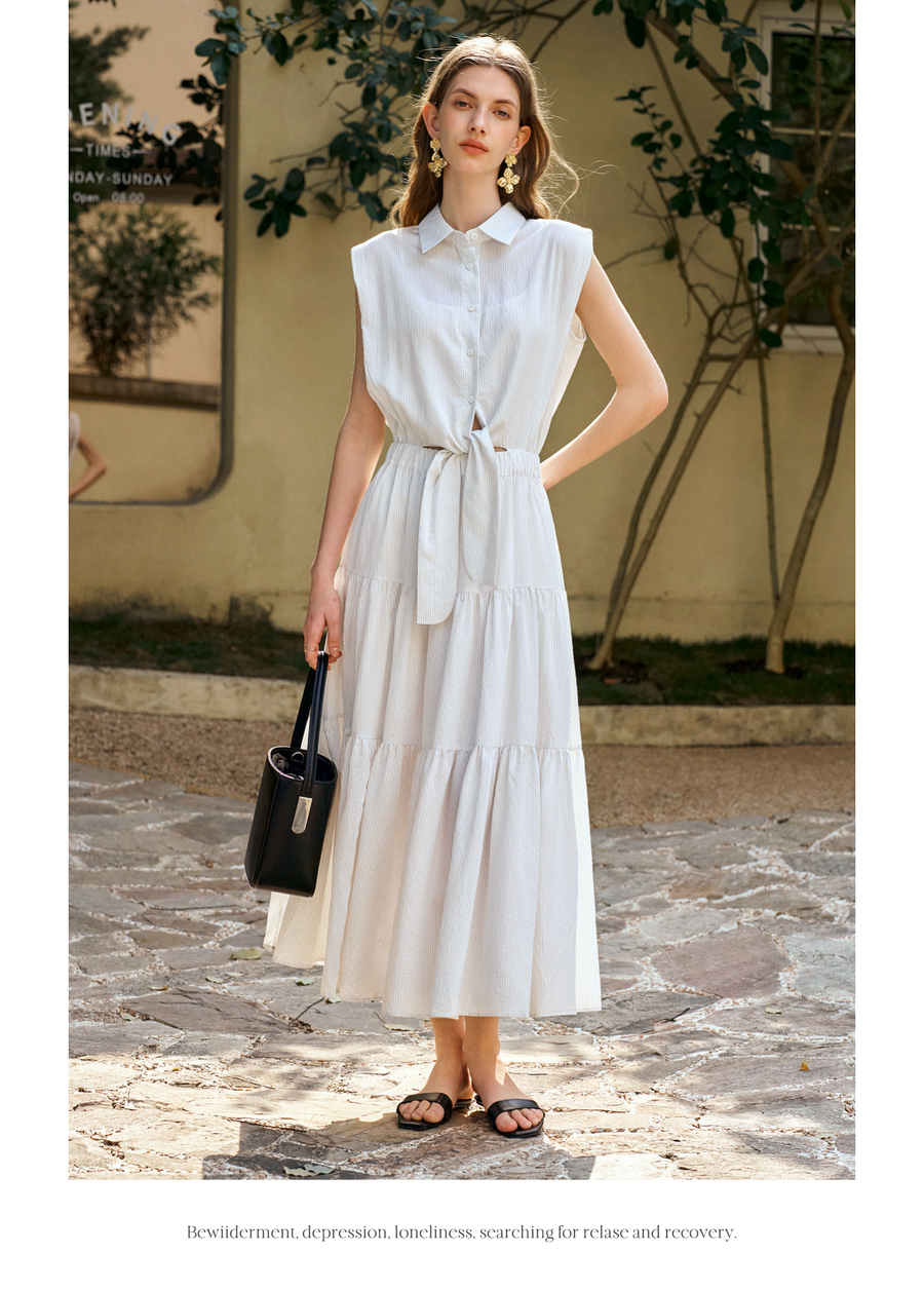 OLrain欧芮儿无袖翻领系带假两件连衣裙女夏季2025新款白色公主裙