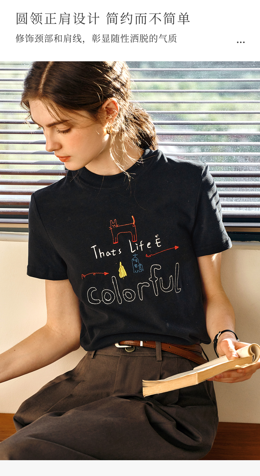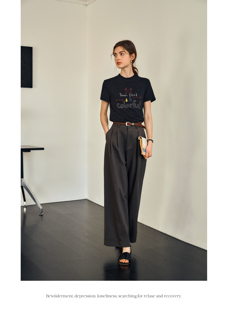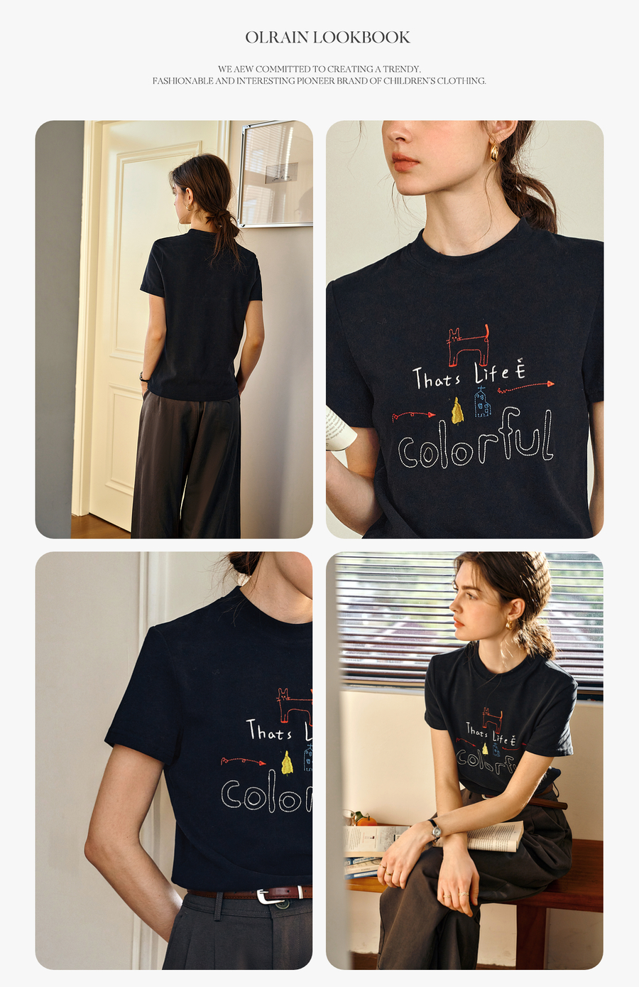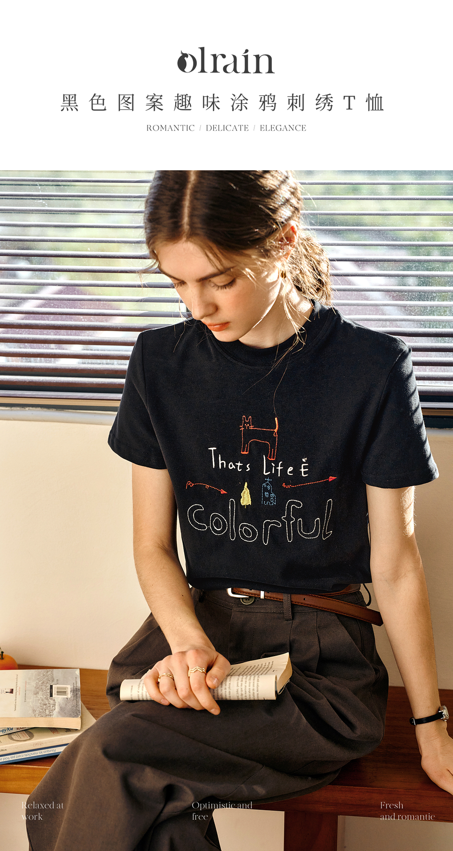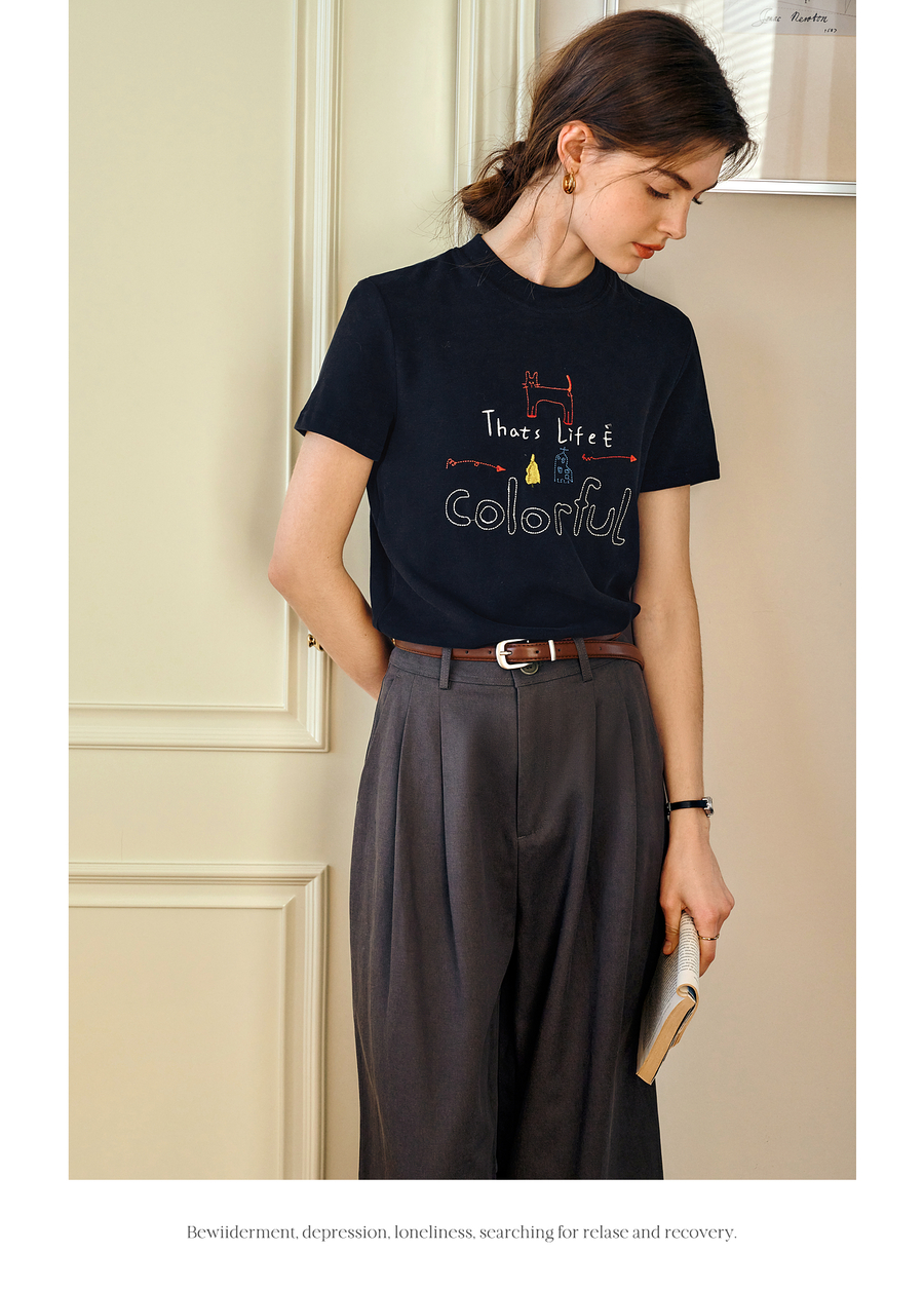 OLrain欧芮儿黑色短袖T恤女夏季2025年新款通勤趣味涂鸦刺绣上衣