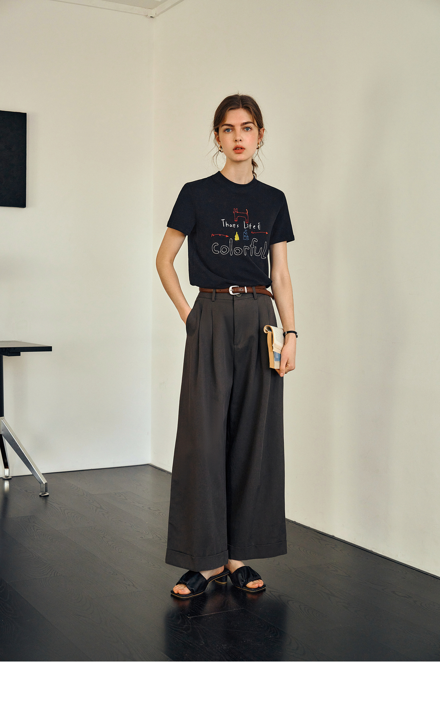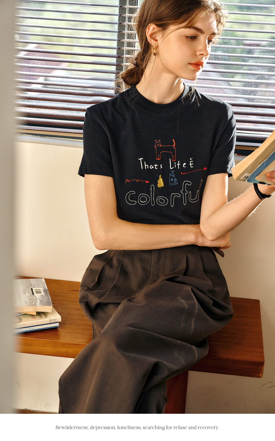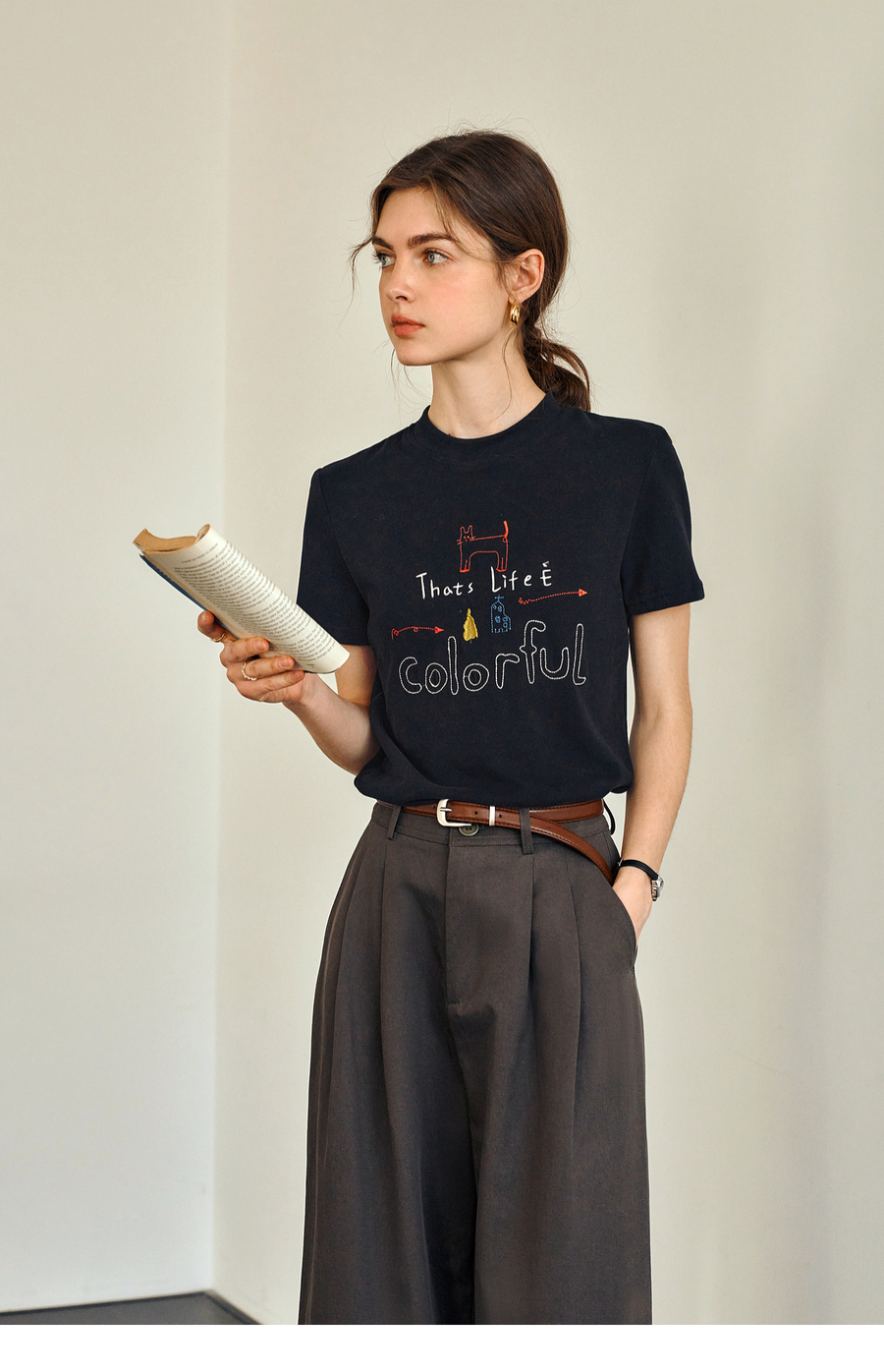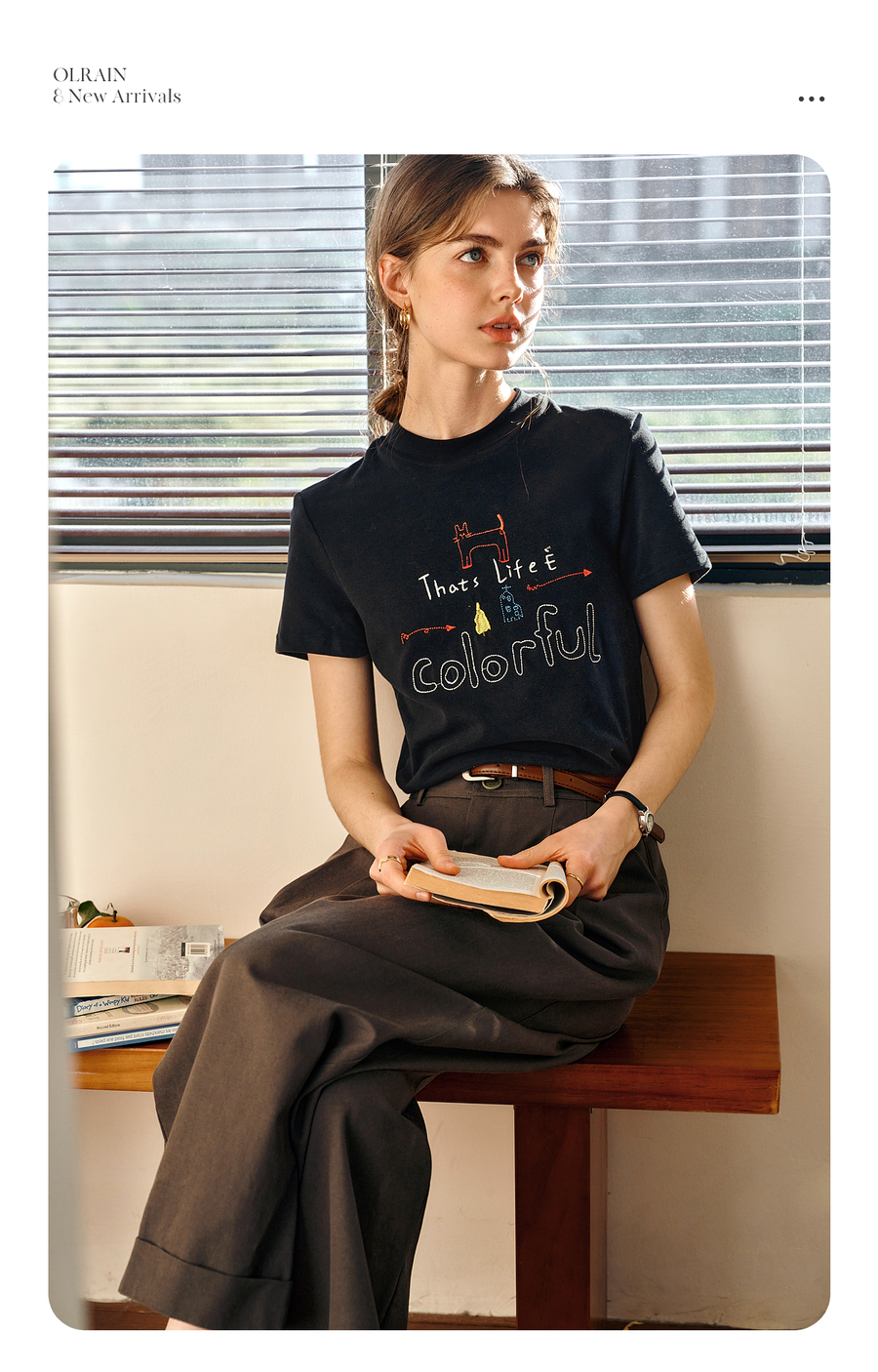 OLrain欧芮儿黑色短袖T恤女夏季2025年新款通勤趣味涂鸦刺绣上衣