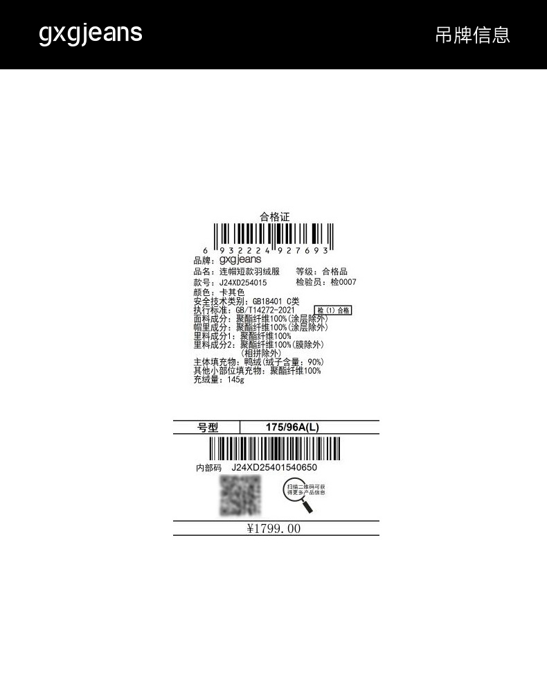 gxg.jeans男装 冬季 连帽短款羽绒服J24XD254015