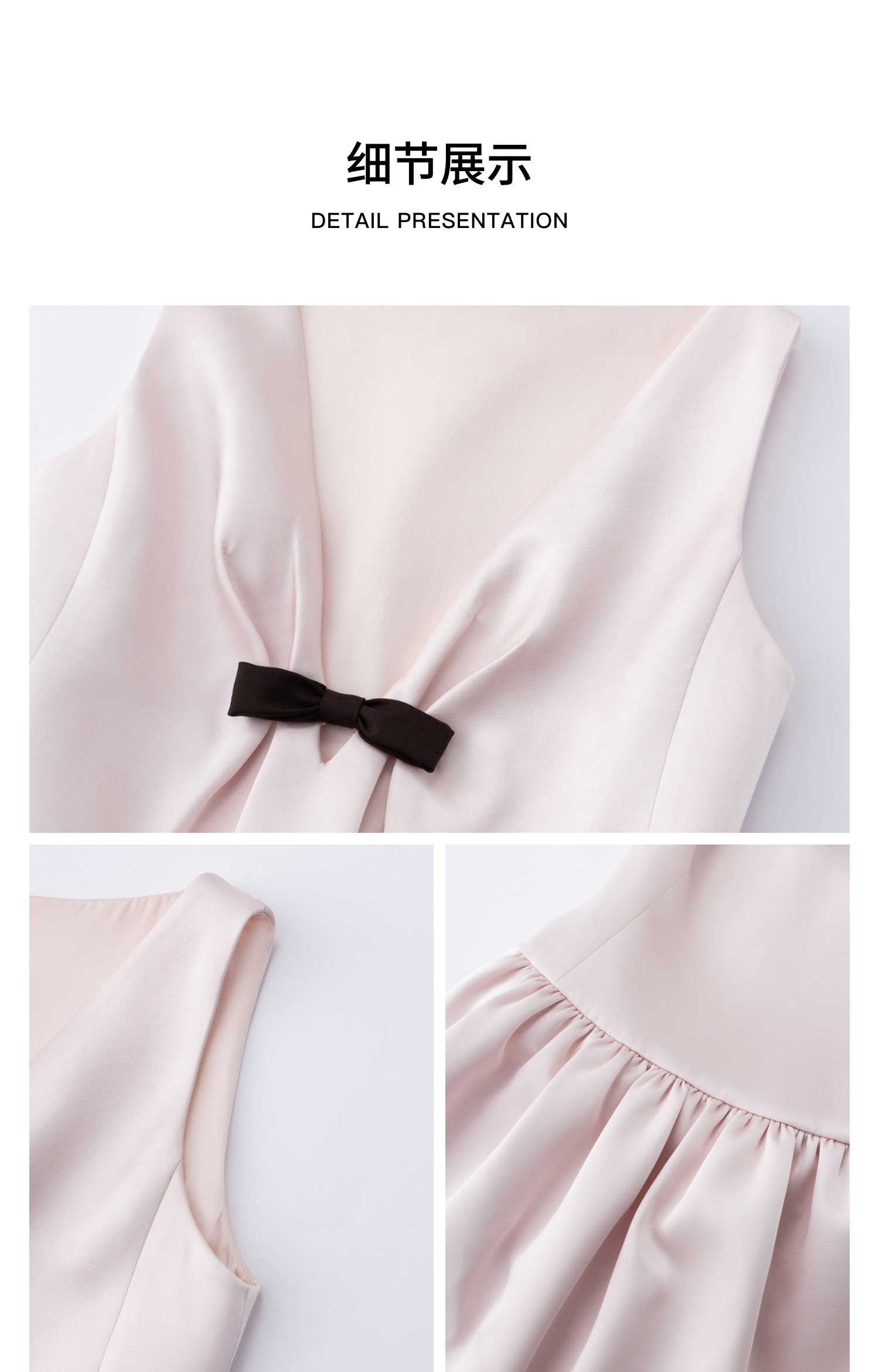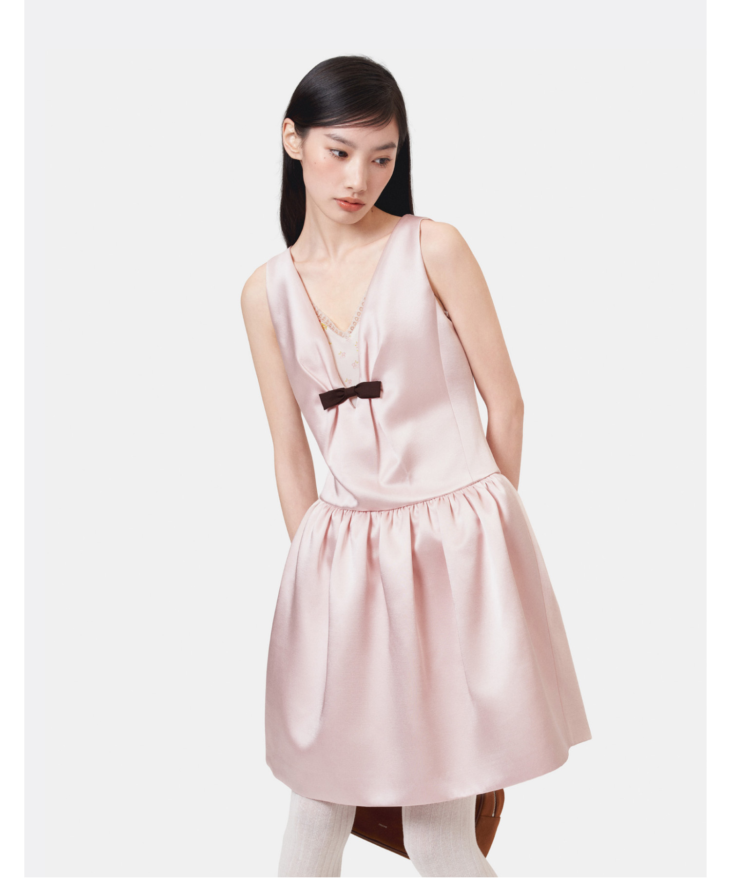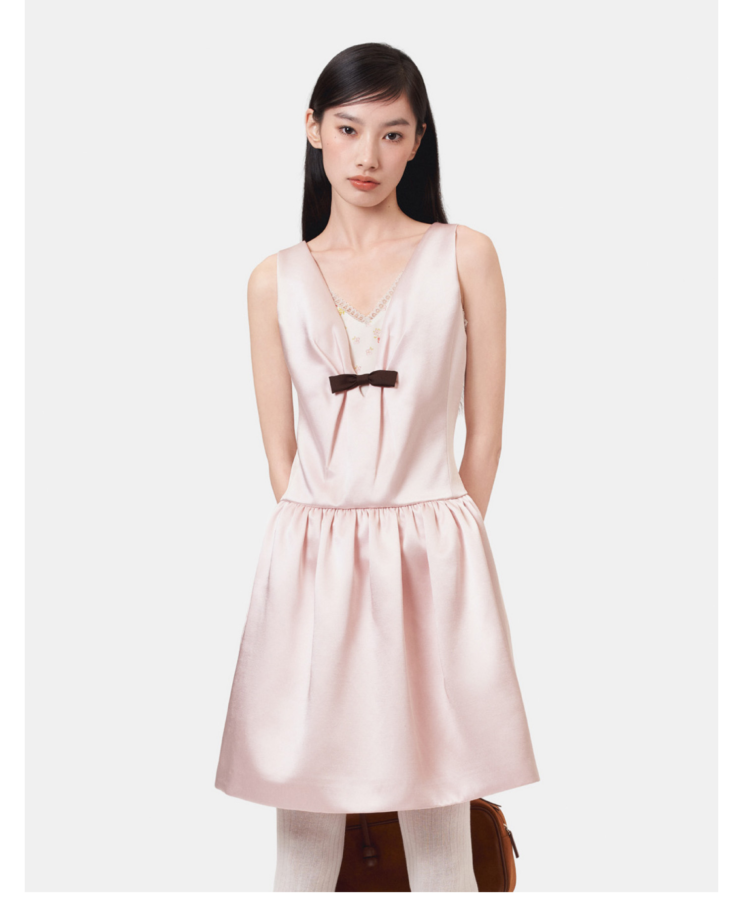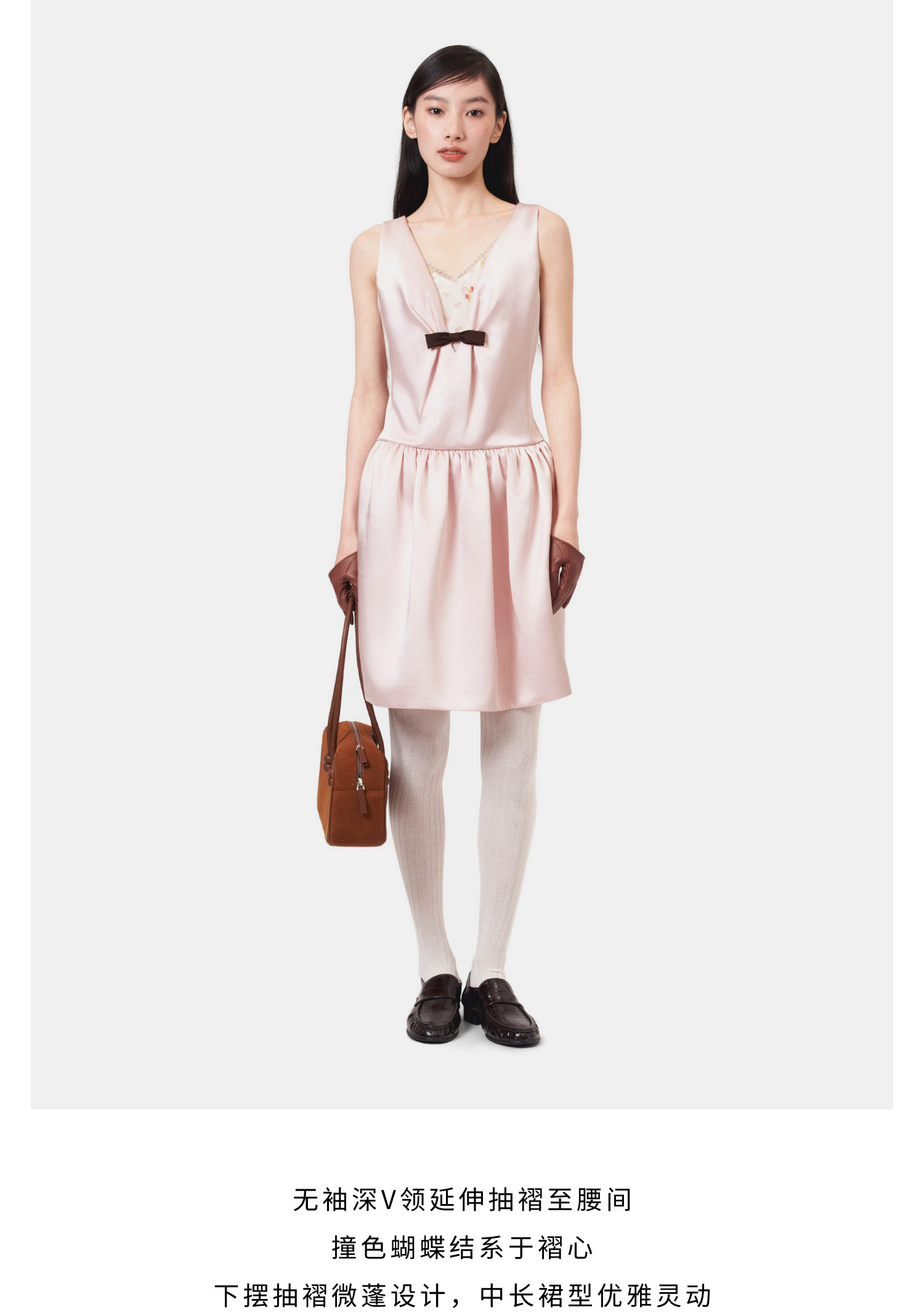 HERLIAN 2026年春季新品蝴蝶结装饰深V领少女缎面无袖连衣裙