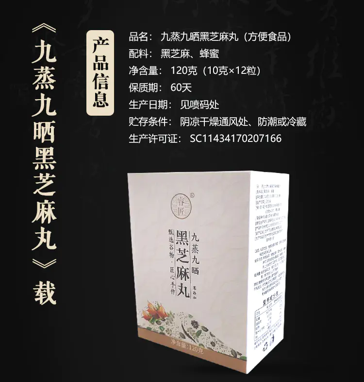 【产品规格】黑芝麻丸120g*3盒(每盒12丸),黑芝麻丸120g*6盒(每盒12丸),黑芝麻丸120g*12盒(每盒12丸)(每箱都是独立的包装,如购买多件分多个包裹发出,可能会前后陆续到货)。