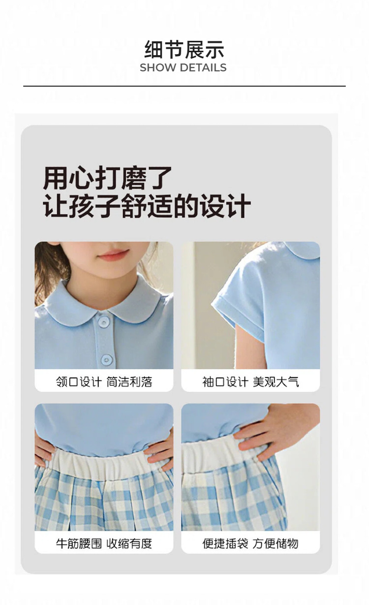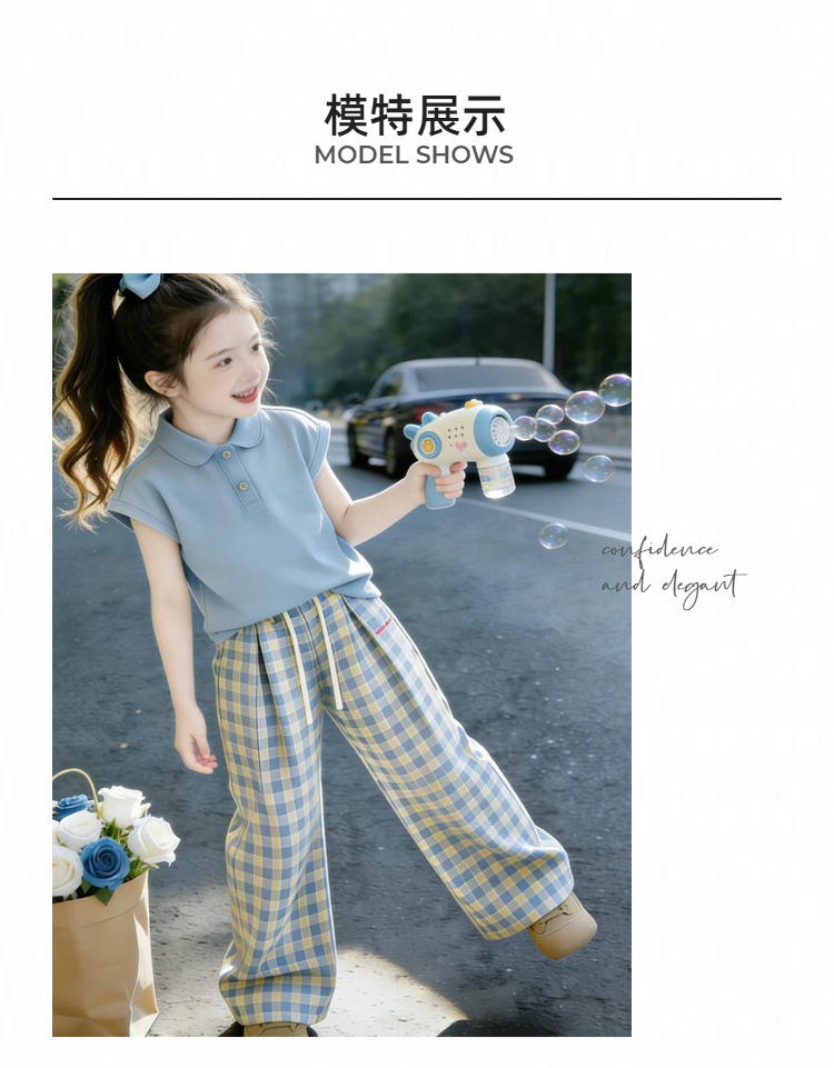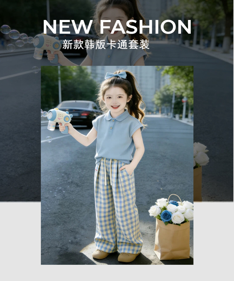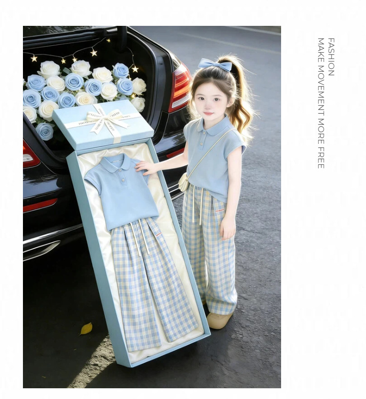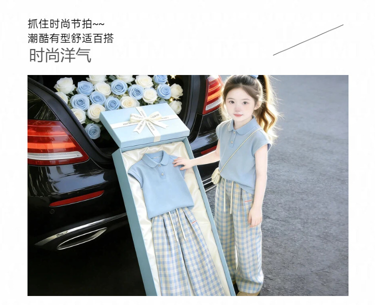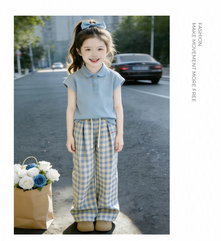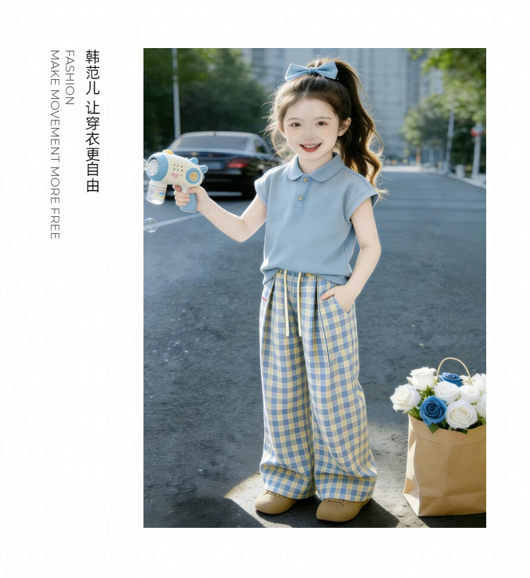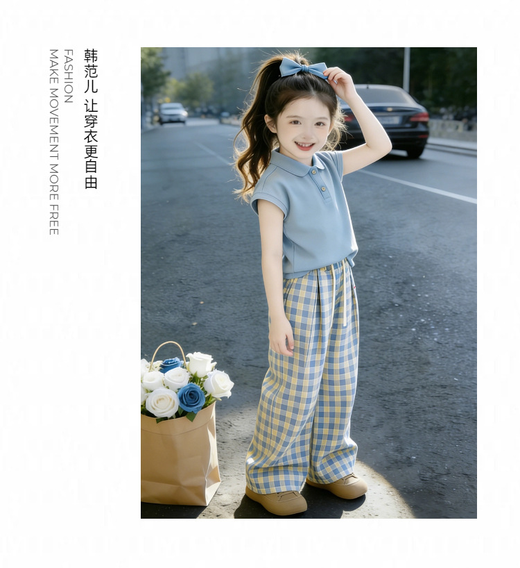 童洛萌女童夏季POLO衫套装新款儿童夏天薄款短袖格子长裤两件套爆款90-150