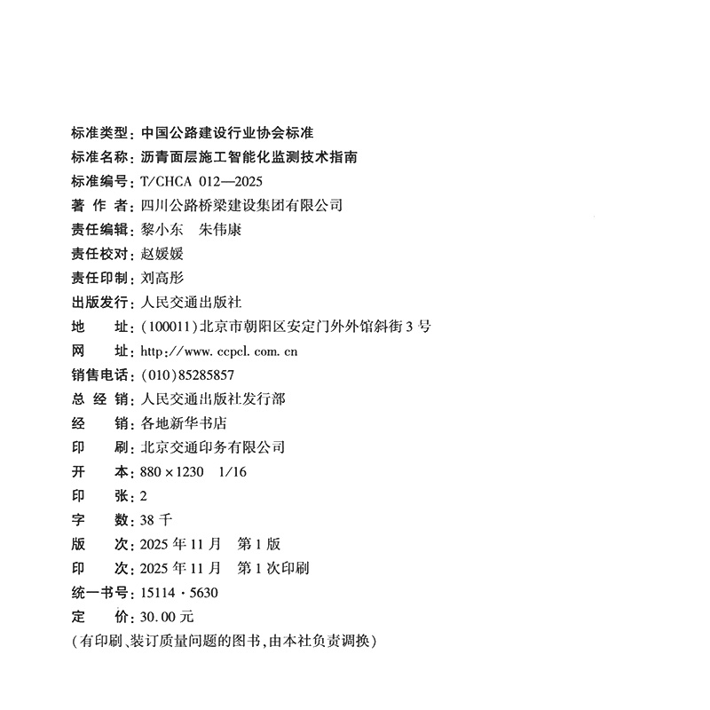 书名:沥青面层施工智能化监测技术指南(T/CHCA 012—2025)