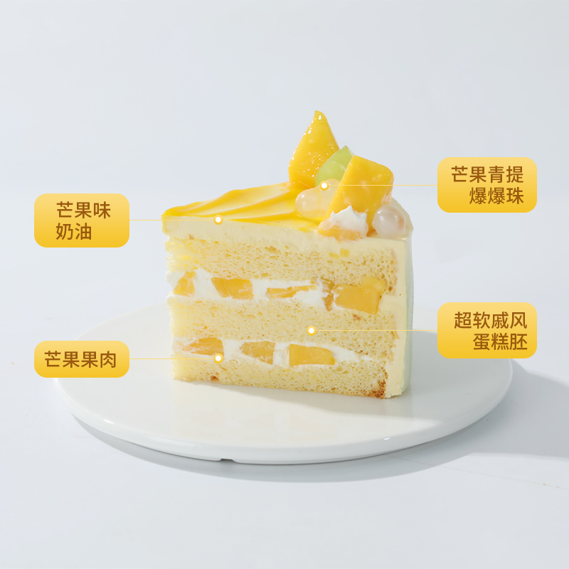 【芒果鲜果乐园】夏日清新芒果蛋糕,把芒果的香甜、椰肉爆珠的Q弹、奶油的绵密,融入松软的蛋糕胚中,口感层层递进,让人吃一口还想吃