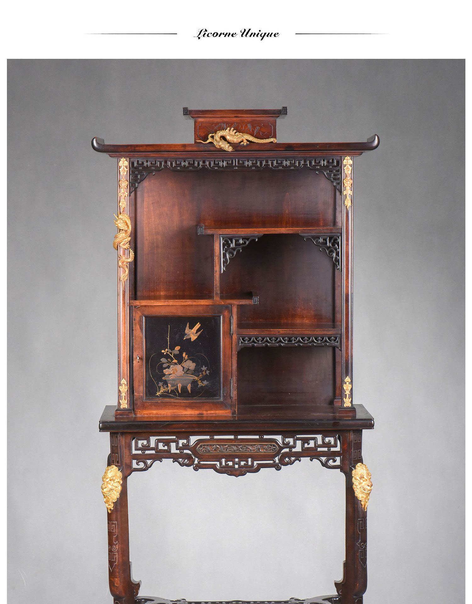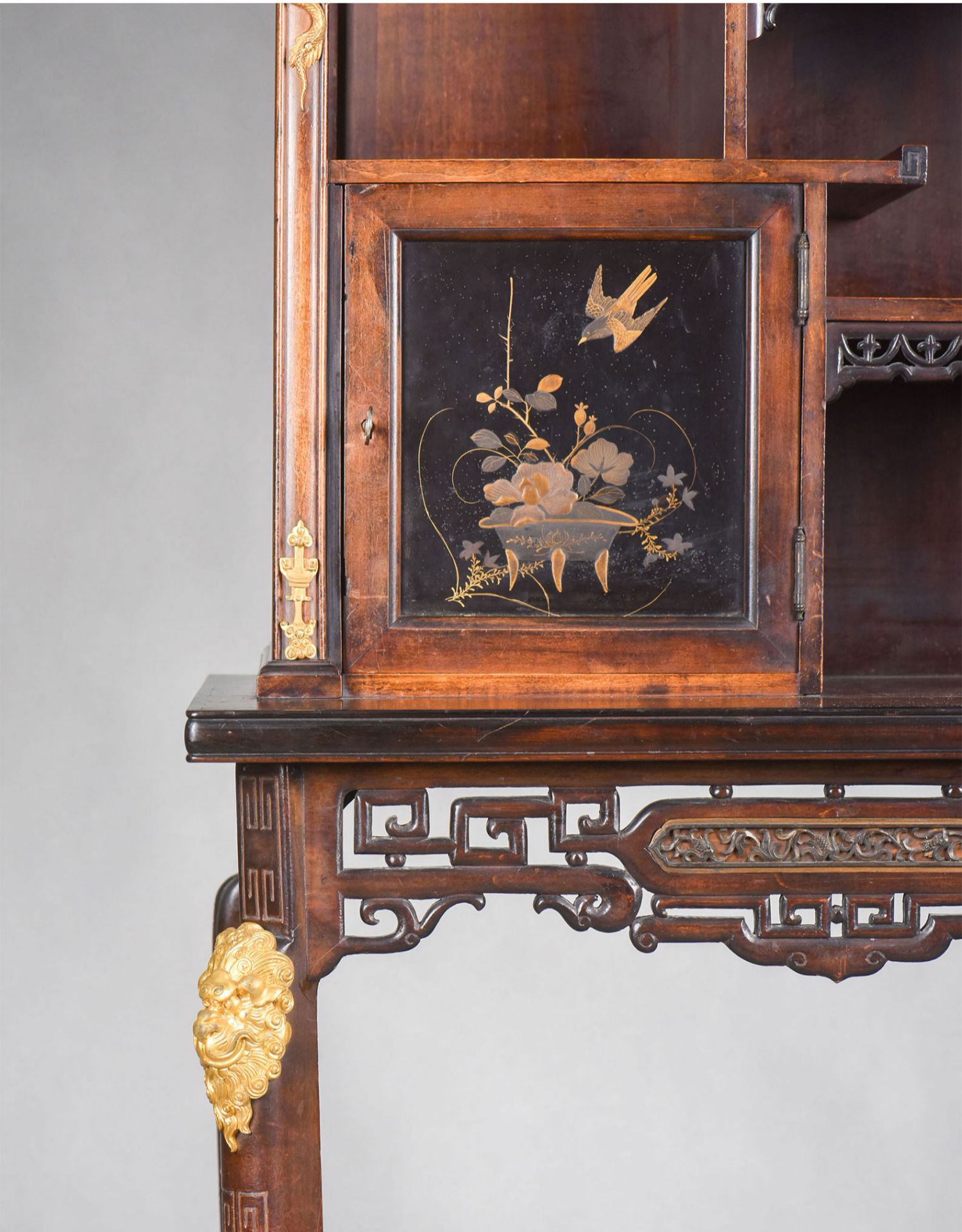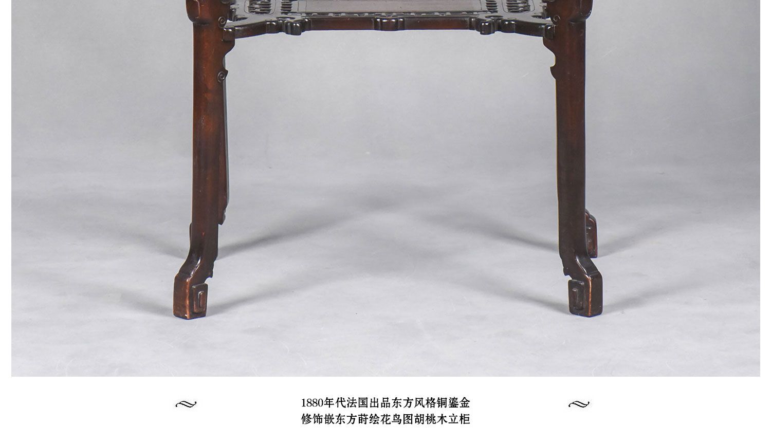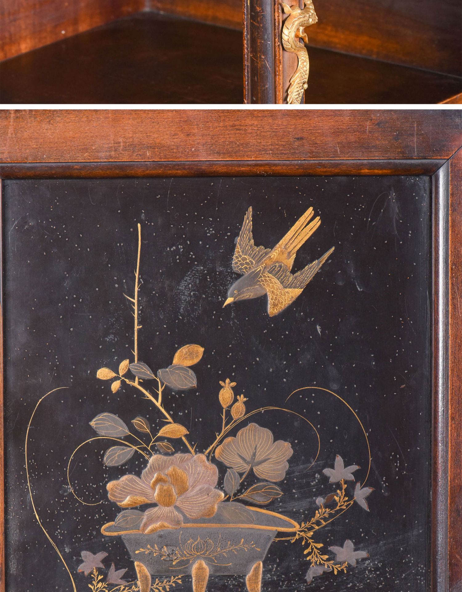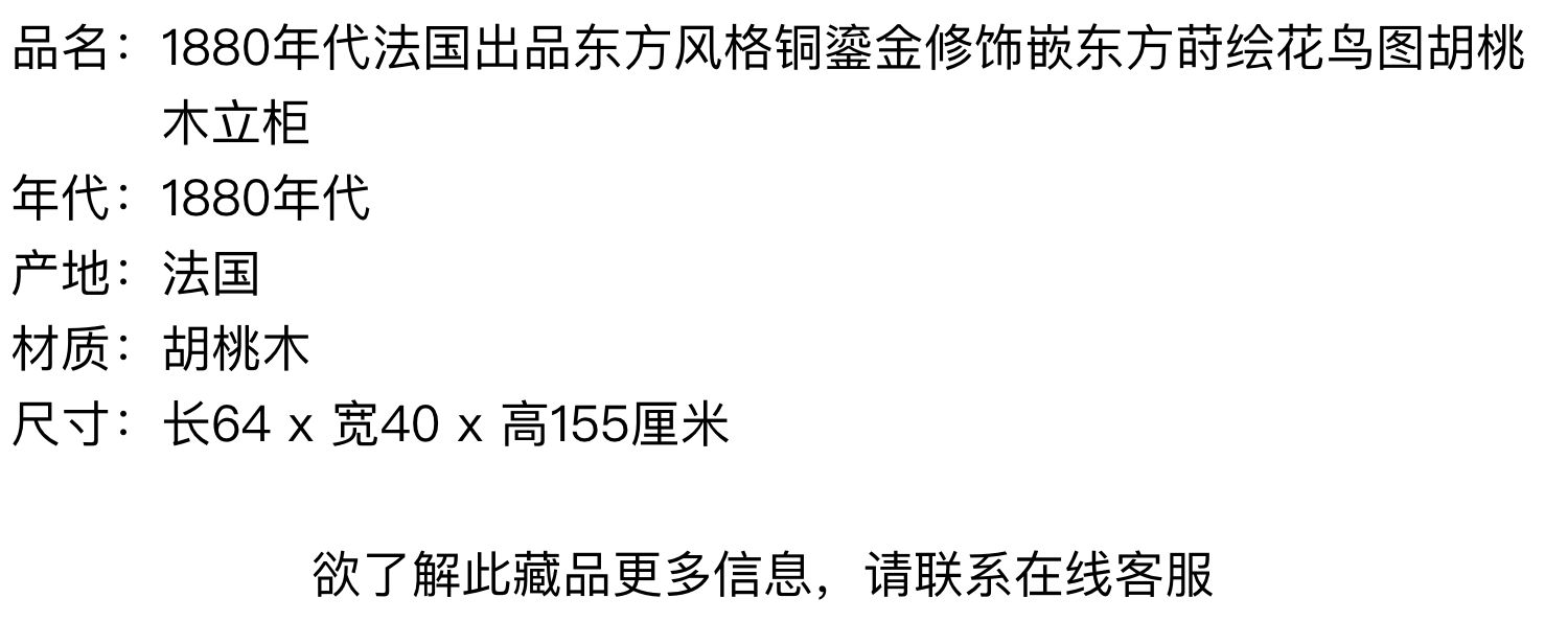 独角鹿西洋古董家具法国出品铜鎏金嵌东方莳绘花鸟图胡桃木立柜