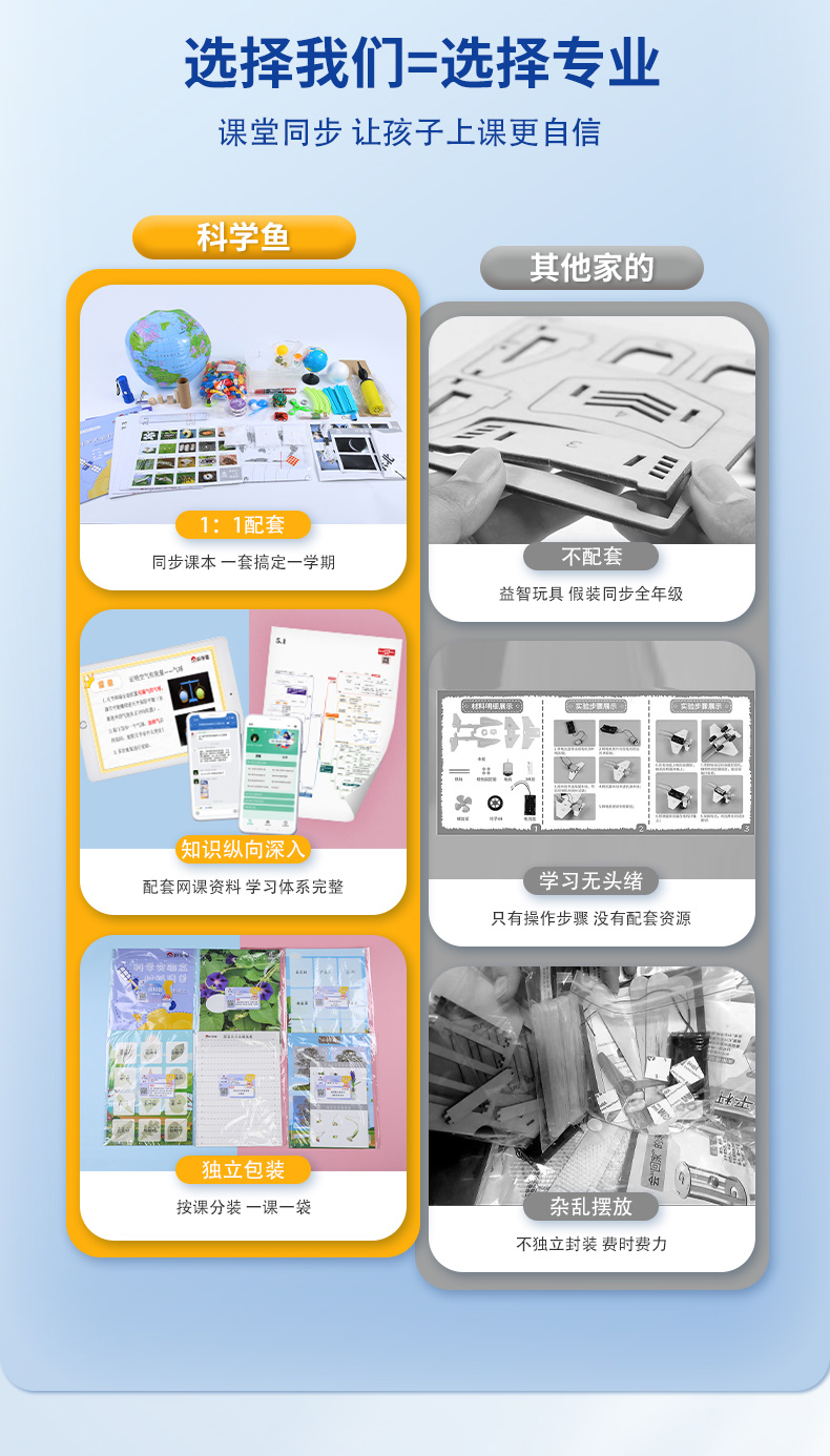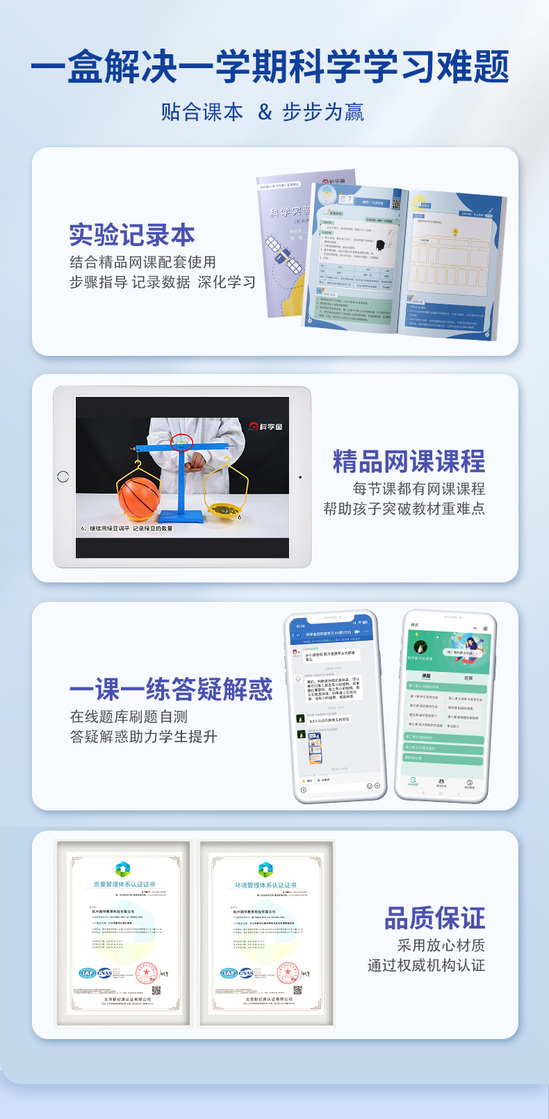 1、盒内的使用说明上有网课兑换码,扫码领取后即可观看网课。如果购买的是复习版套餐,上册复习网课的兑换码贴在实验盒上,下册贴在科学秘籍封面上。