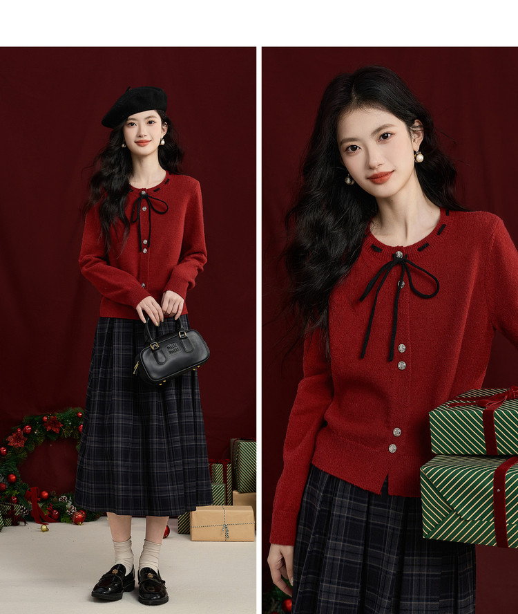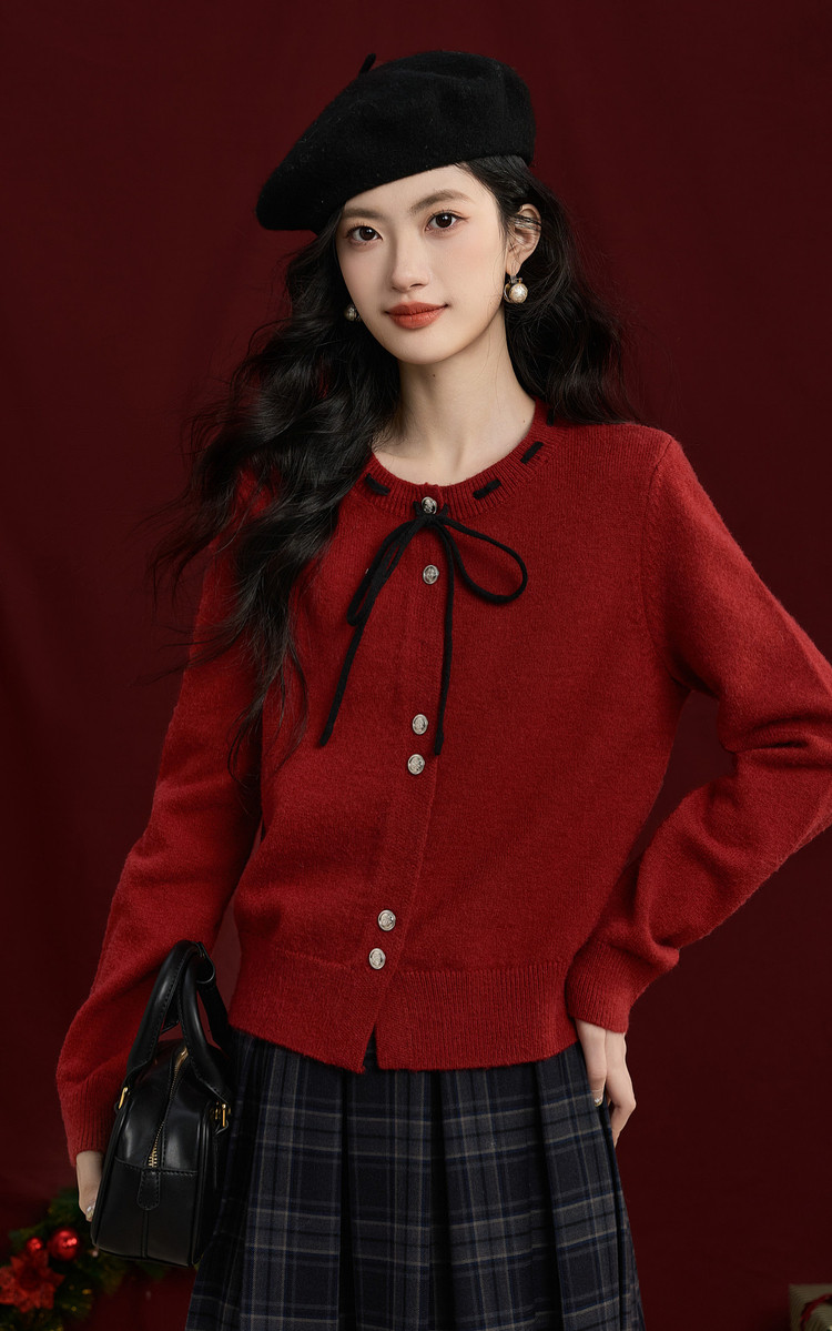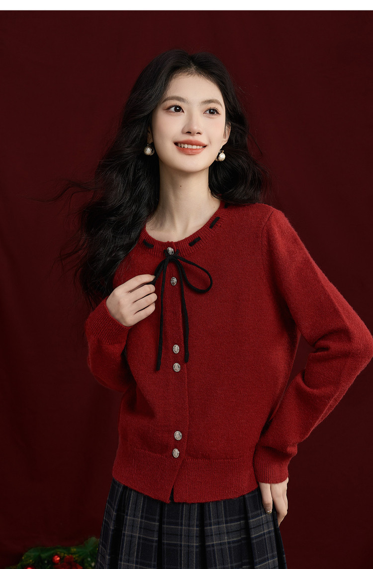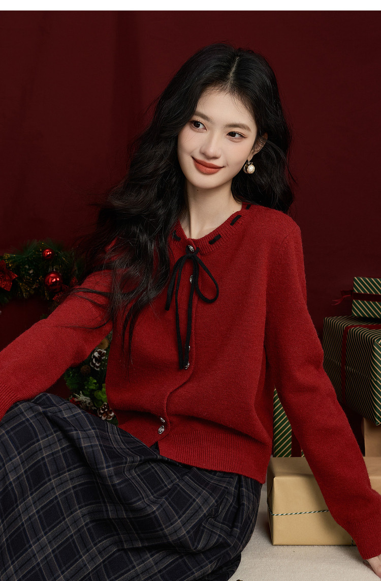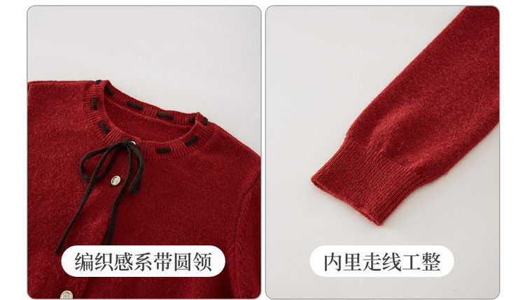 【12/31新品】熙世界氛围感本命年红色毛衣女25年秋冬新款系带圆领长袖针织开衫