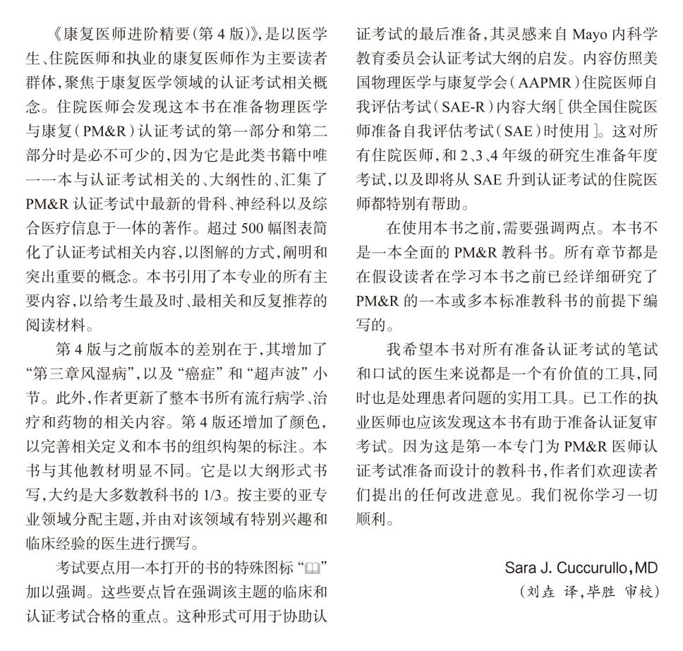 “读者可以稍花时间阅读本书,而不要速读,因为它有最新、最有价值的相关信息。《康复医师进阶精要(第4版)》有超过950页金矿。此外,许多康复医师也面临着认证复审考试,必然需要进行PM&R的综合性学习,而解决之道就是:Cuccurullo医生易读且价廉的书!”