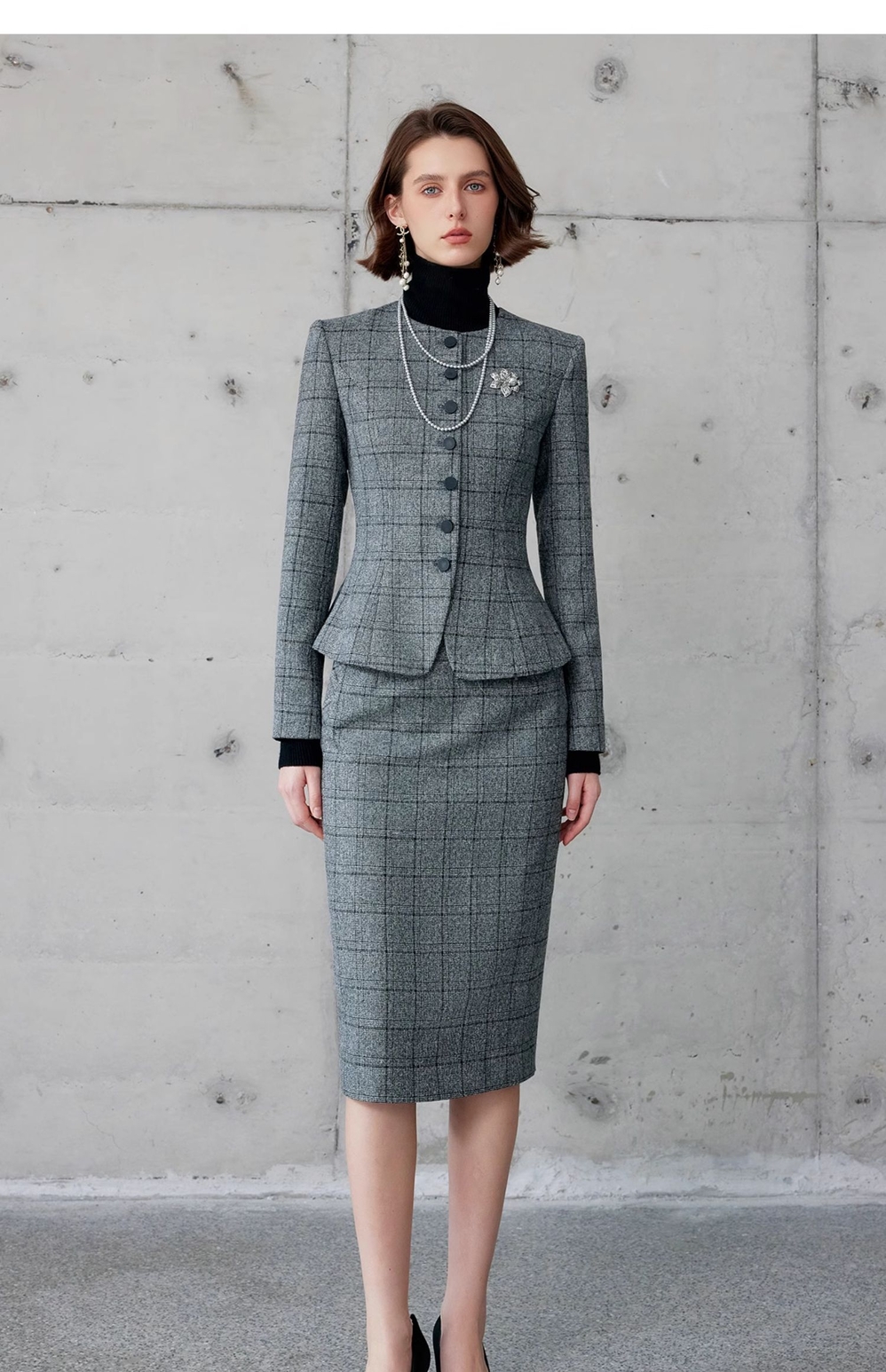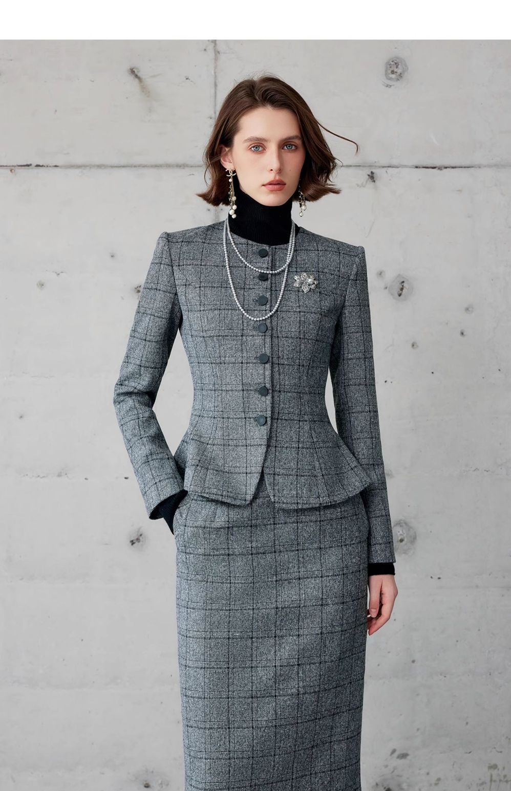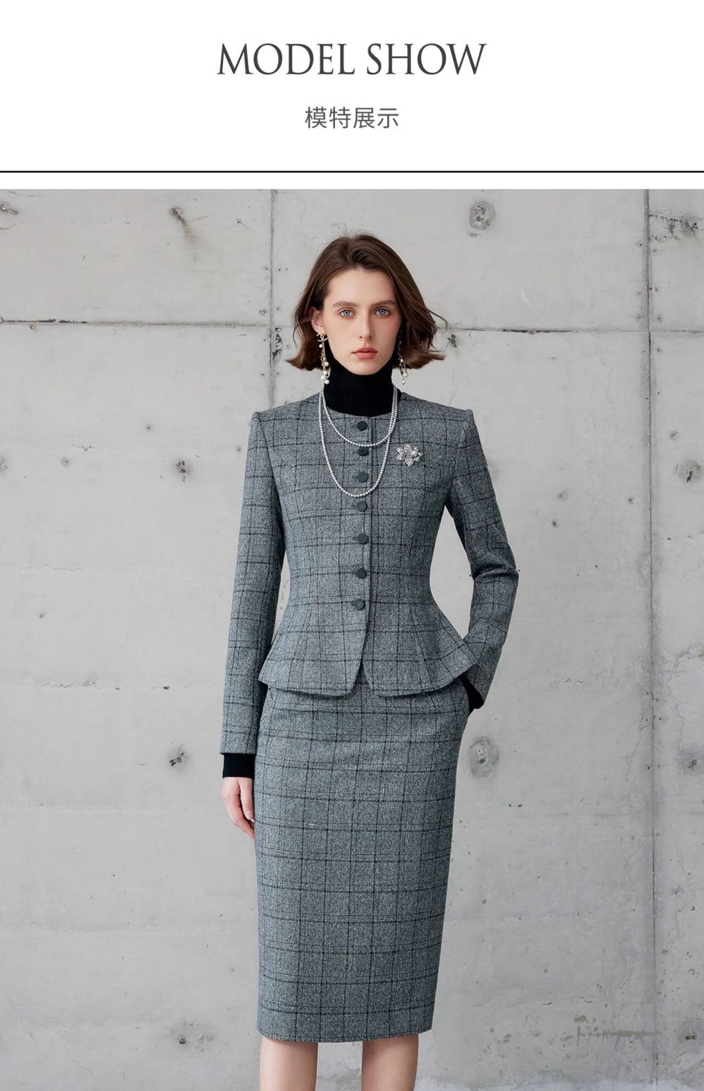 IWY/灰色格纹长袖西装套裙气质小香风时尚通勤干练两件套职业裙CS2101
