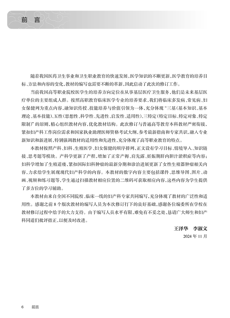 此为国家卫生健康委员会“十四五”高等职业教育专科临床医学专业规划教材之一。产科学是一门研究女性在妊娠期、分娩期以及产褥期全过程中孕产妇、胚胎及胎儿发生的生理和病理变化,并对病理改变进行预防、诊断和处理的临床医学学科。妇科学是一门研究女性非妊娠期生殖系统生理和病理改变,并对病理改变进行预防、诊断和处理的临床医学学科。计划生育学在我国是一门独立的亚学科,主要研究生育的调控,包括生育时期的选择、生育数量和间隔的控制及非意愿妊娠的预防和处理。在妇产科学教学中,要求教师充分发挥主导作用,授课条理分明,突出重点,结合国内外新动态、新成就、理论联系实际,启发学生独立思考、调动并培养他们分析问题和解决问题的能力。要始终按照三基(基本理论、基本知识和基本技能)和三严(严肃态度、严格要求和严密的方法)的要求,培养学生的自学能力。