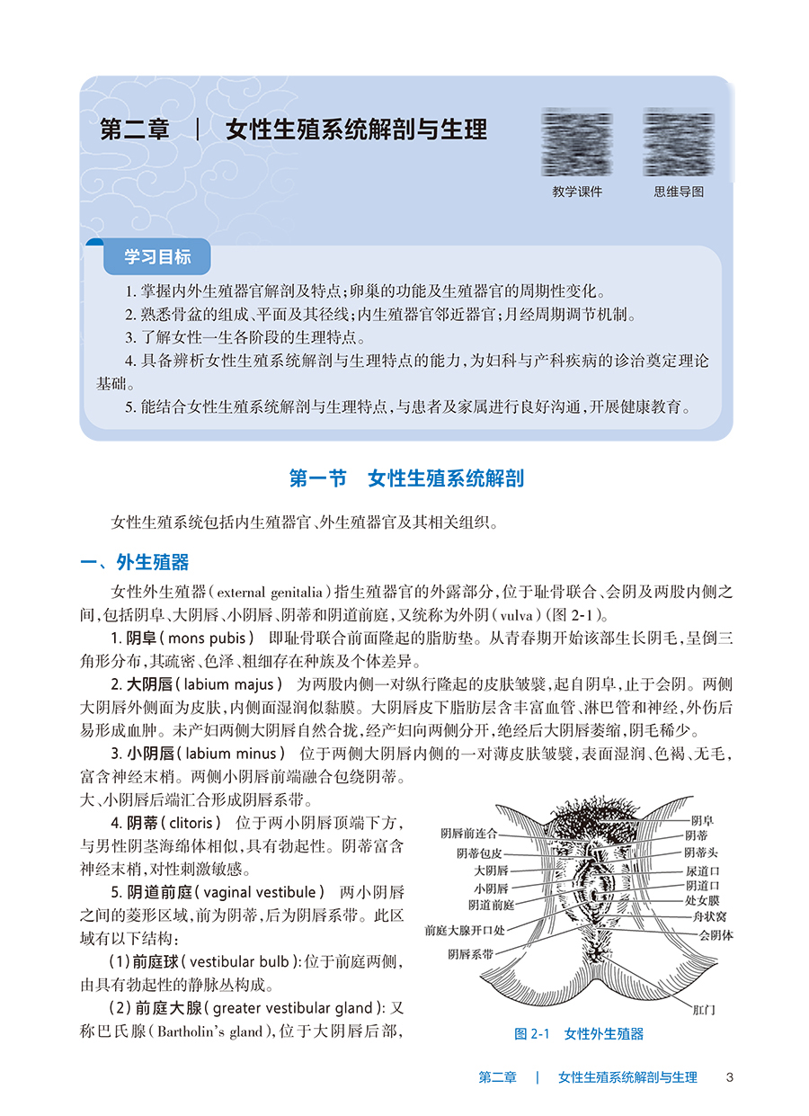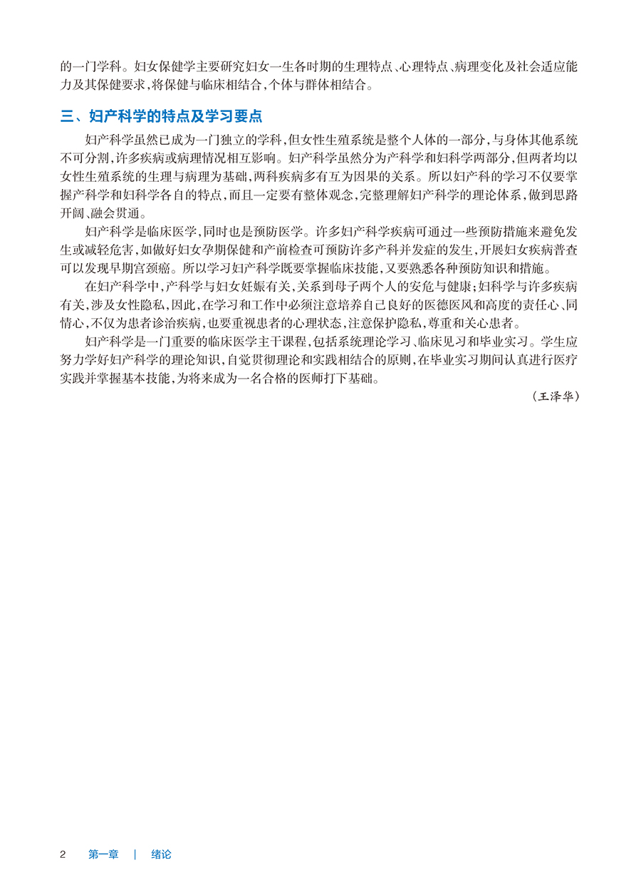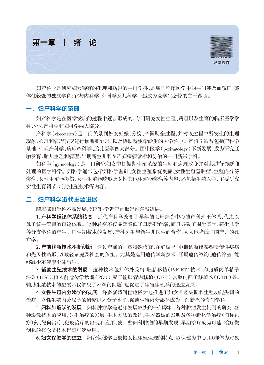 第一章 绪论 妇产科学是研究妇女特有的生理和病理的一门学科,是属于临床医学中的一门涉及面较广、整体性较强的独立学科;它与内科学、外科学及儿科学一起成为医学生必修的主干课程。 一、妇产科学的范畴 妇产科学是在医学发展的过程中逐步形成的,专门研究女性生理、病理以及生育的临床医学学科,分为产科学和妇科学两大部分。 产科学(obstetrics)是一门关系到妇女妊娠、分娩、产褥期全过程,并对该过程中所发生的生理现象、心理和病理改变进行诊断和处理,以及协助新生命诞生的医学科学。产科学通常包括产科学基础、生理产科学、病理产科学、胎儿医学四大部分。围生医学(perinatology)不断发展,成为研究胚胎发育、胎儿生理和病理、早期新生儿和孕产妇疾病诊断和防治的一门新兴学科。 妇科学(gynecology)是一门研究妇女非妊娠期生殖系统的生理和病理改变并对其进行诊断和处理的医学科学。妇科学通常包括妇科学基础、女性生殖系统炎症、女性生殖器肿瘤、生殖内分泌疾病、女性生殖器损伤、女性生殖器畸形及女性其他生殖器疾病等内容;还包括生殖医学,主要研究女性生育调节、辅助生殖技术等内容。 二、妇产科学近代重要进展 随着基础学科不断发展,妇产科学近年也取得许多新进展。 1.产科学理论体系的转变 近代产科学改变了早年的以母亲为中心的产科理论体系,代之以母子统一管理的理论体系。这种转变不仅显著降低了母婴死亡率,而且导致了围生医学、新生儿学等分支学科的产生。围生期技术的发展,产科医生与新生儿医生的合作,大大地降低了围产儿的死亡率。 2.产前诊断技术不断创新 通过产前的一些特殊检查,在妊娠早、中期诊断出某些遗传性疾病和先天性畸形,以减轻家庭及社会的负担。尤其是运用遗传学新技术,开展遗传咨询、遗传筛查,能够减少不健康个体出生。 3.辅助生殖技术的发展 这种技术包括体外受精-胚胎移植(IVF-ET)技术,卵胞质内单精子注射(ICSI)、植入前遗传学诊断(PGD)、配子输卵管内移植(GIFT)、宫腔内配子移植术(GIUT)等。辅助生殖技术的进展不仅解决了不孕的问题,也促进了生殖生理学的迅速发展。 4.女性生殖内分泌学的发展 许多新药问世也极大地推进了妇女月经失调和生殖功能失调的治疗。研究进入分子水平,促使生殖内分泌学成为一门新兴的专门学科。 5.妇科肿瘤学的发展 妇科肿瘤学是近年发展较快的一门学科,各种肿瘤发生机制的研究,各种影像技术的应用,放射治疗的发展,手术方法的改进,手术器械的发明及各种新化学治疗(简称化疗)药、靶向治疗、免疫治疗的出现和应用,使一些妇科肿瘤的早期发现、早期治疗成为可能,治疗微创化的概念及技术得到广泛应用。 6.妇女保健学的建立 妇女保健学是根据女性生殖生理的特点,以保健为中心,以群体为对象的一门学科。妇女保健学主要研究妇女一生各时期的生理特点、心理特点、病理变化及社会适应能力及其保健要求,将保健与临床相结合,个体与群体相结合。 三、妇产科学的特点及学习要点 妇产科学虽然已成为一门独立的学科,但女性生殖系统是整个人体的一部分,与身体其他系统不可分割,许多疾病或病理情况相互影响。妇产科学虽然分为产科学和妇科学两部分,但两者均以女性生殖系统的生理与病理为基础,两科疾病多有互为因果的关系。所以妇产科的学习不仅要掌握产科学和妇科学各自的特点,而且一定要有整体观念,完整理解妇产科学的理论体系,做到思路开阔、融会贯通。 妇产科学是临床医学,同时也是预防医学。许多妇产科学疾病可通过一些预防措施来避免发生或减轻危害,如做好妇女孕期保健和产前检查可预防许多产科并发症的发生,开展妇女疾病普查可以发现早期宫颈癌。所以学习妇产科学既要掌握临床技能,又要熟悉各种预防知识和措施。 在妇产科学中,产科学与妇女妊娠有关,关系到母子两个人的安危与健康;妇科学与许多疾病有关,涉及女性隐私,因此,在学习和工作中必须注意培养自己良好的医德医风和高度的责任心、同情心,不仅为患者诊治疾病,也要重视患者的心理状态,注意保护隐私,尊重和关心患者。 妇产科学是一门重要的临床医学主干课程,包括系统理论学习、临床见习和毕业实习。学生应努力学好妇产科学的理论知识,自觉贯彻理论和实践相结合的原则,在毕业实习期间认真进行医疗实践并掌握基本技能,为将来成为一名合格的医师打下基础。