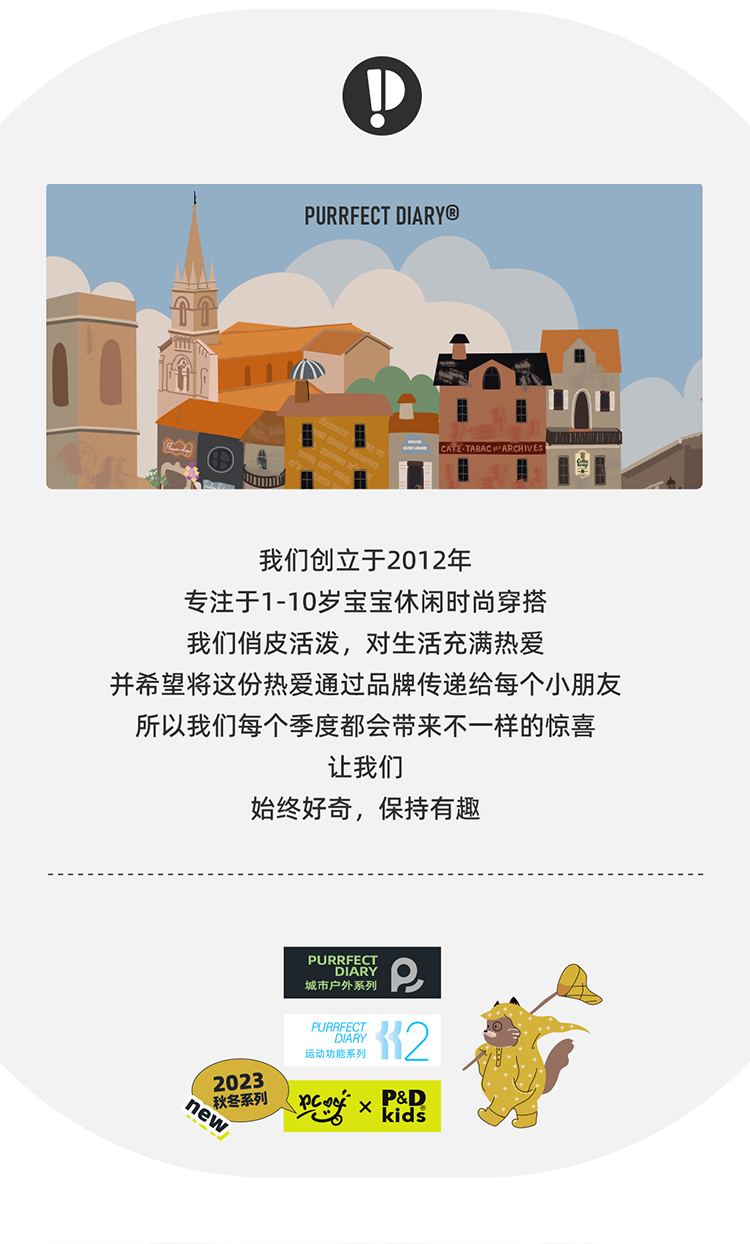 - Purrfect-Diary专注于贴近自然随性的穿着概念,轻奢平价的童装文化传播,在产品设计上更加注重婴童穿着的舒适性、安全性、更出众的国际化品牌,将欧美的育婴文化在中国进行深入的传播与推广。