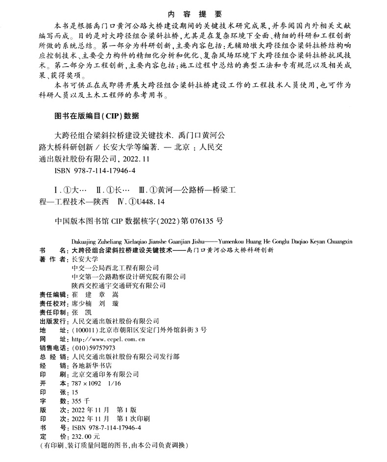 书名:大跨径组合梁斜拉桥建设关键技术——禹门口黄河公路大桥科研创新