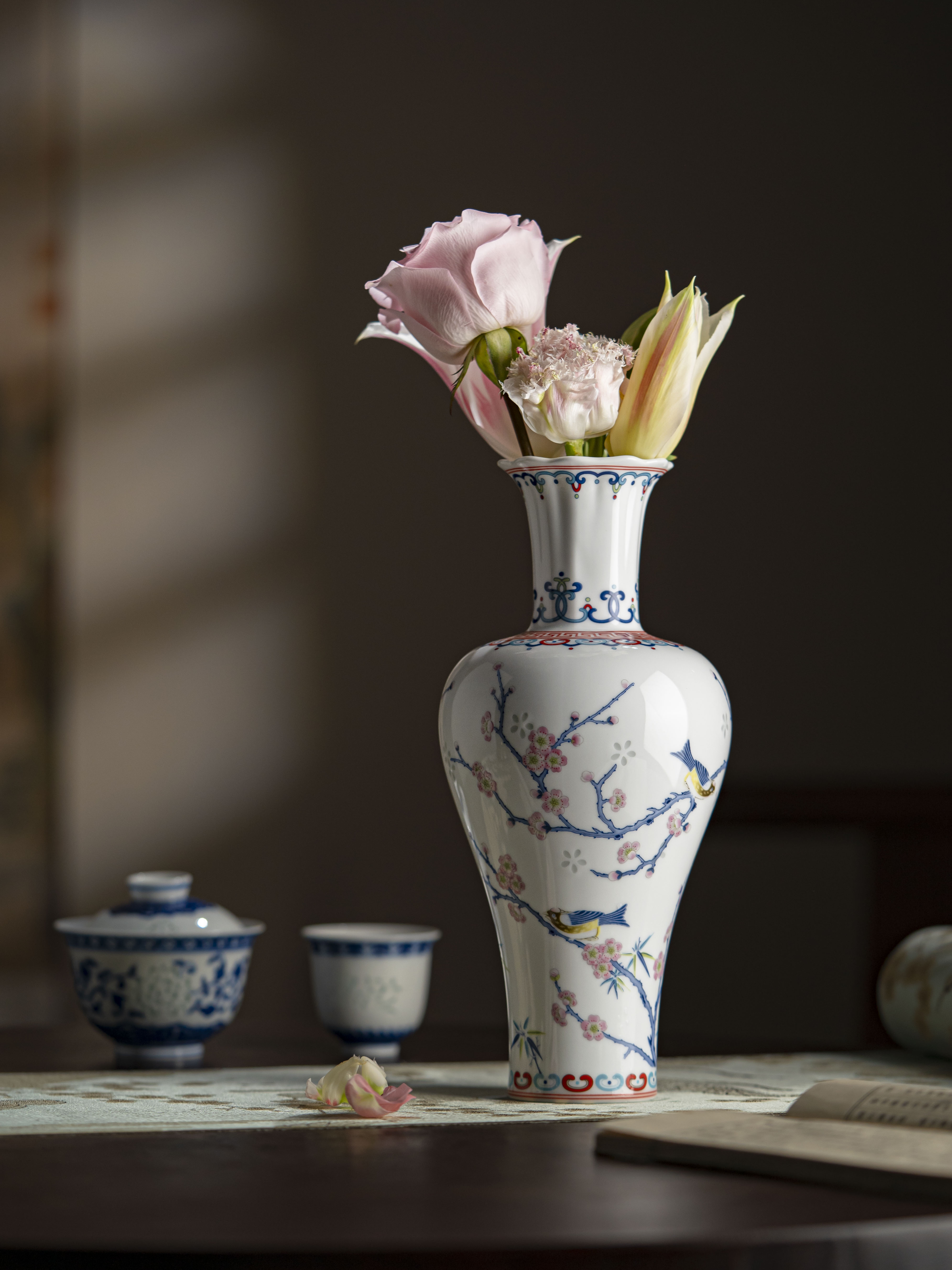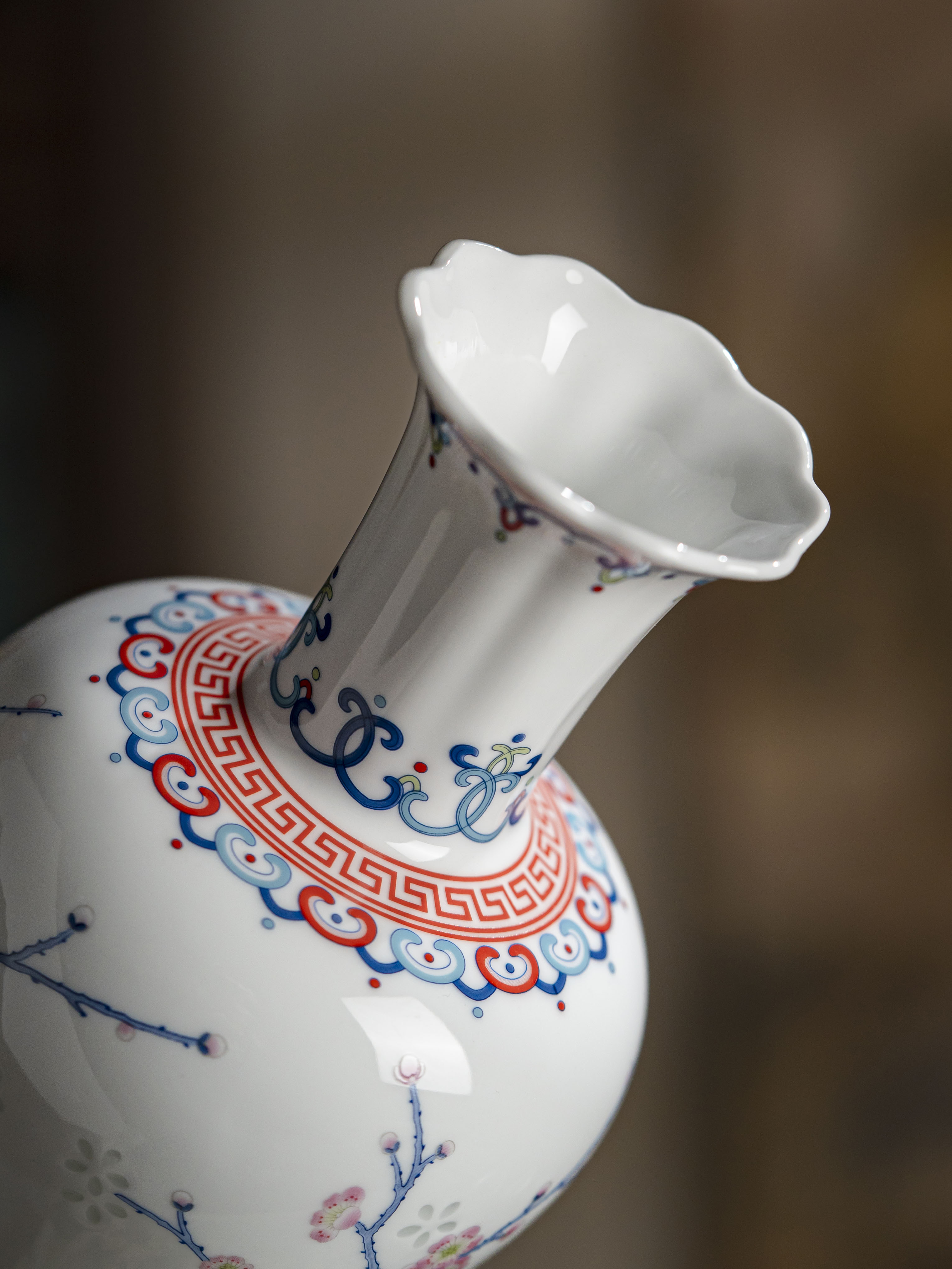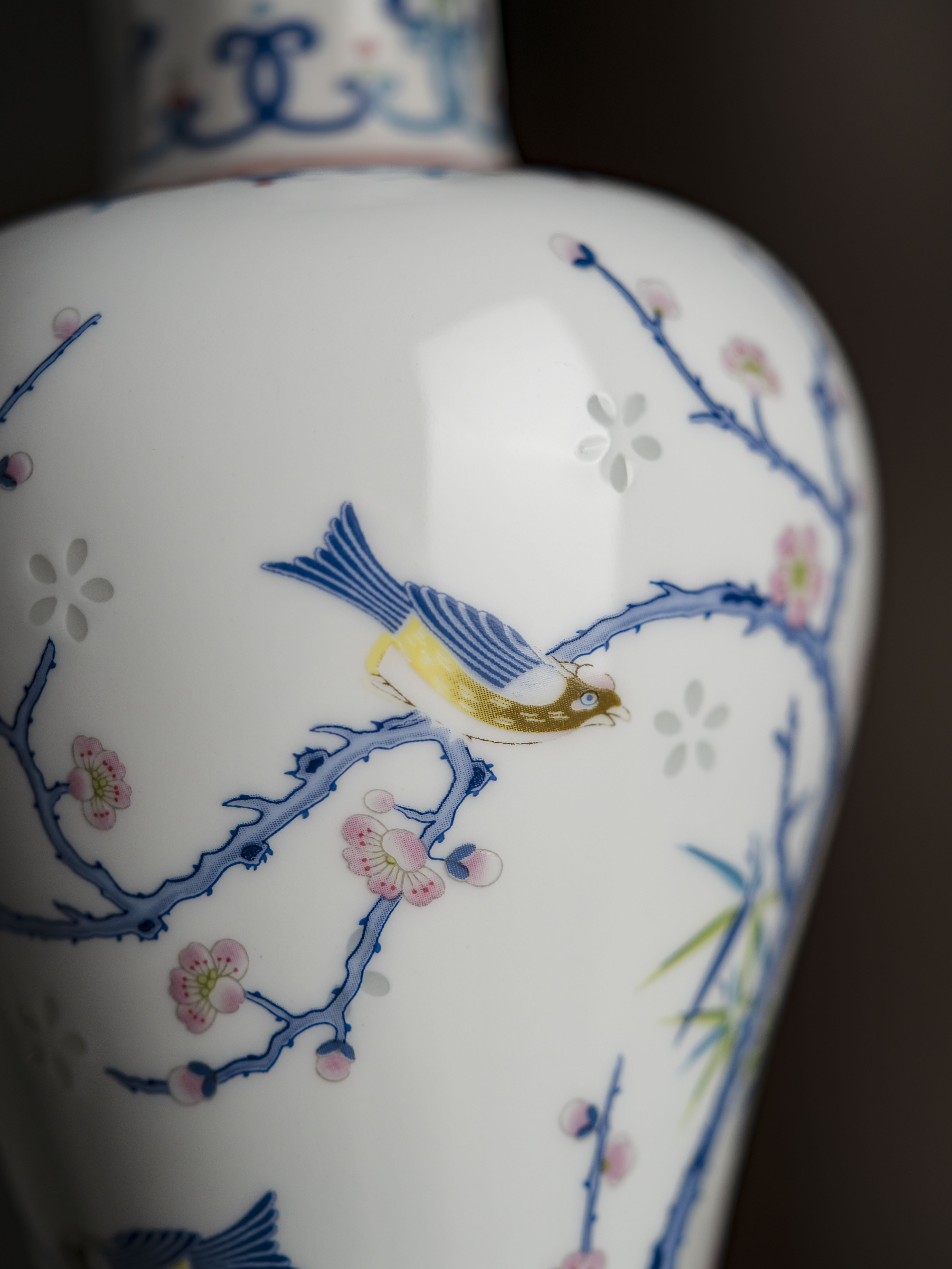 富玉景德镇陶瓷花瓶中式粉彩玲珑客厅插花高档家居摆件梅雀报喜凤尾瓶