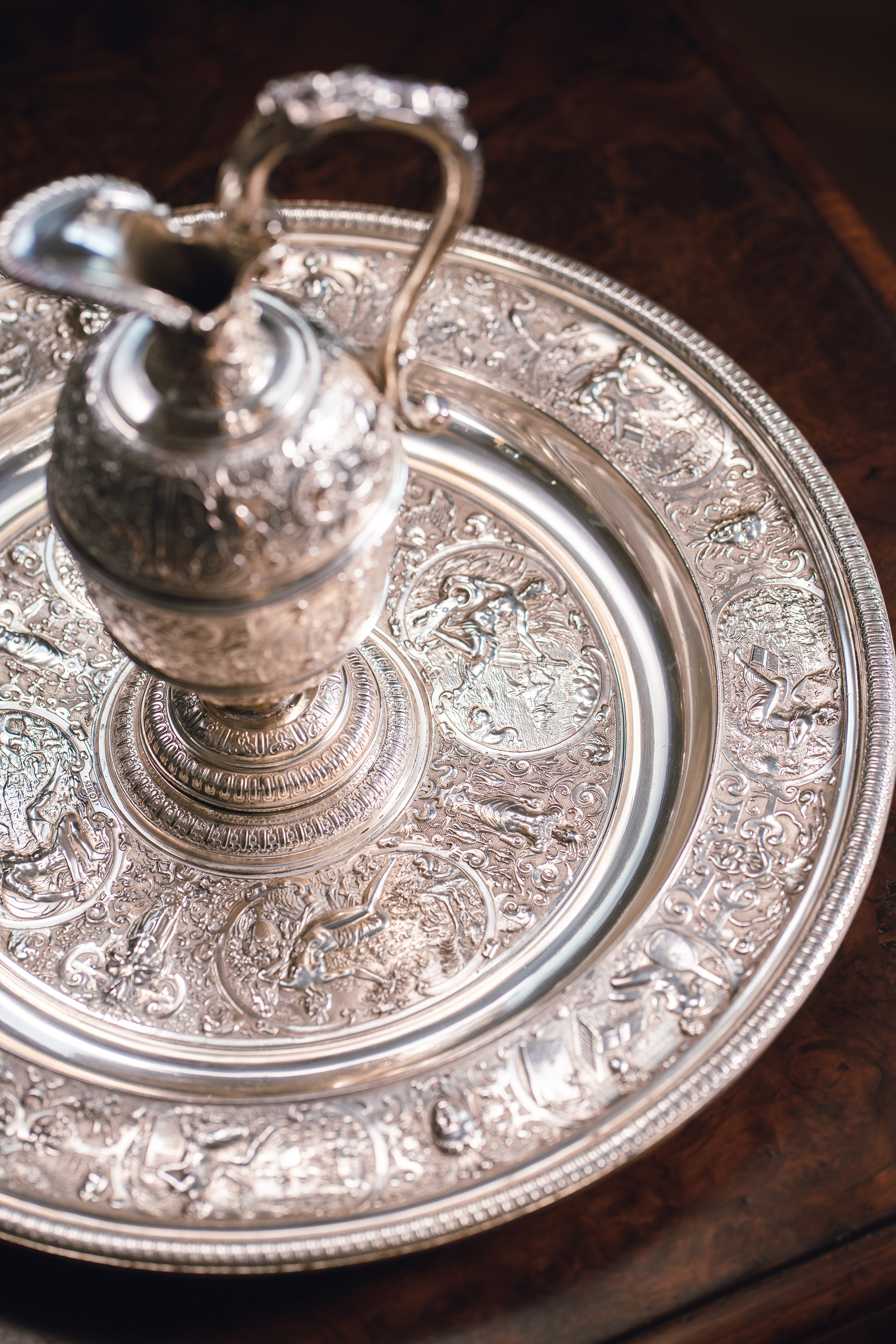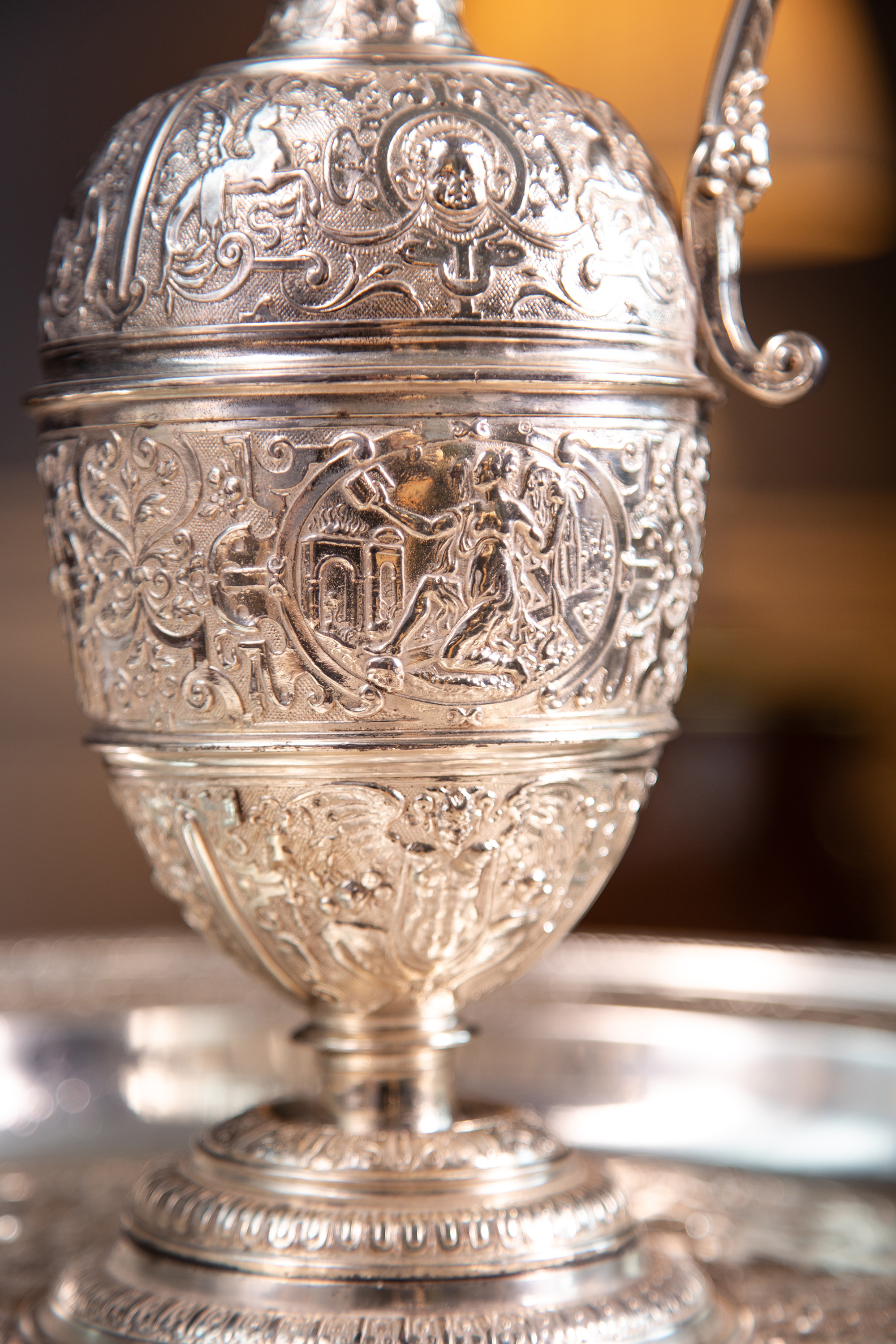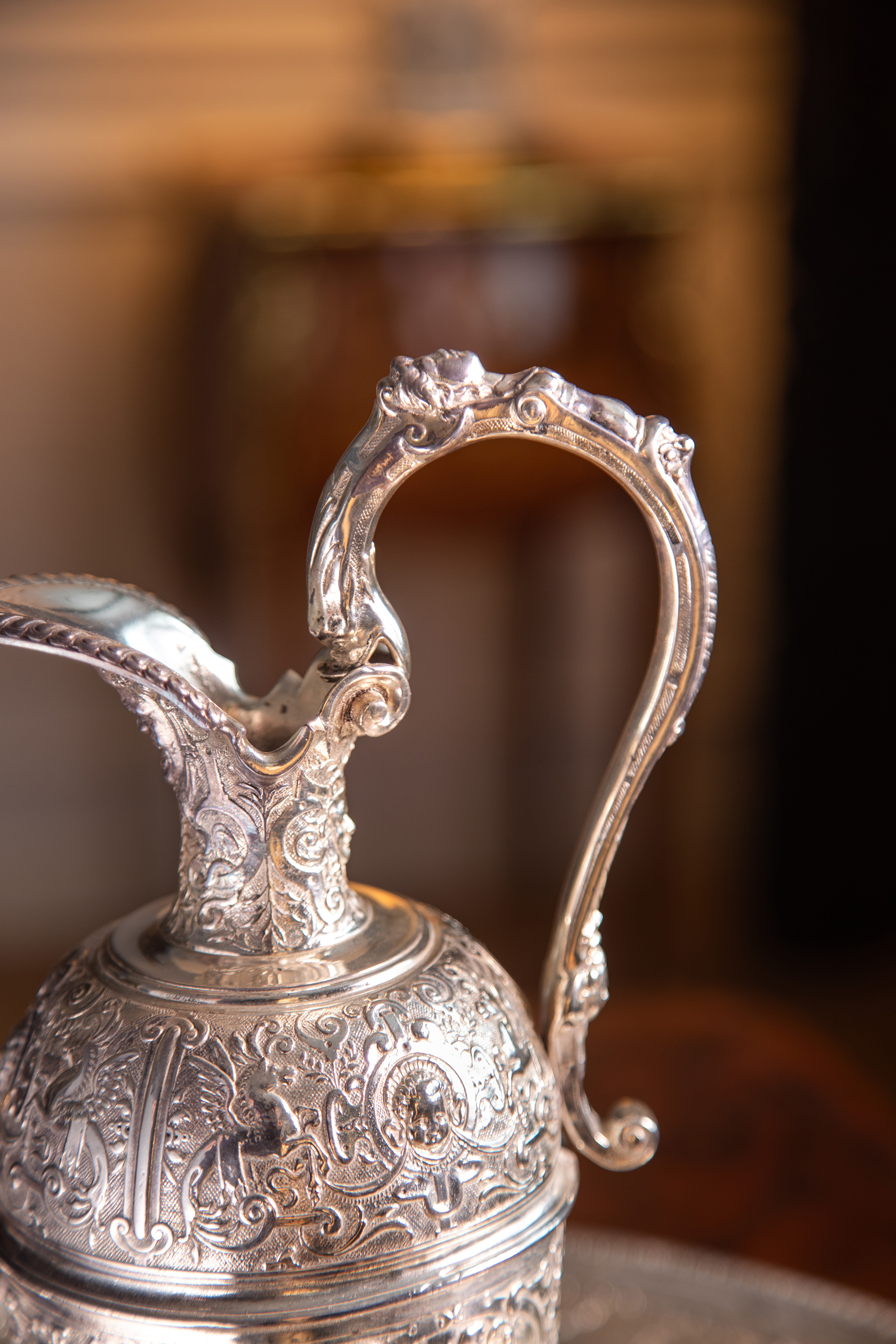 独角鹿西洋古董1890年代法国工匠François Briot设计UCAD装饰艺术中央联盟出品节制女神与天马神话主题铜镀银精雕酒壶及托盘套件