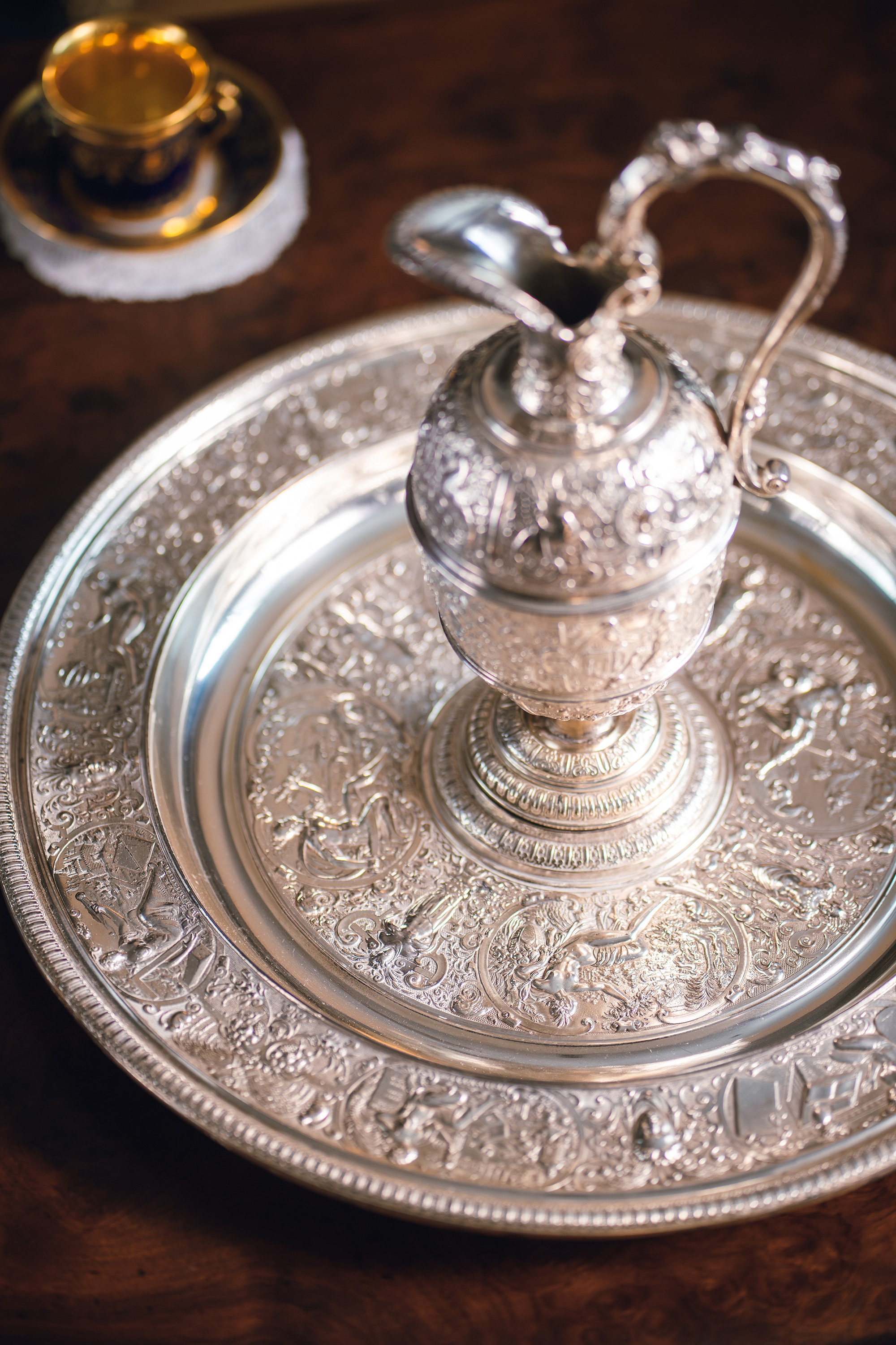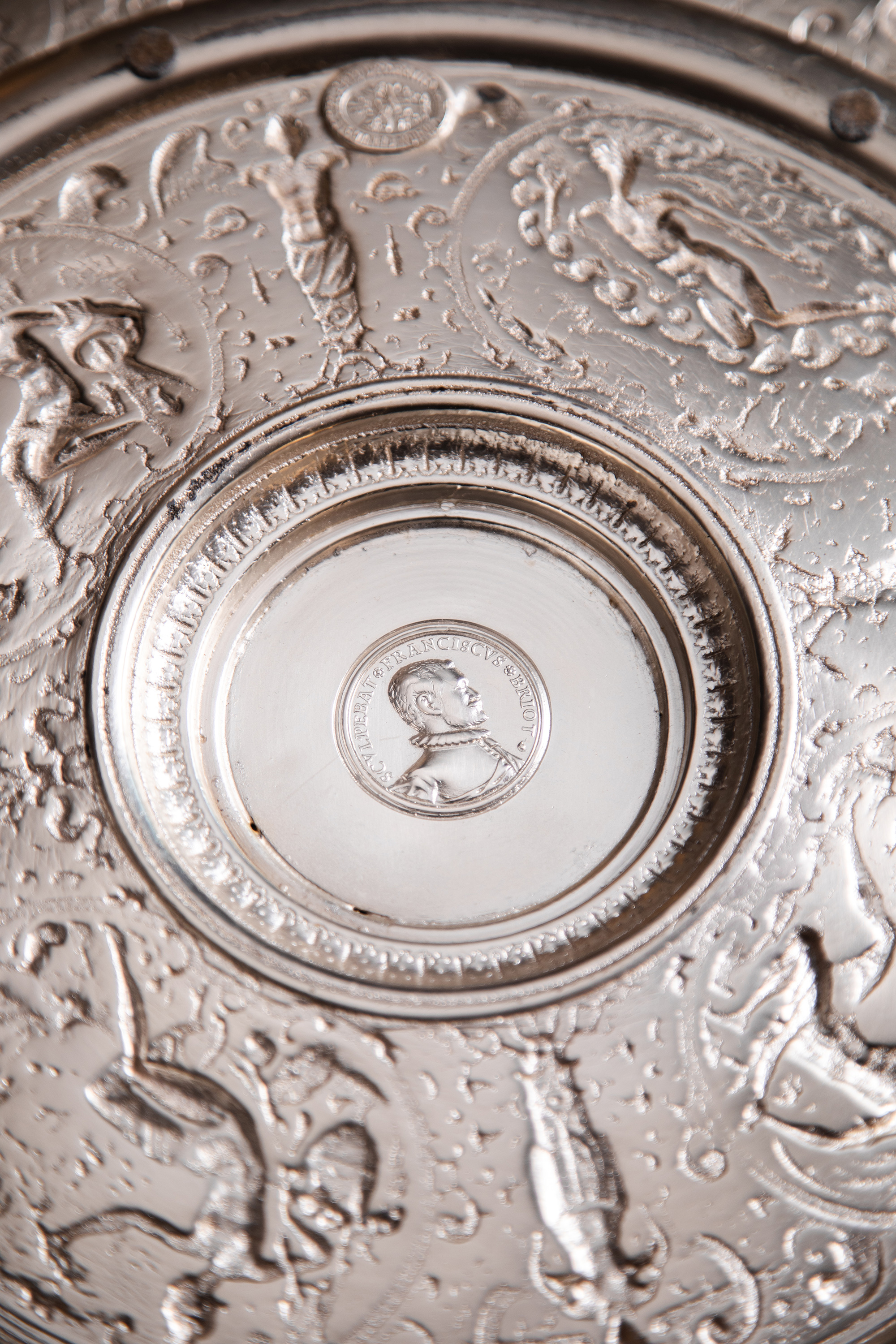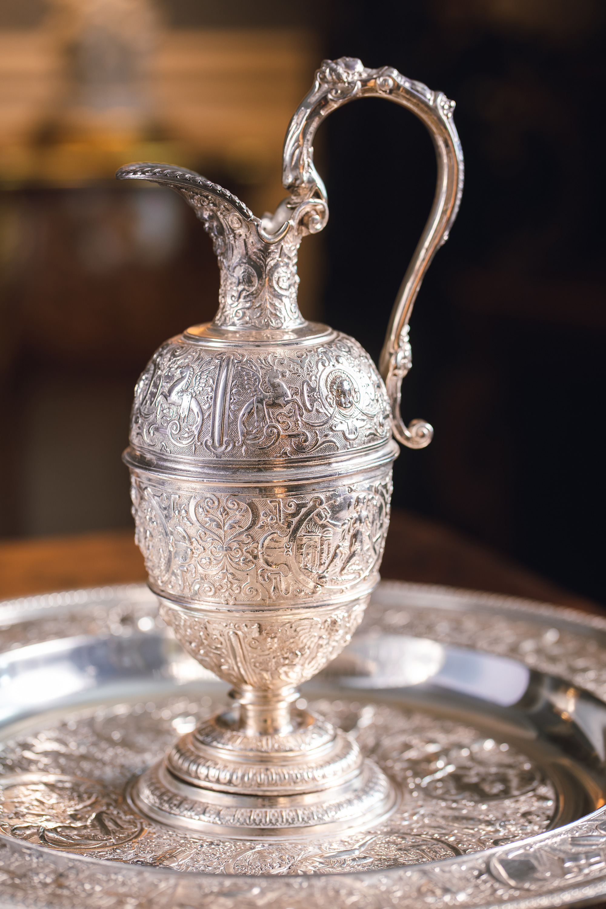 独角鹿西洋古董1890年代法国工匠François Briot设计UCAD装饰艺术中央联盟出品节制女神与天马神话主题铜镀银精雕酒壶及托盘套件