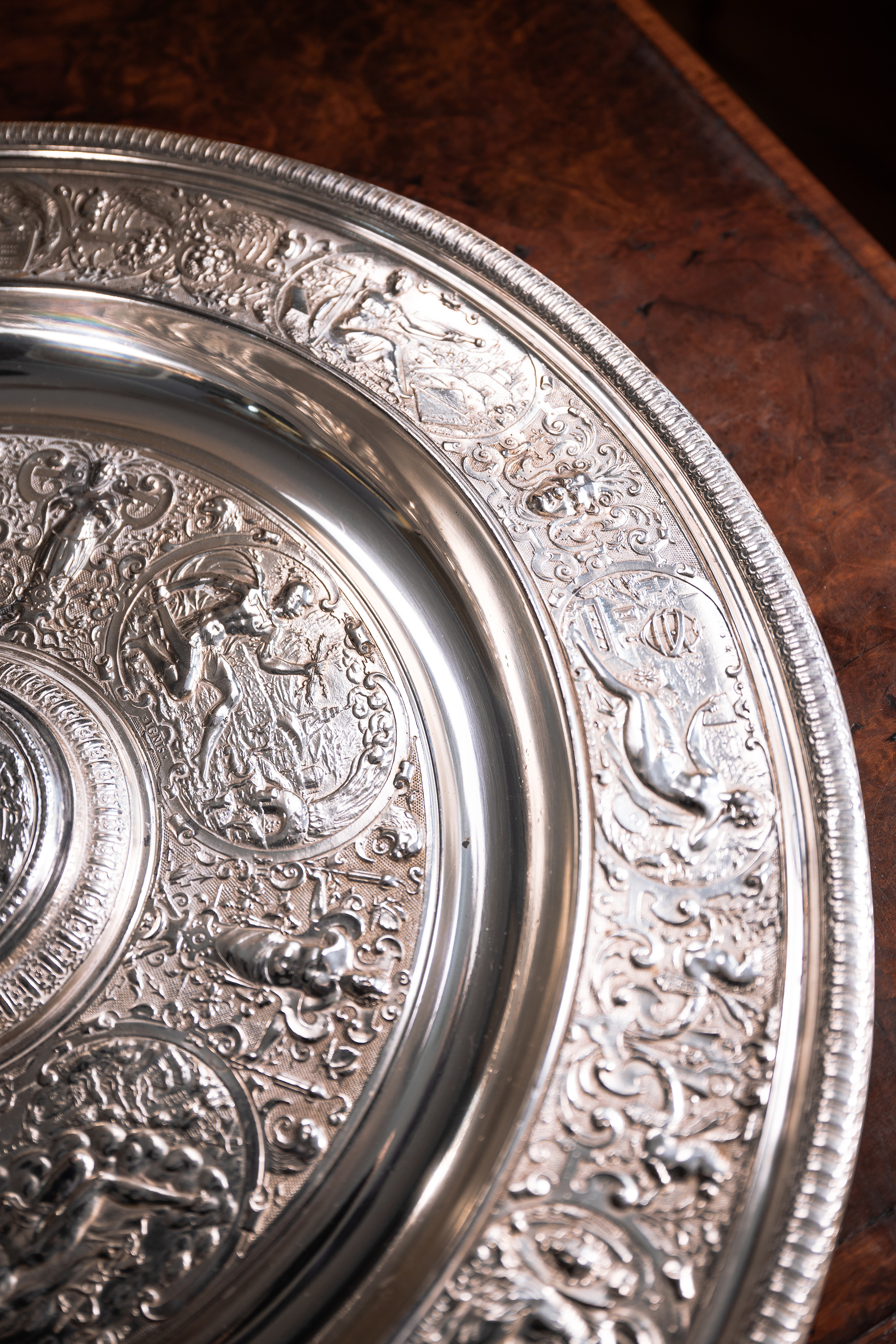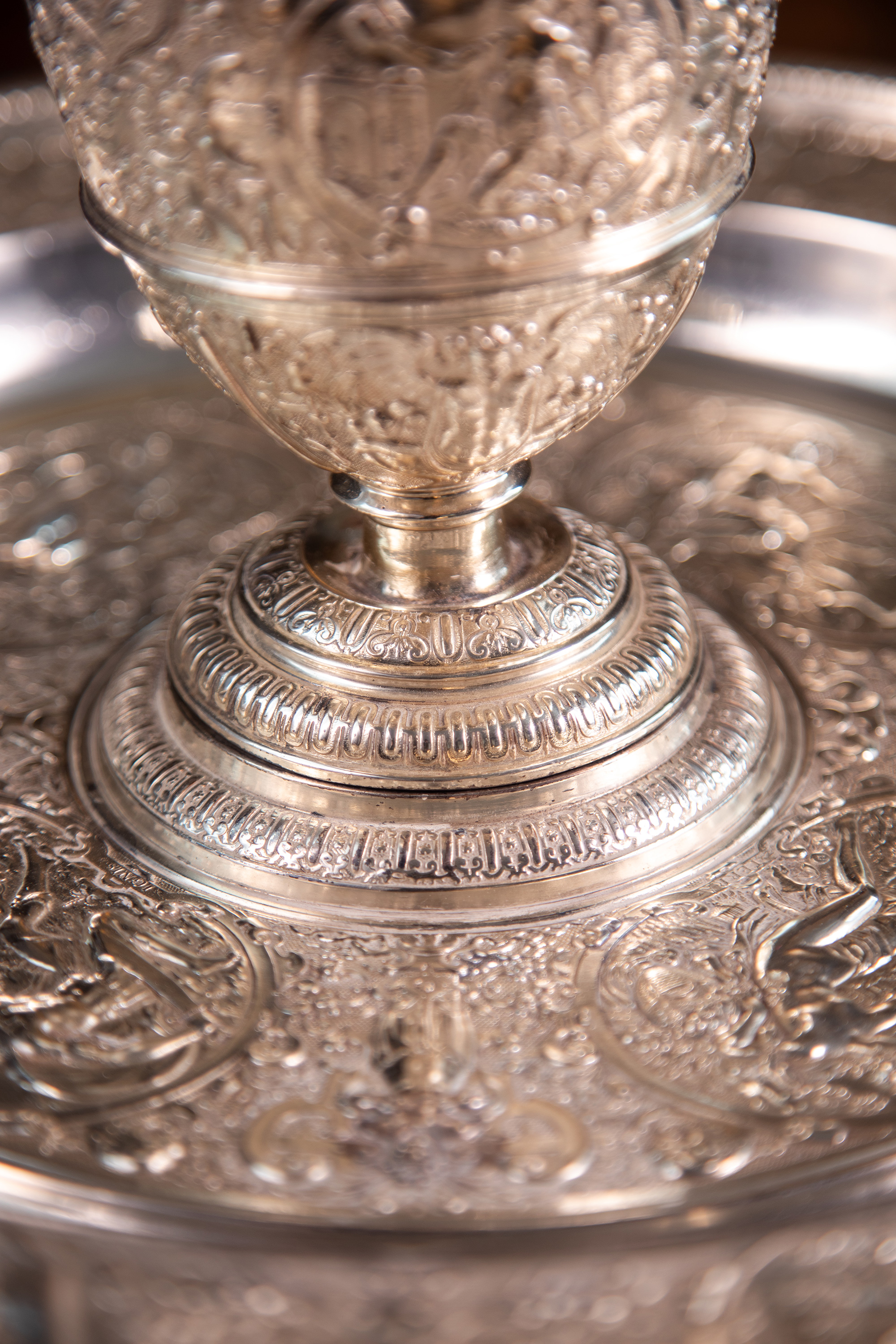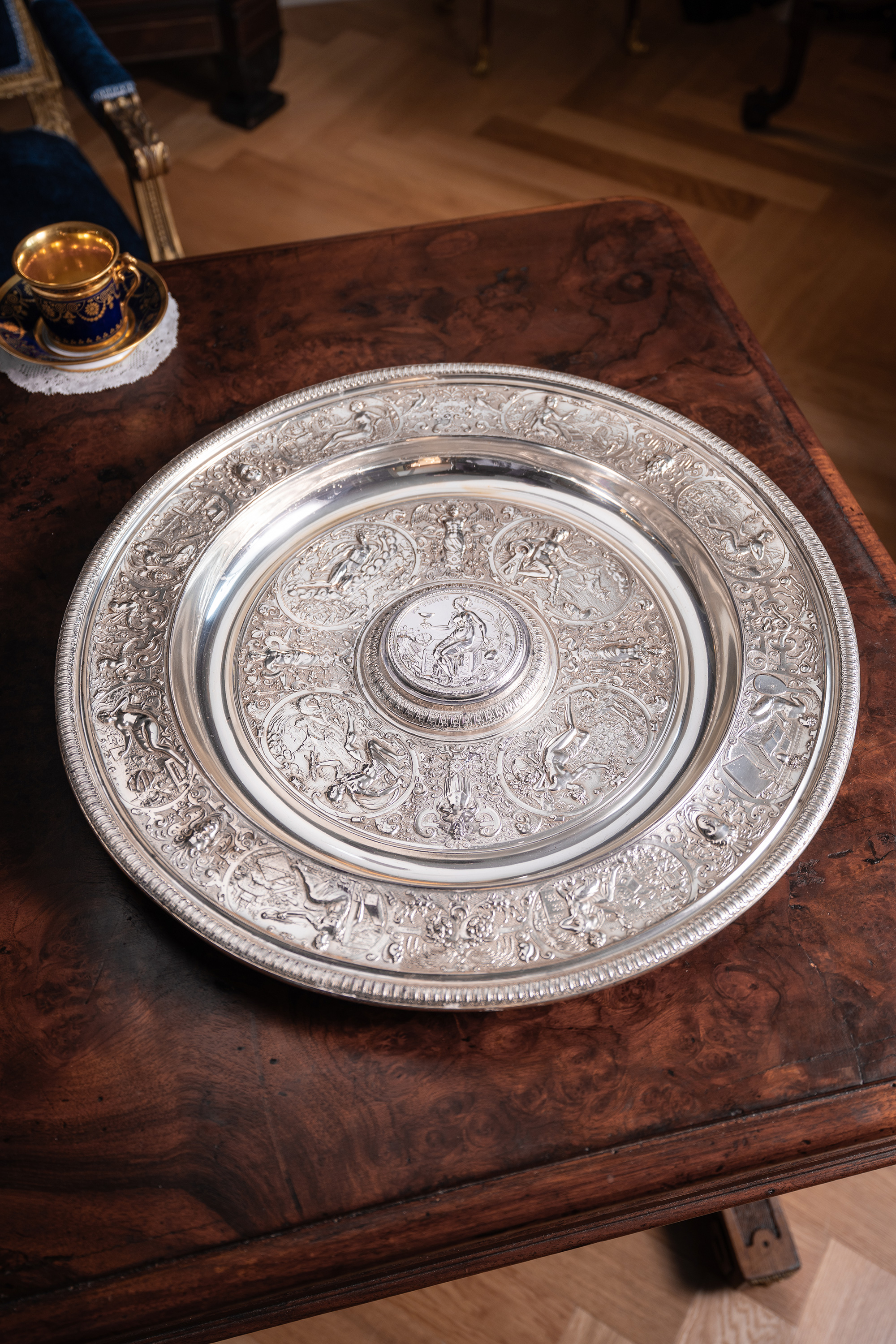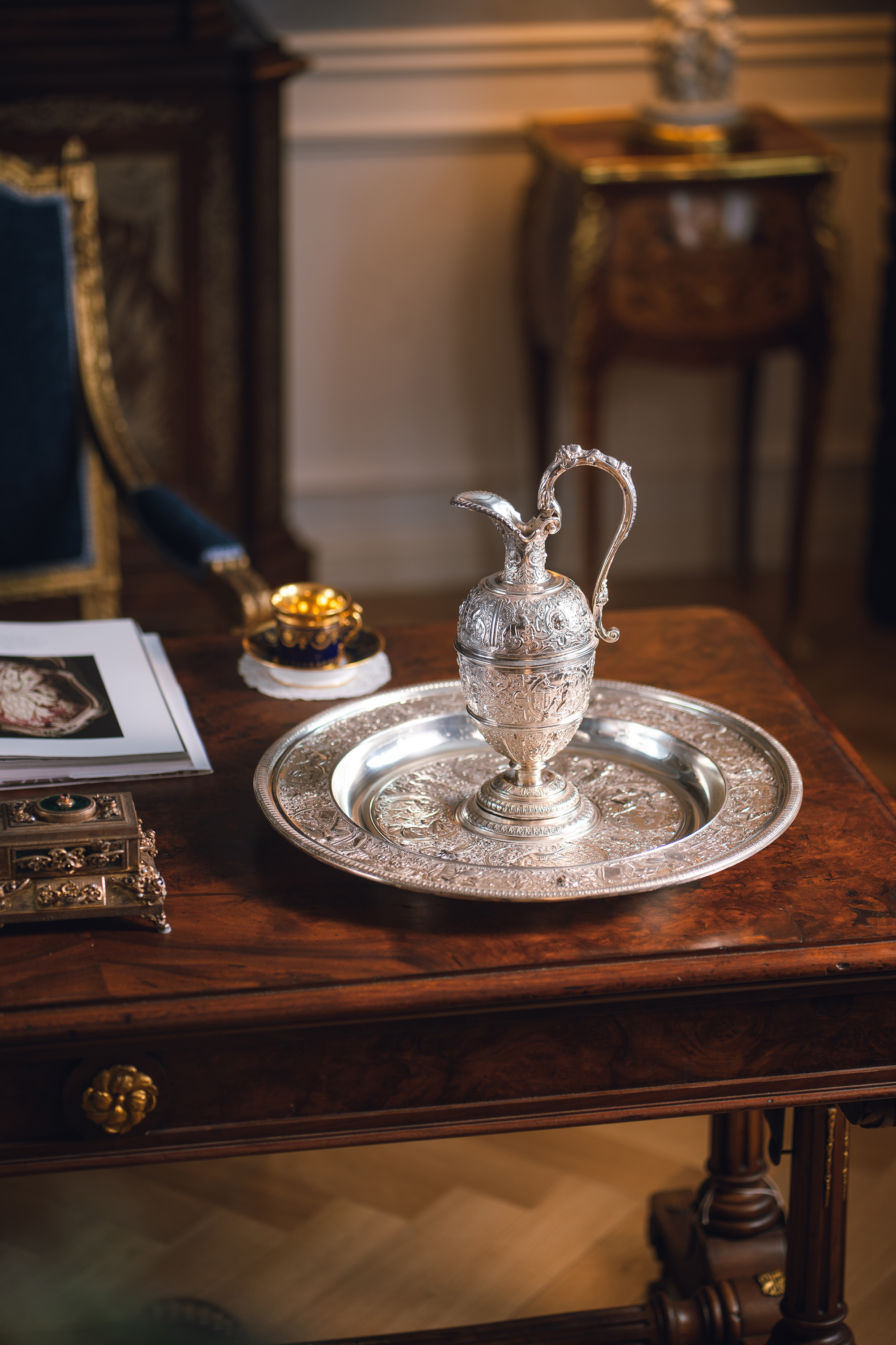 1890年代法国工匠François Briot设计UCAD装饰艺术中央联盟出品节制女神与天马神话主题铜镀银精雕酒壶及托盘套件