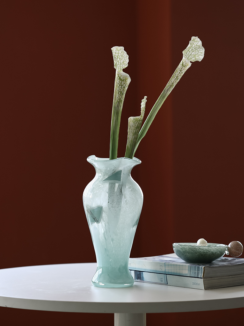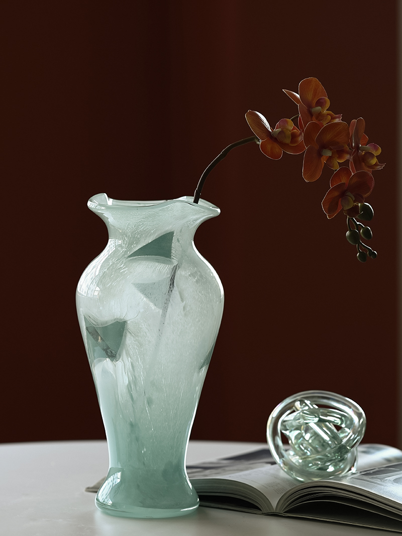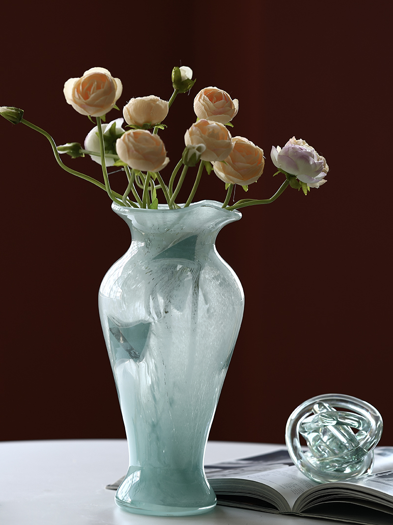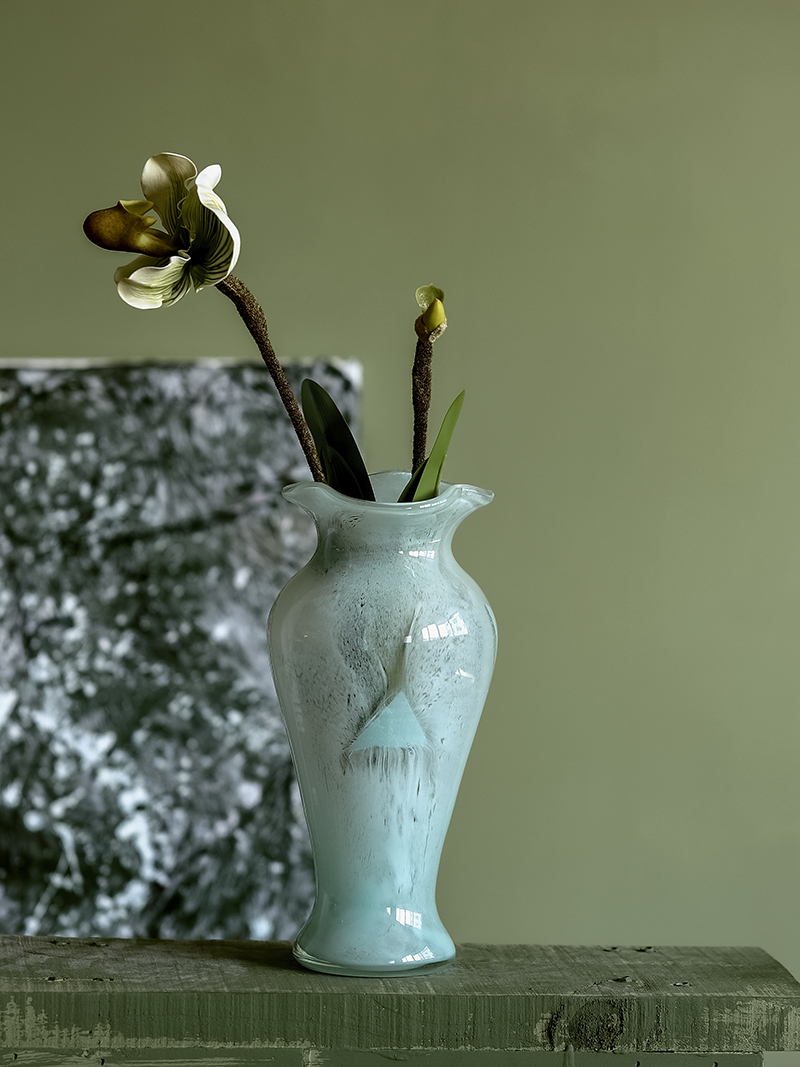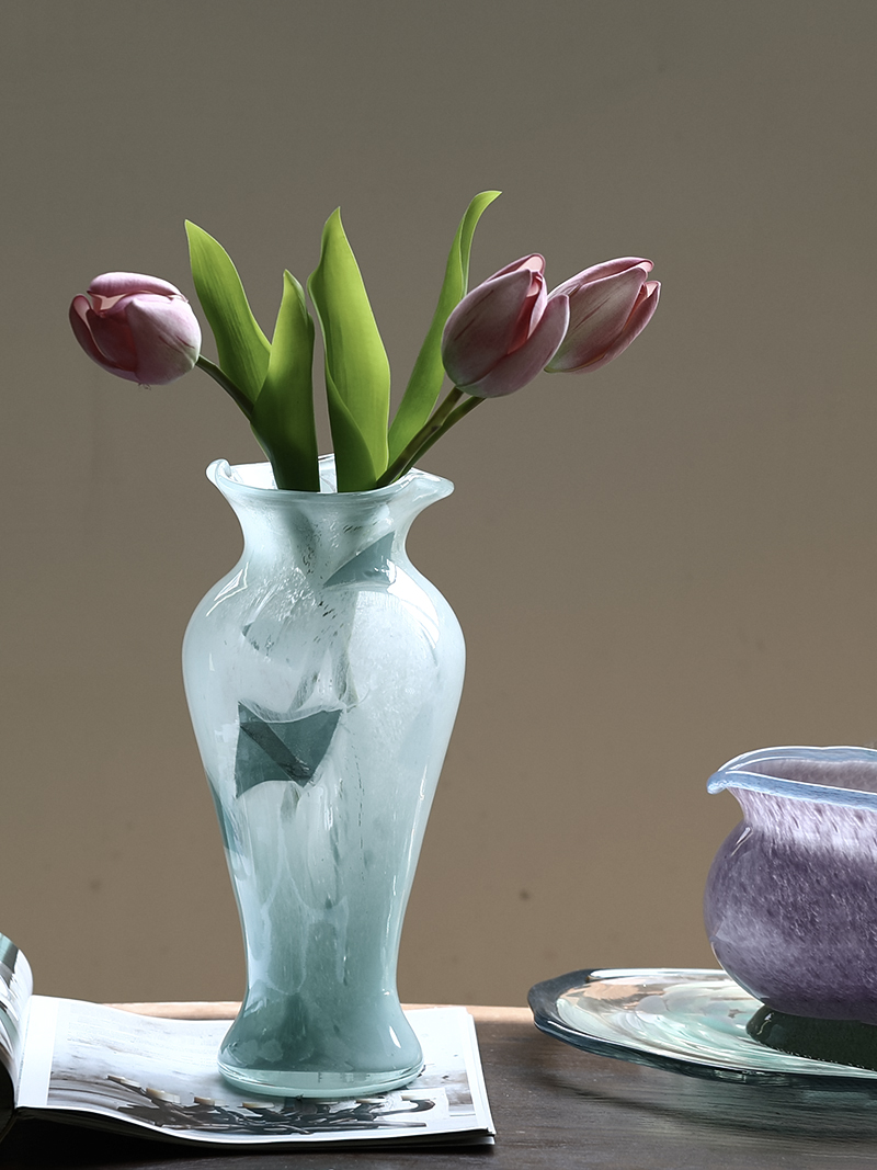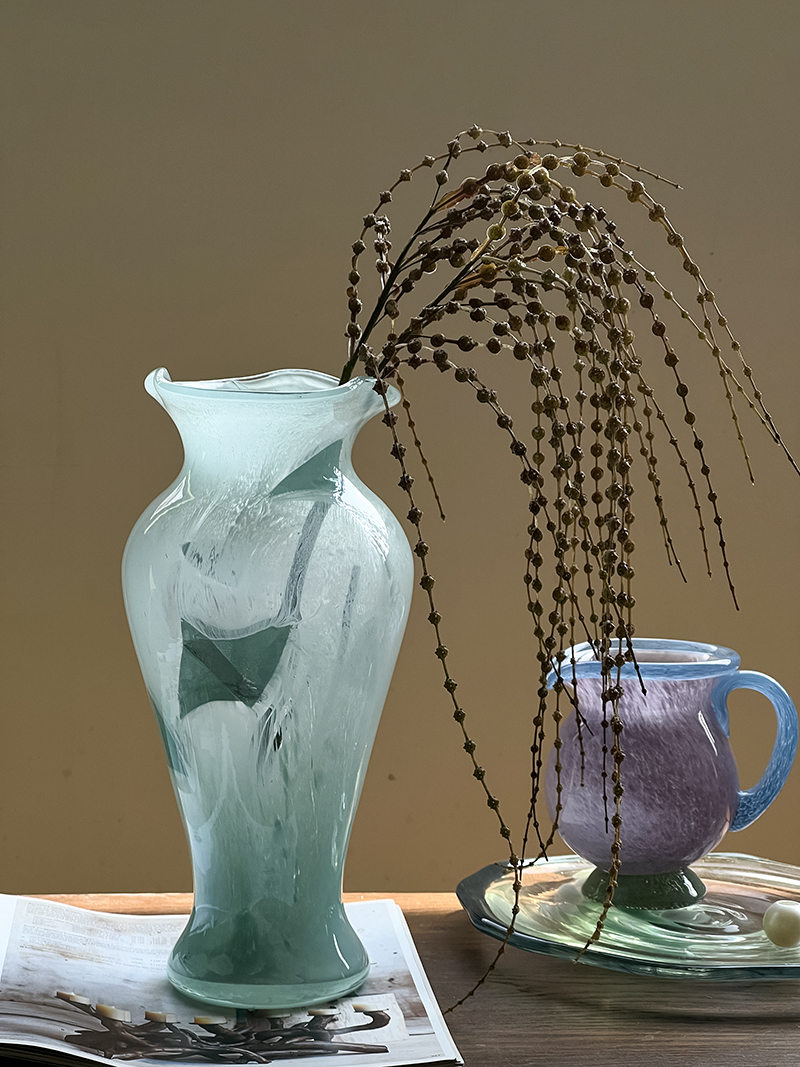 中古玻璃混彩圆形高脚花瓶酒店样板房干花鲜花复古轻奢软装摆件