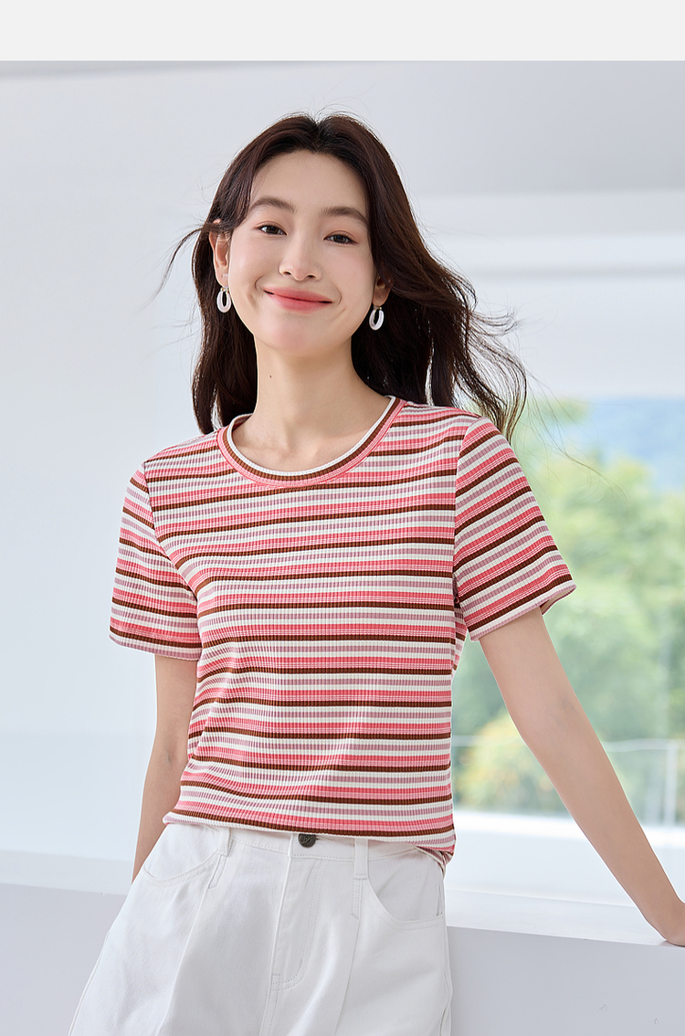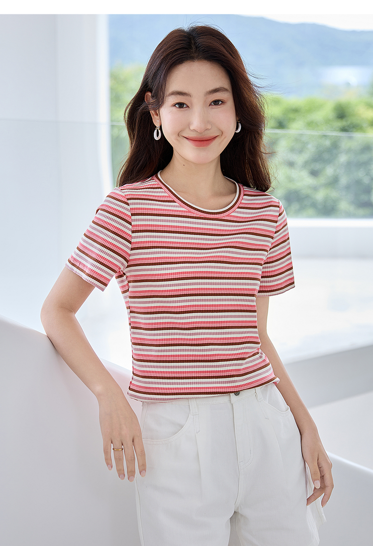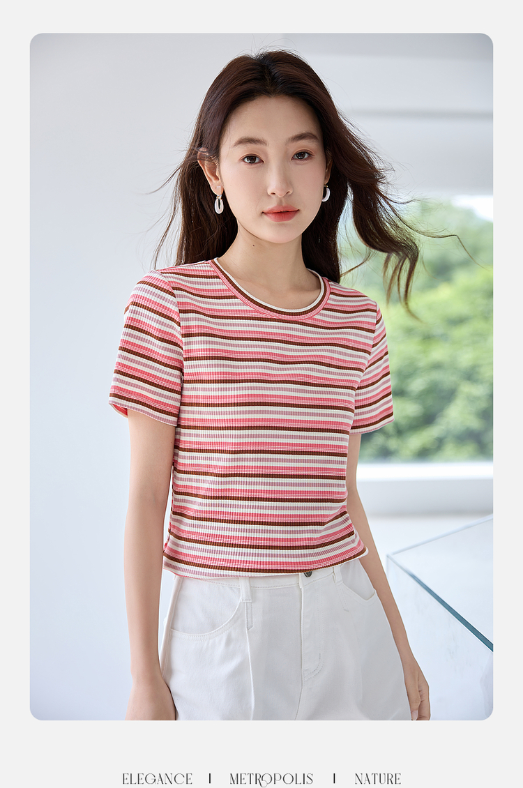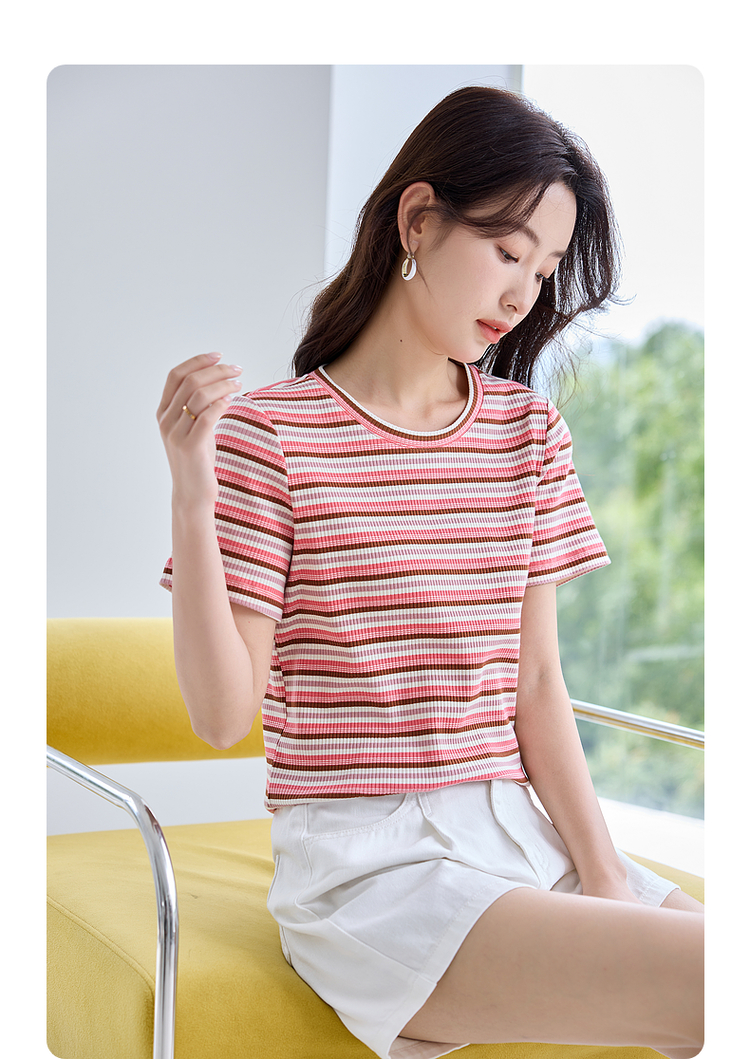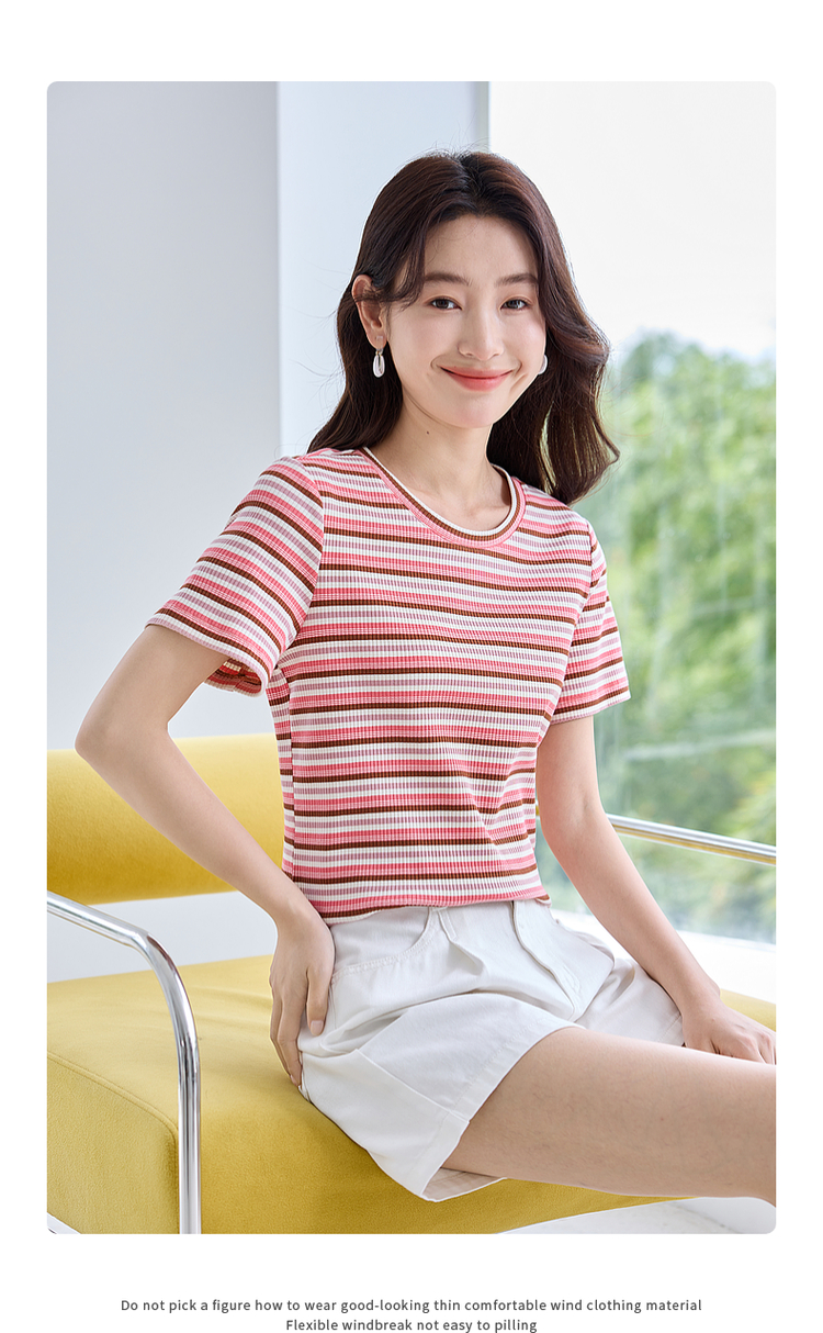 【专属特价】熙世界多巴胺条纹t恤女短袖2025夏季薄款针织体恤圆领正肩上衣