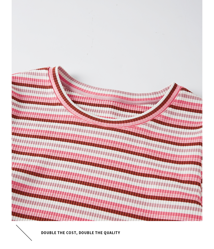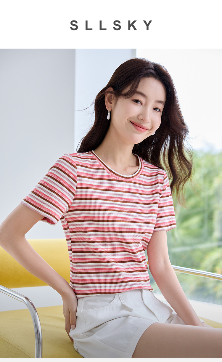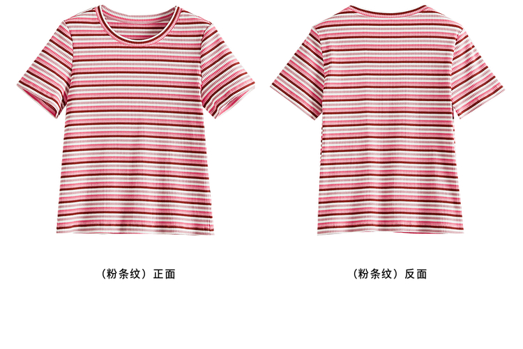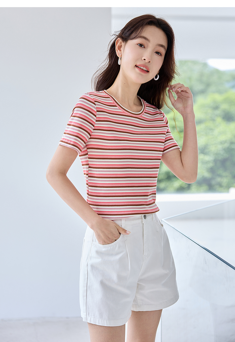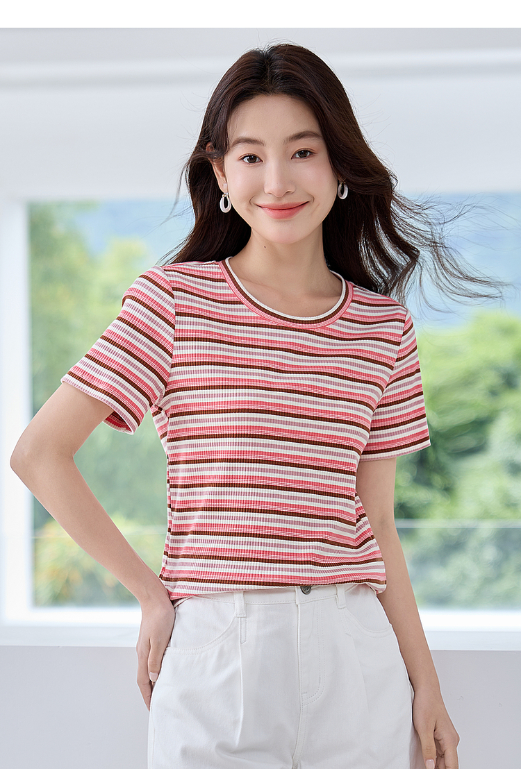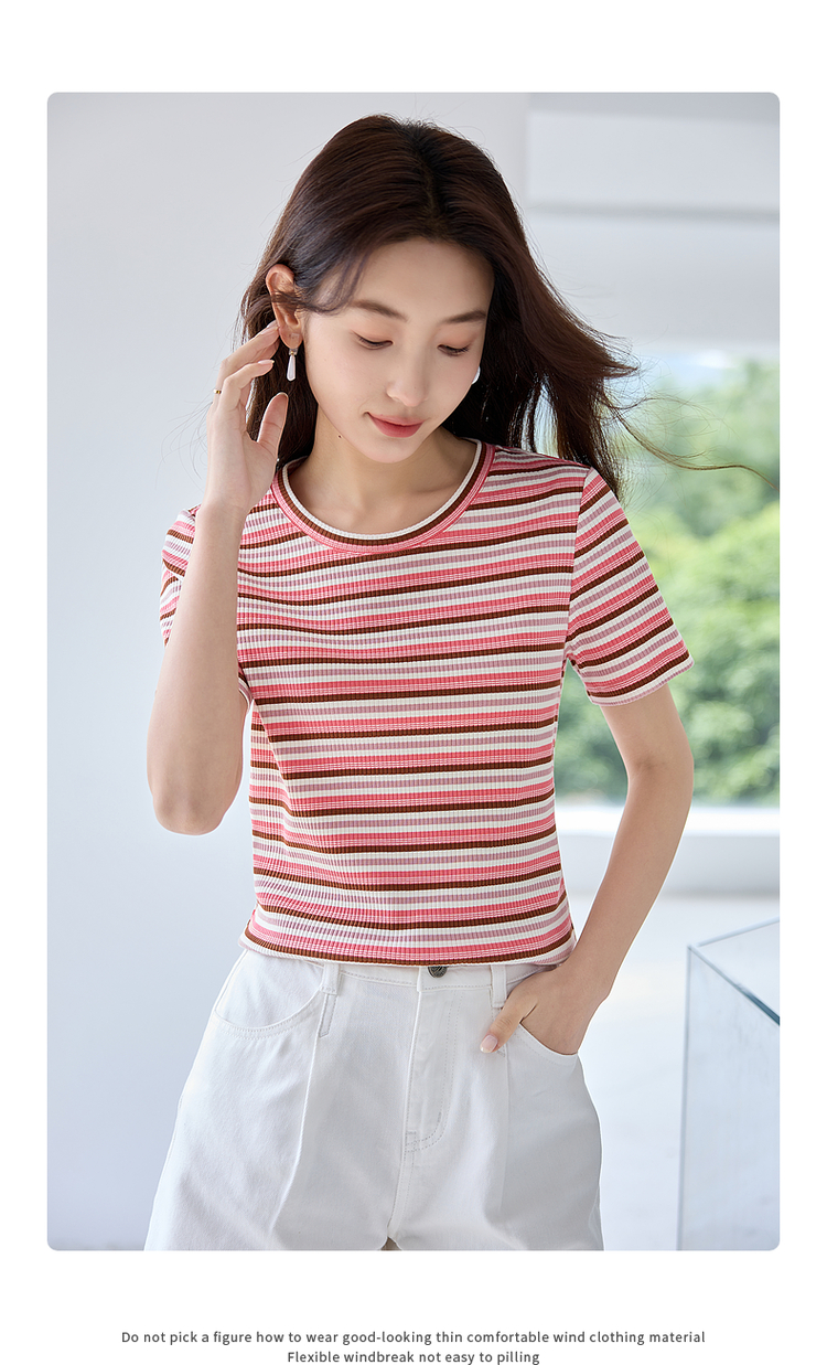 【专属特价】熙世界多巴胺条纹t恤女短袖2025夏季薄款针织体恤圆领正肩上衣