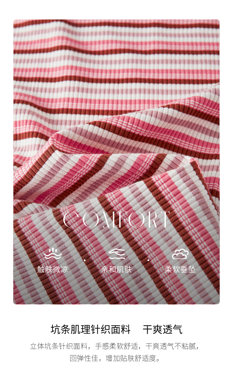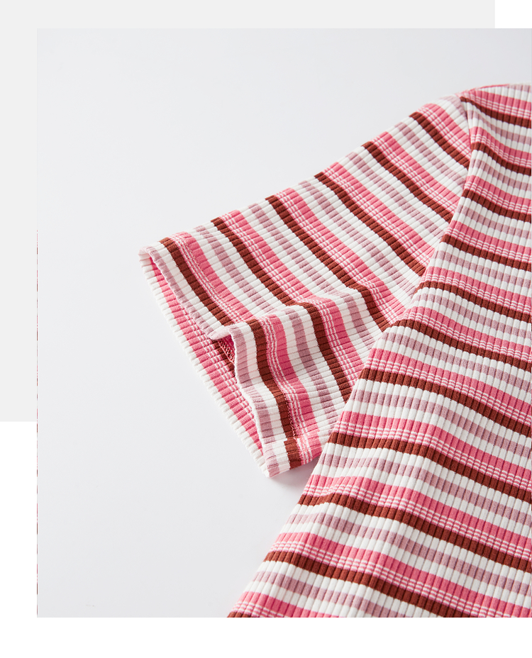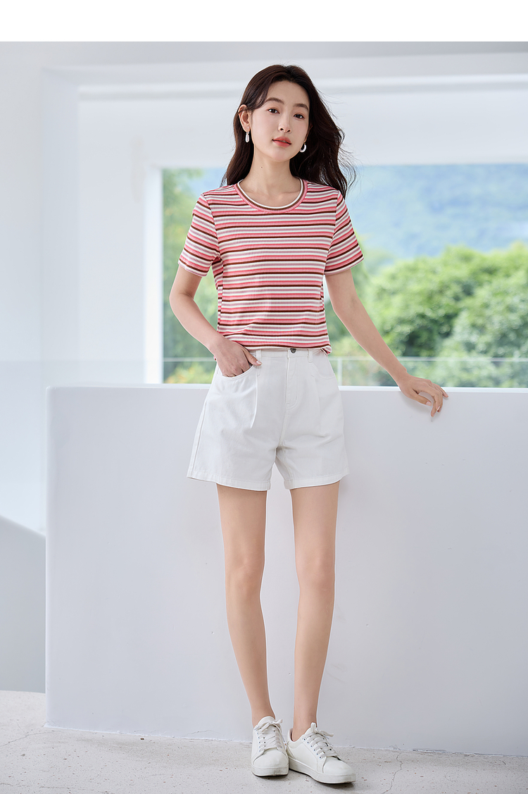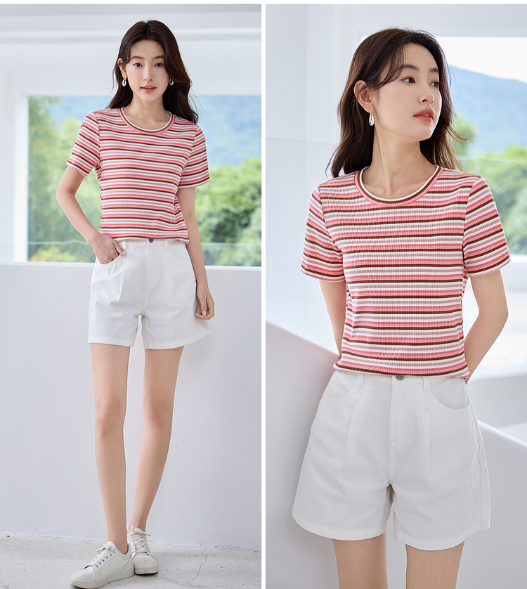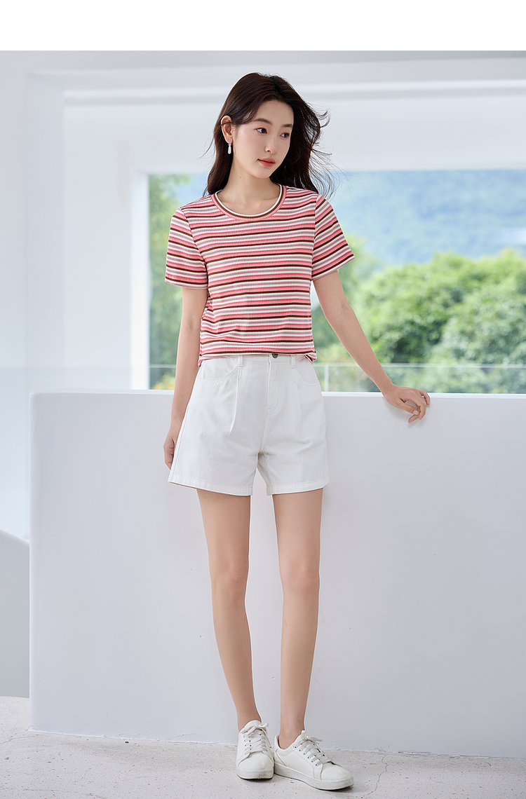 【专属特价】熙世界多巴胺条纹t恤女短袖2025夏季薄款针织体恤圆领正肩上衣