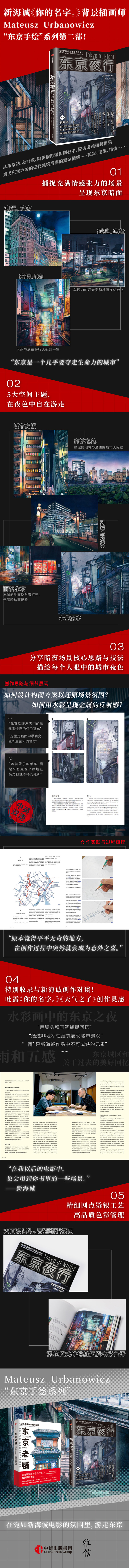 《东京夜行》的创作灵感来自作者在东京夜间的散步——东京夜晚的风景和白天截然不同,带给作者全新的体会。本书收录了作者创作的30幅东京夜景水彩画,夜景中光影表现更加丰富,也是作品展现的重点。此外,作者重点介绍了作品的创作过程,以及画作的特殊处理技巧。