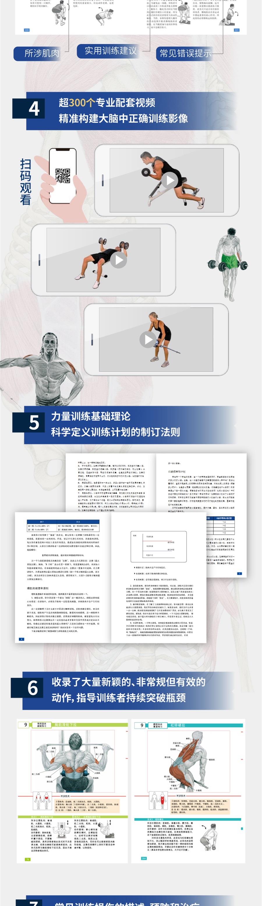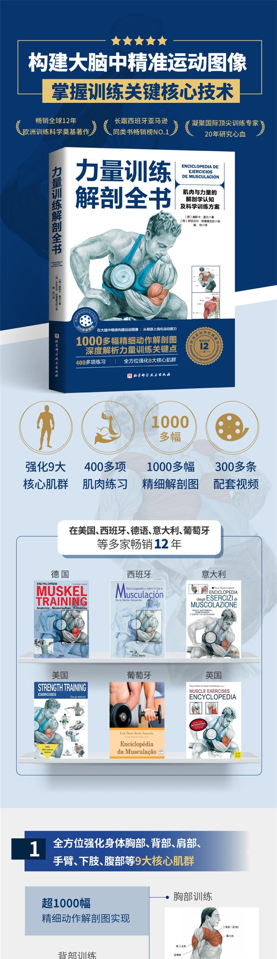 畅销全球12年 欧洲训练科学权威著作 长踞西班牙亚马逊同类书畅销榜NO.1 凝聚国际训练专家20年研究心血 全方位强化身体胸部、背部、肩部、手臂、下肢、腹部等9大核心肌群 超1000幅精细动作解剖图,实现精细化科学训练 400多项针对全身肌肉得训练动作,全面刺激每一块肌肉得增长 超300个专业配套视频,精准构建大脑中正确训练影像 详细介绍力量训练基础理论,科学定义训练计划的制订法则 收录了大量新颖的、非常规但有效的动作,指导训练者持续突破训练瓶颈 书中还有常见损伤的描述、预防和治疗 本书是经历全世界数万专业人士与健身爱好者检验的经典之作