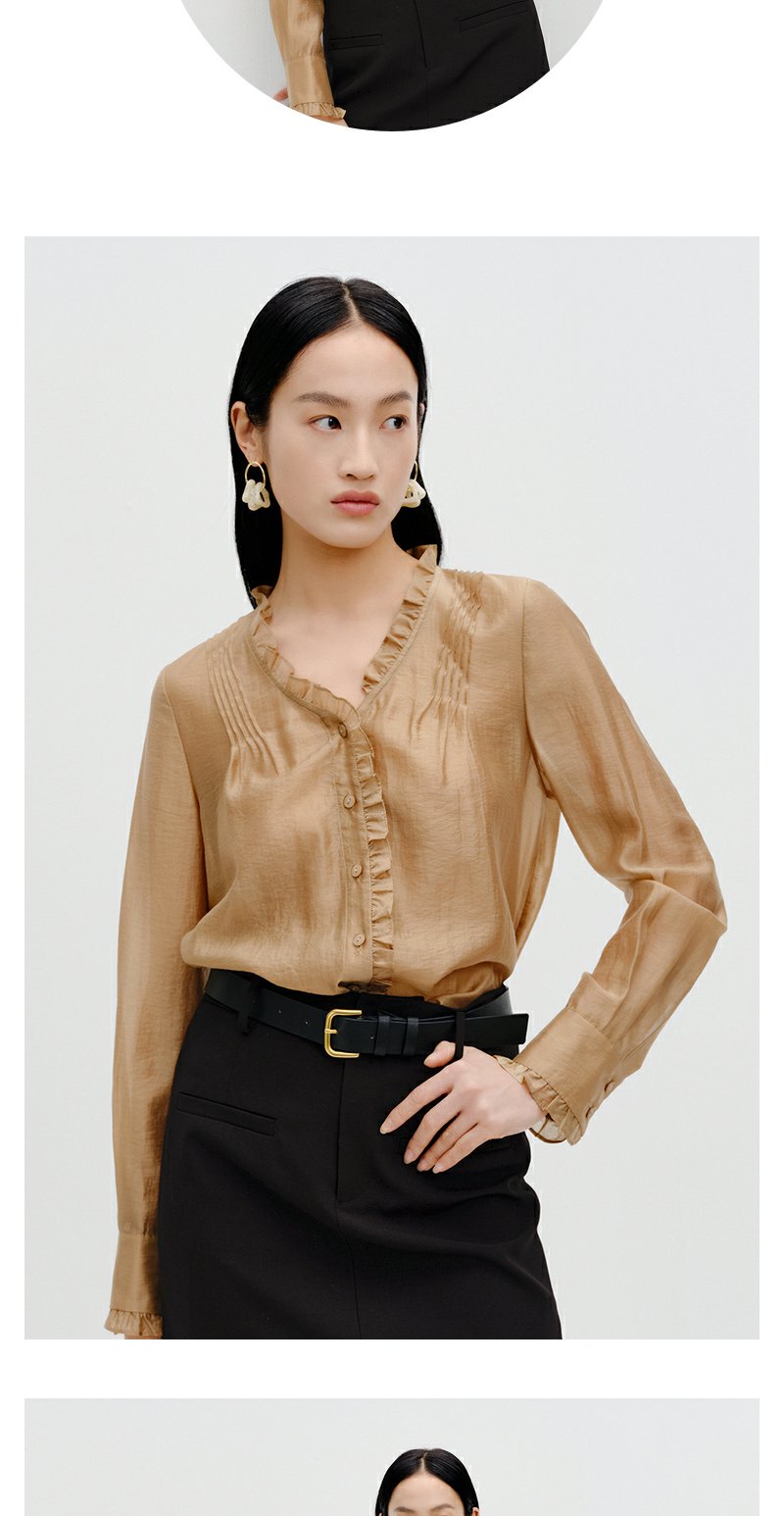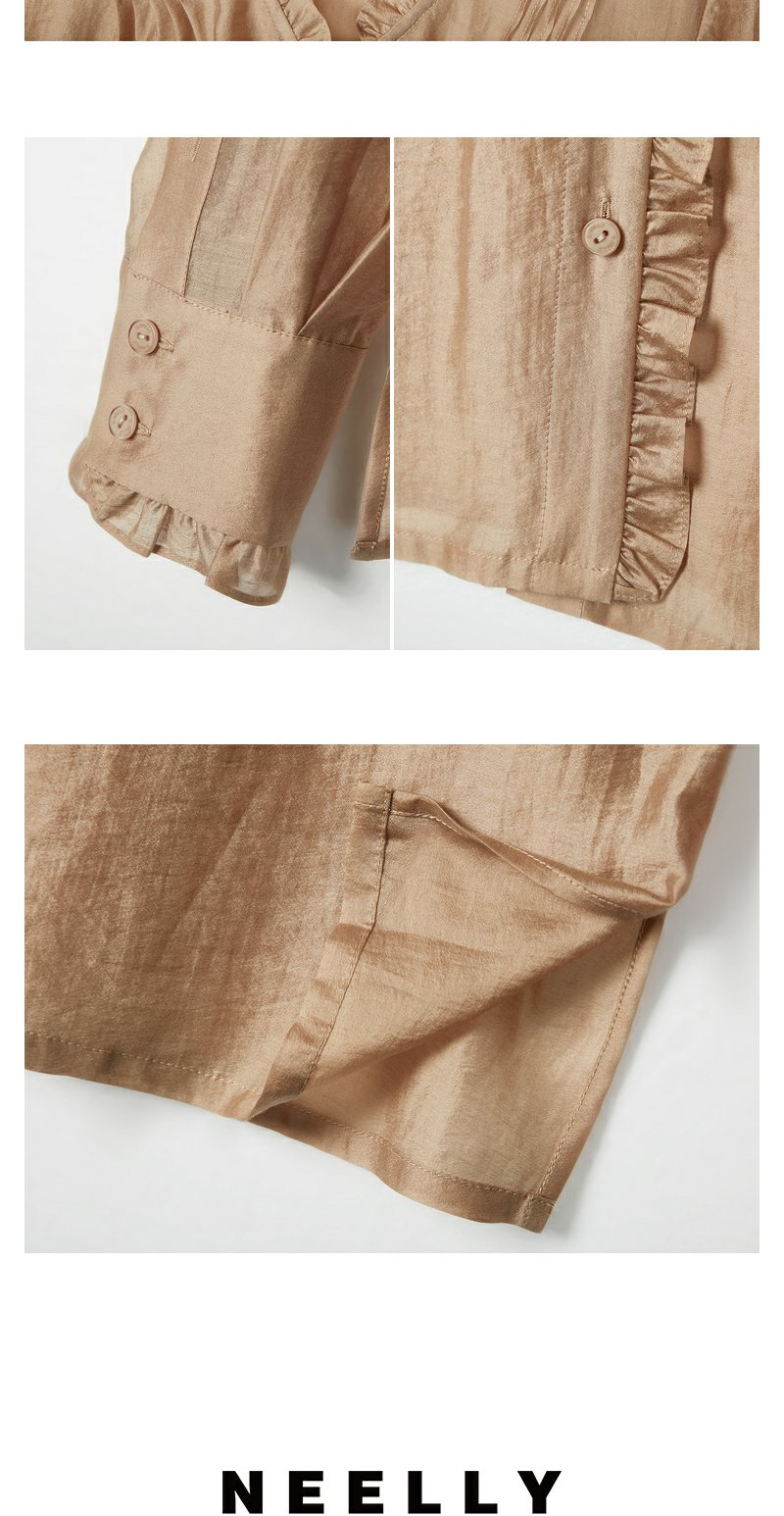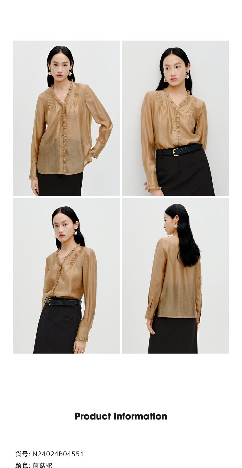 NEELLY纳俪商场同款天丝V领长袖衬衫女秋新品驼色小众设计感上衣N24024B04551