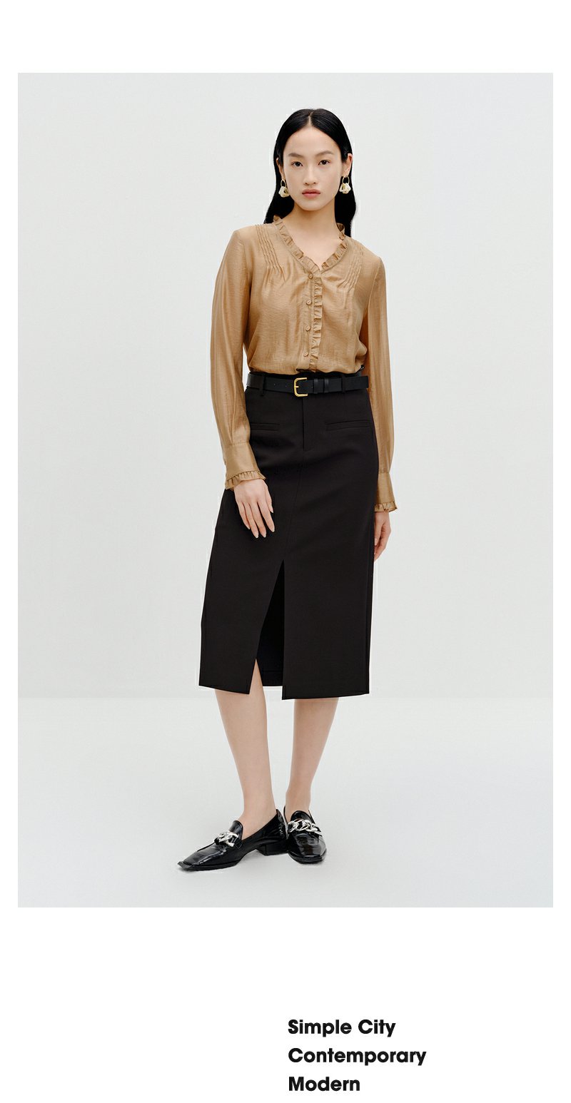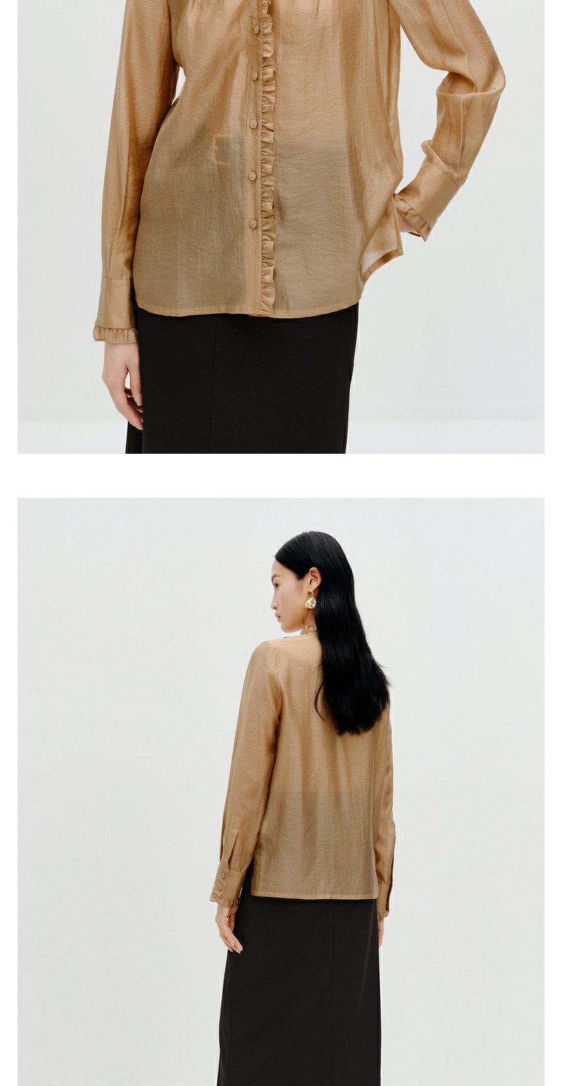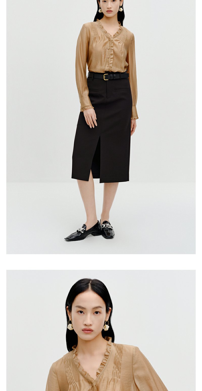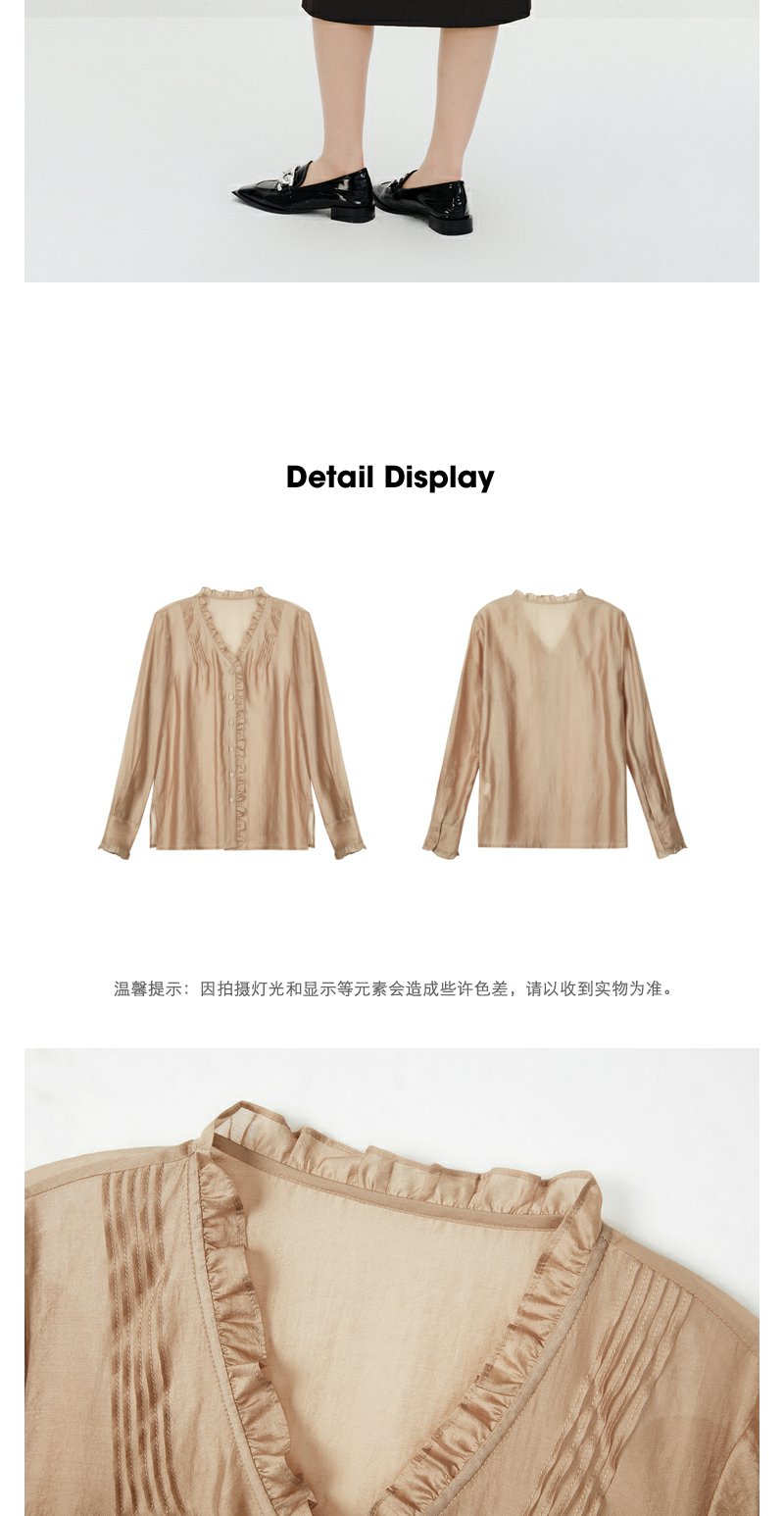 NEELLY纳俪商场同款天丝V领长袖衬衫女秋新品驼色小众设计感上衣N24024B04551